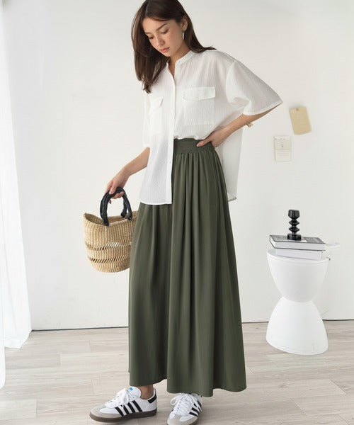 軽やかなレーヨン素材を使用したウエストギャザーのフレアワイドパンツ。