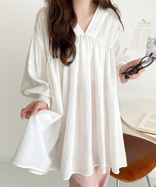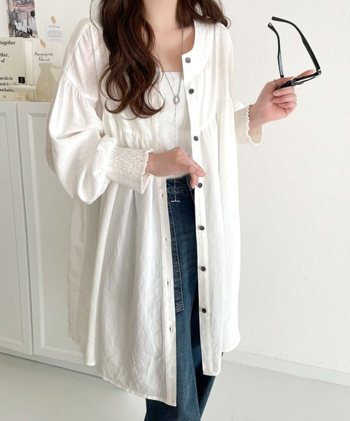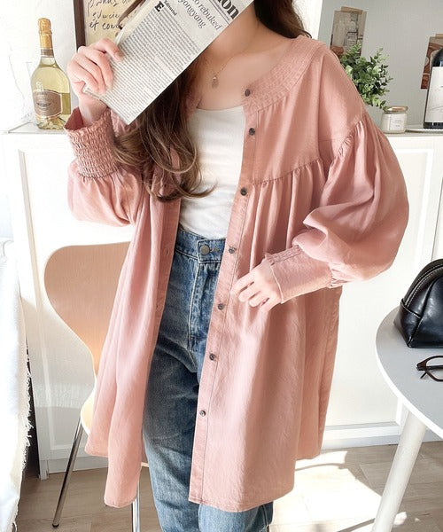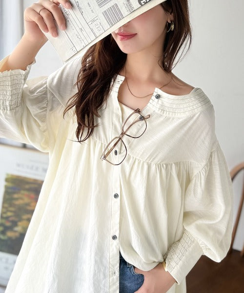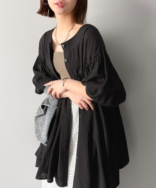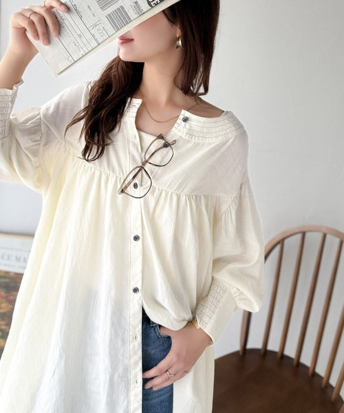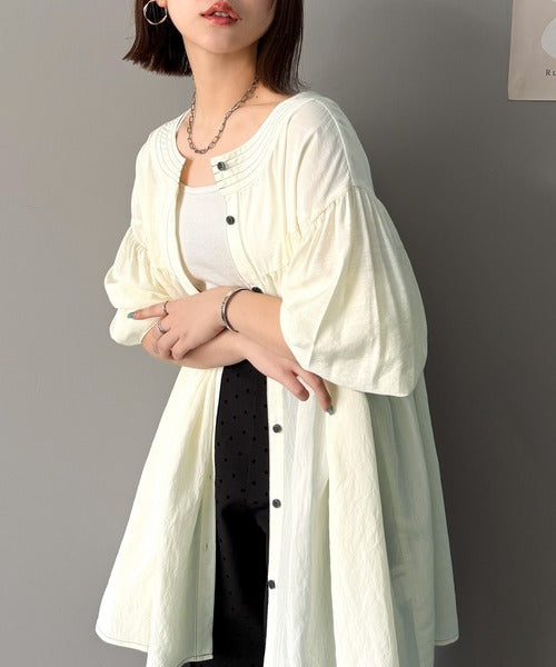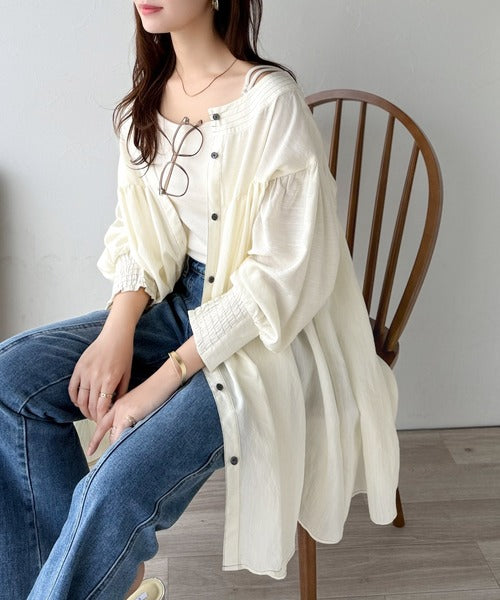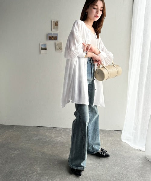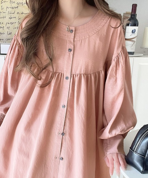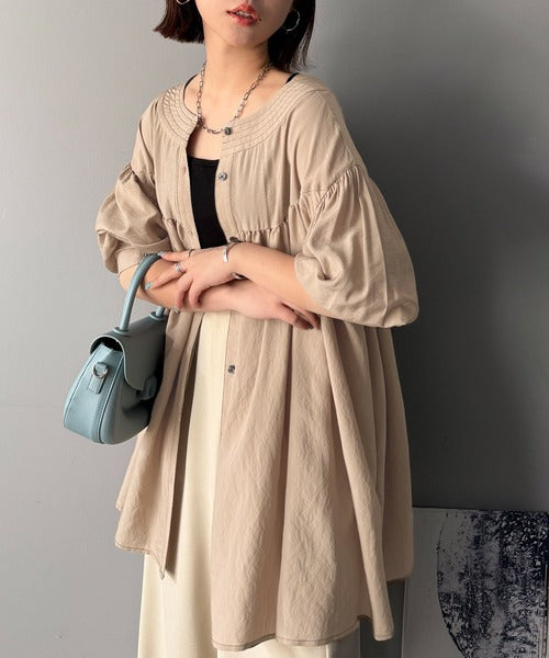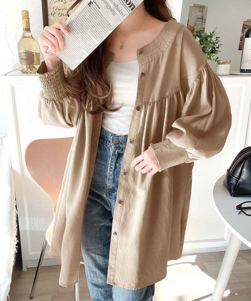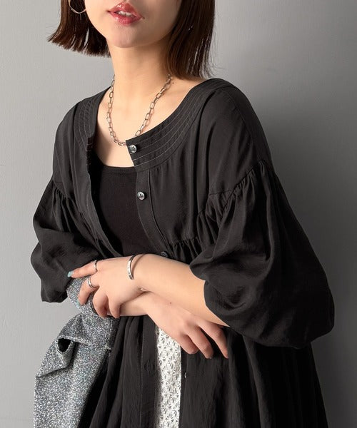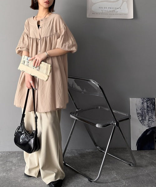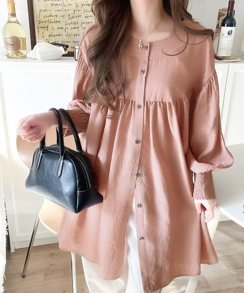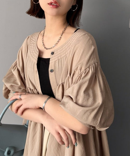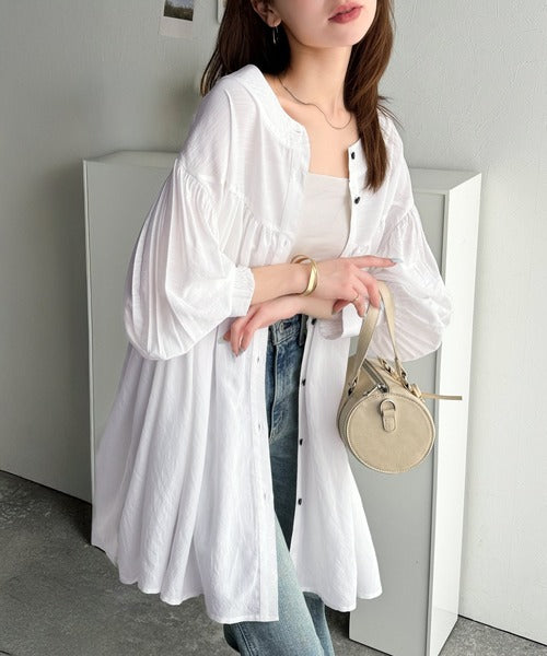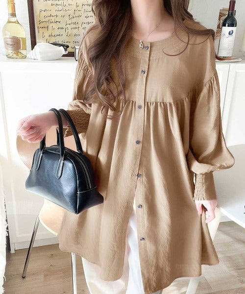 ふんわりとしたボリューム袖が施され、フェミニンな印象を引き立てます。