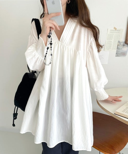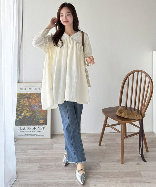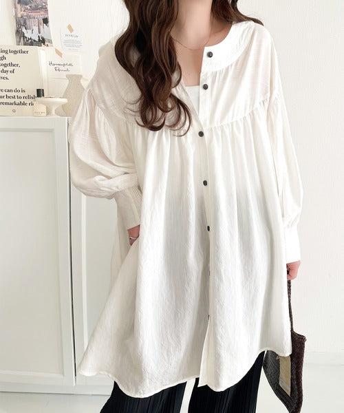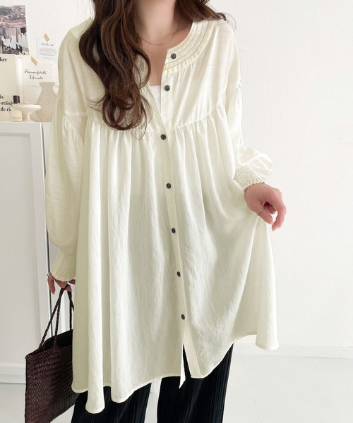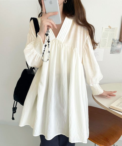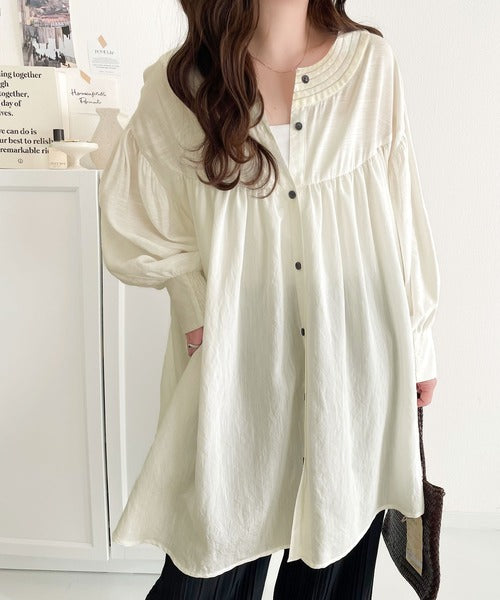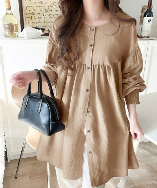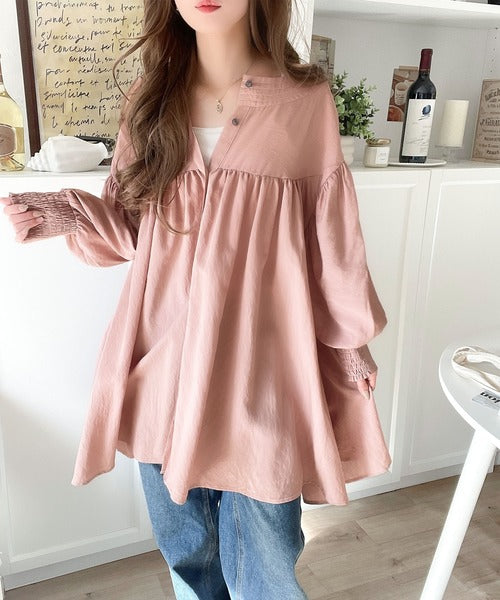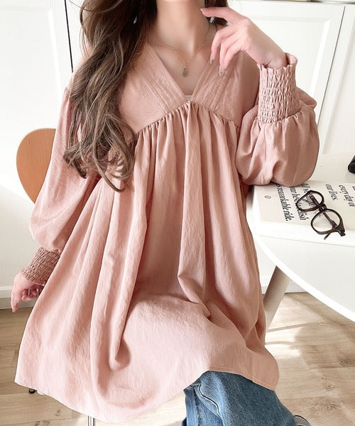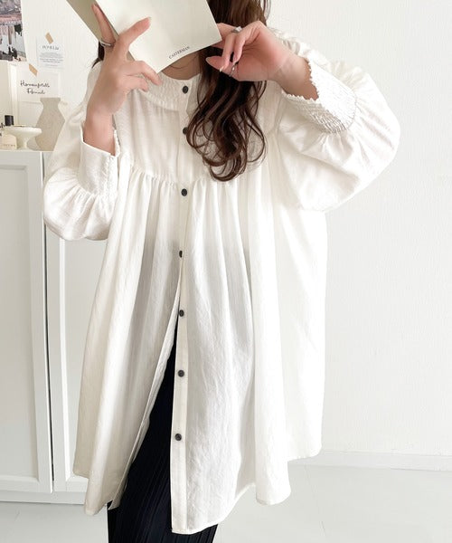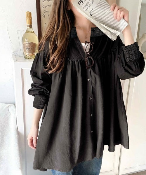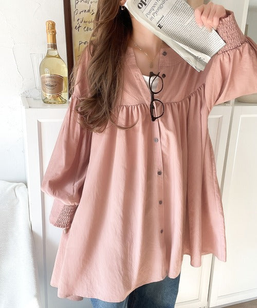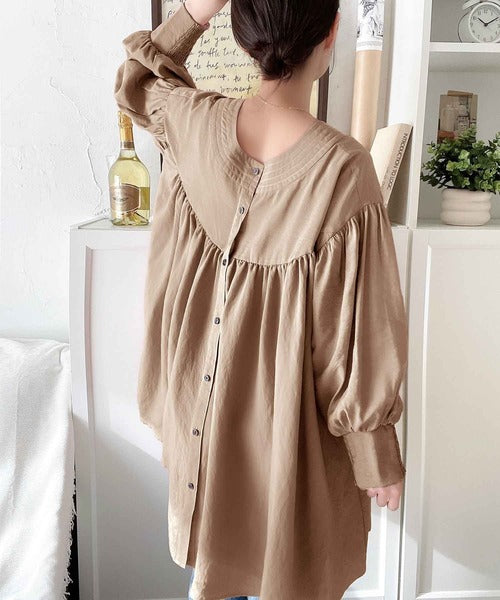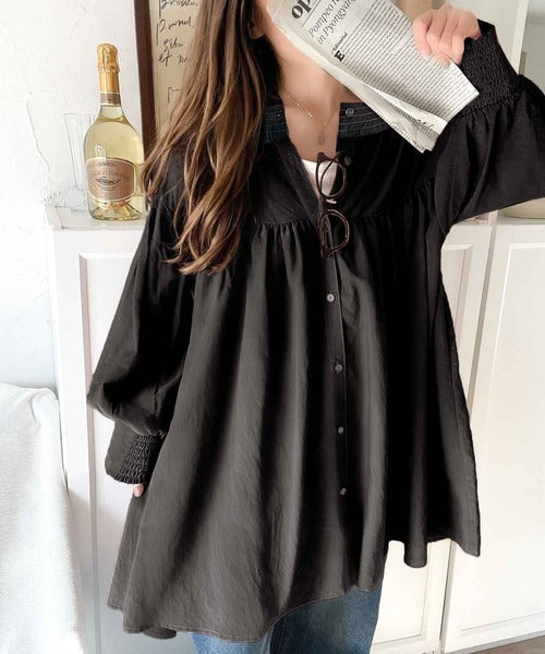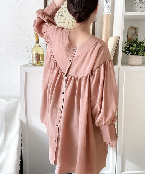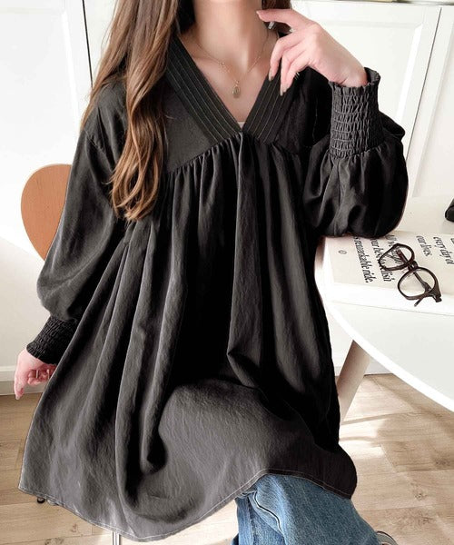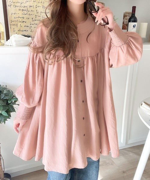 可愛さとトレンド感の両立。前後2WAY配色ステッチボリュームギャザーチュニックブラウス(長袖) ce1260376