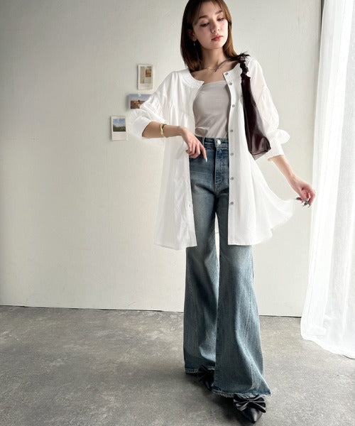 その日の気分に合わせてデニムやフレアパンツを合わせてもOK◎
