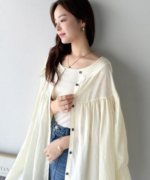 一枚で着ても存在感のあるブラウスですが、カーデのように羽織ってみたり、