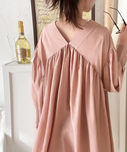 胸元辺りから裾にかけて広がる可愛らしい切替ギャザーと