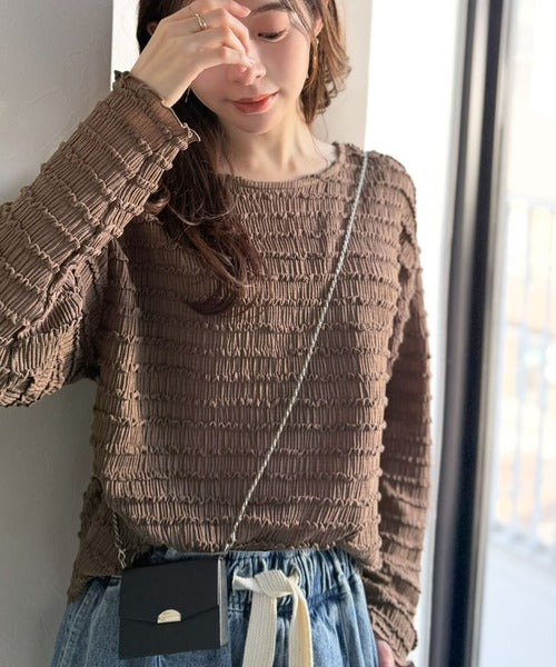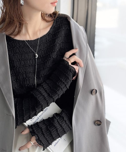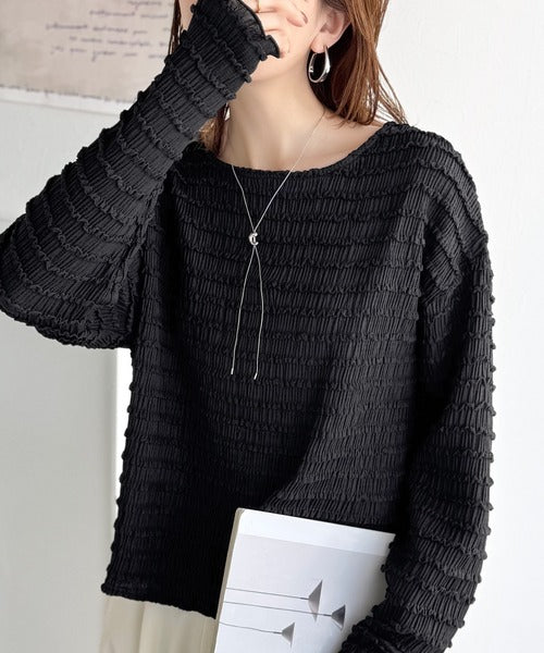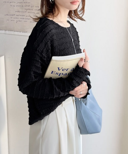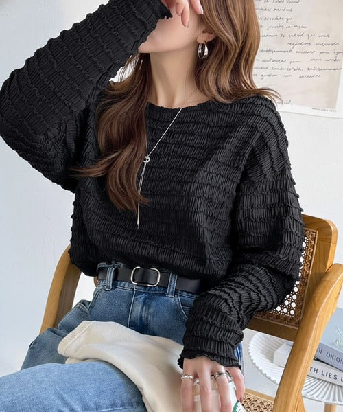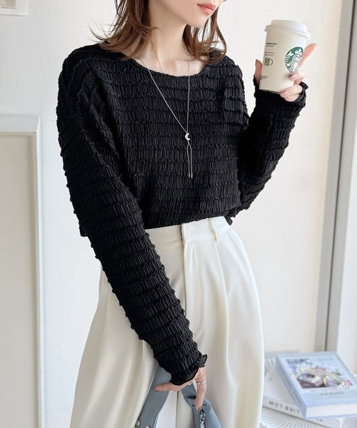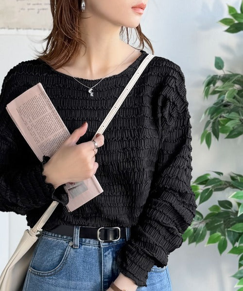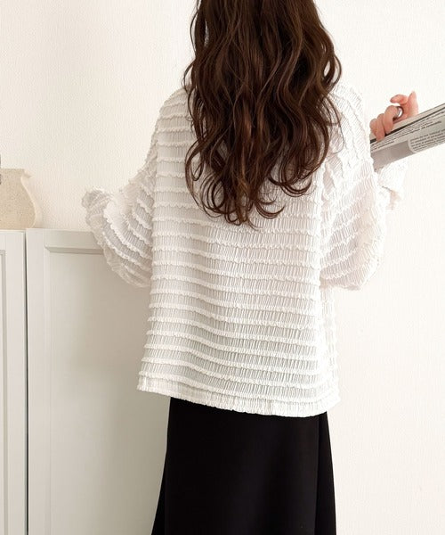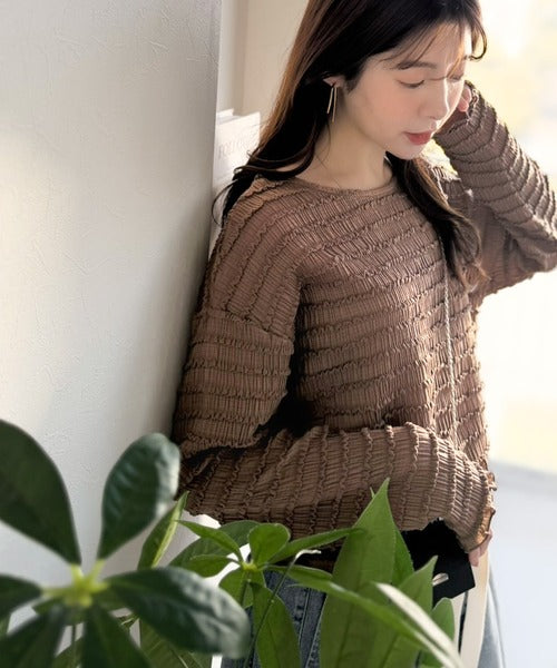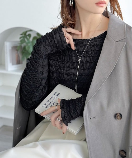 立体的なシャーリングタックが目を引く、存在感たっぷりの長袖ブラウス。