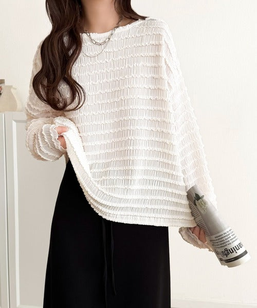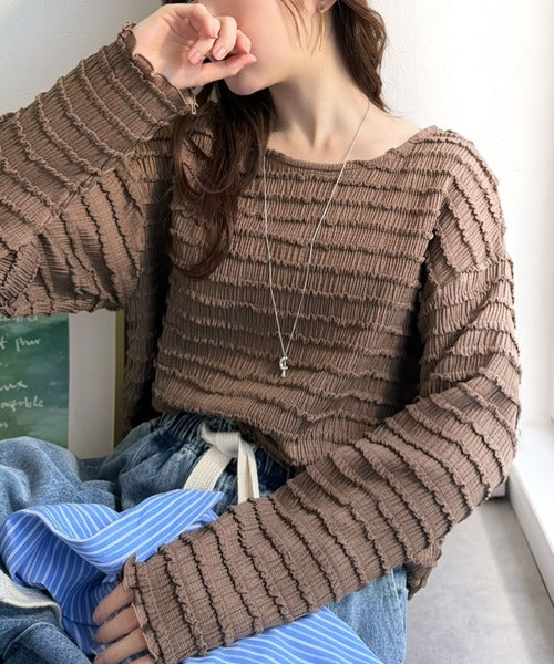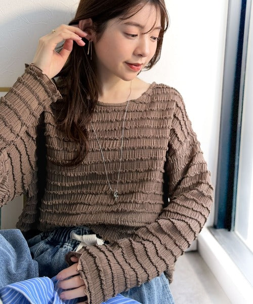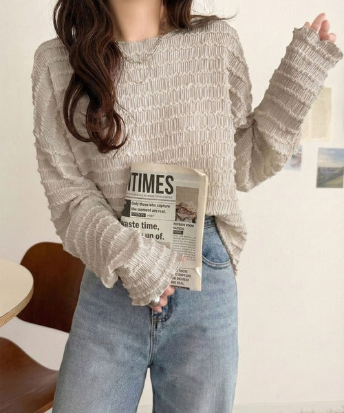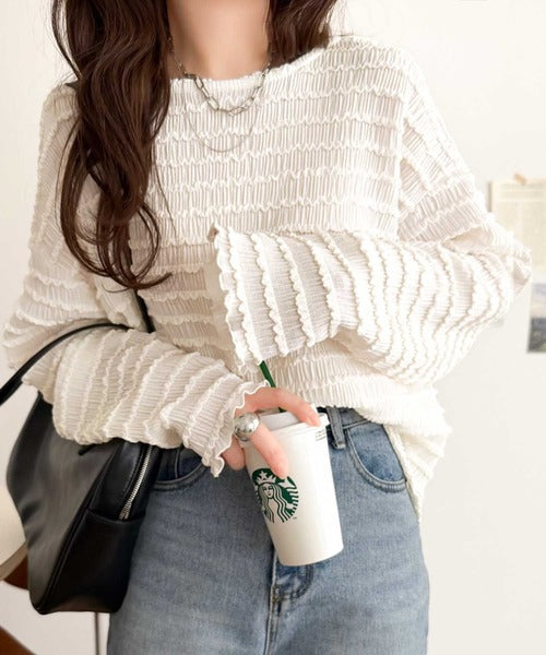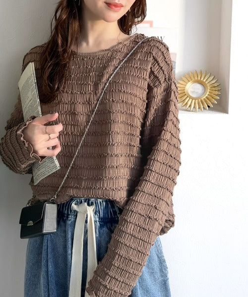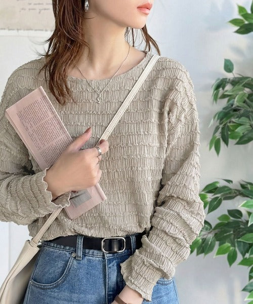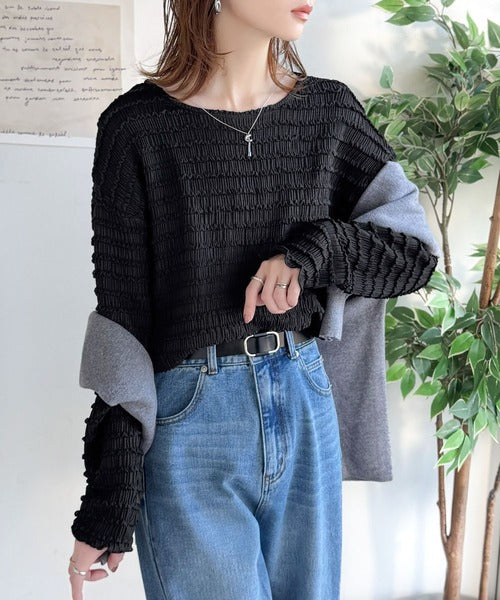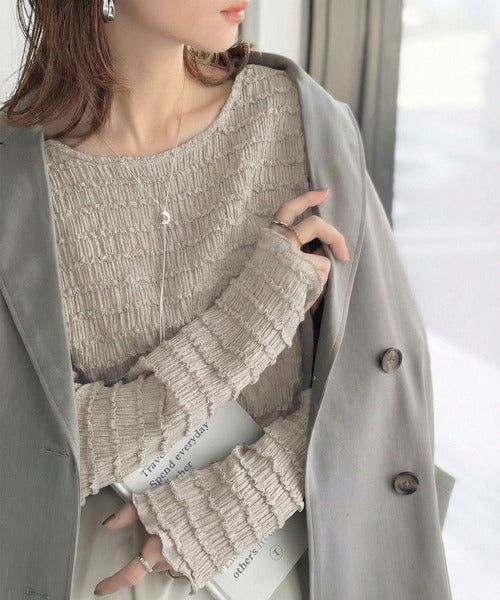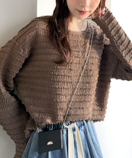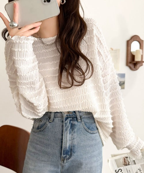 立体的なシャーリングタックが目を引く、存在感たっぷりの長袖ブラウス。