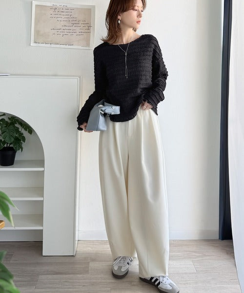 一枚で存在感のあるシャーリングタックトップス。