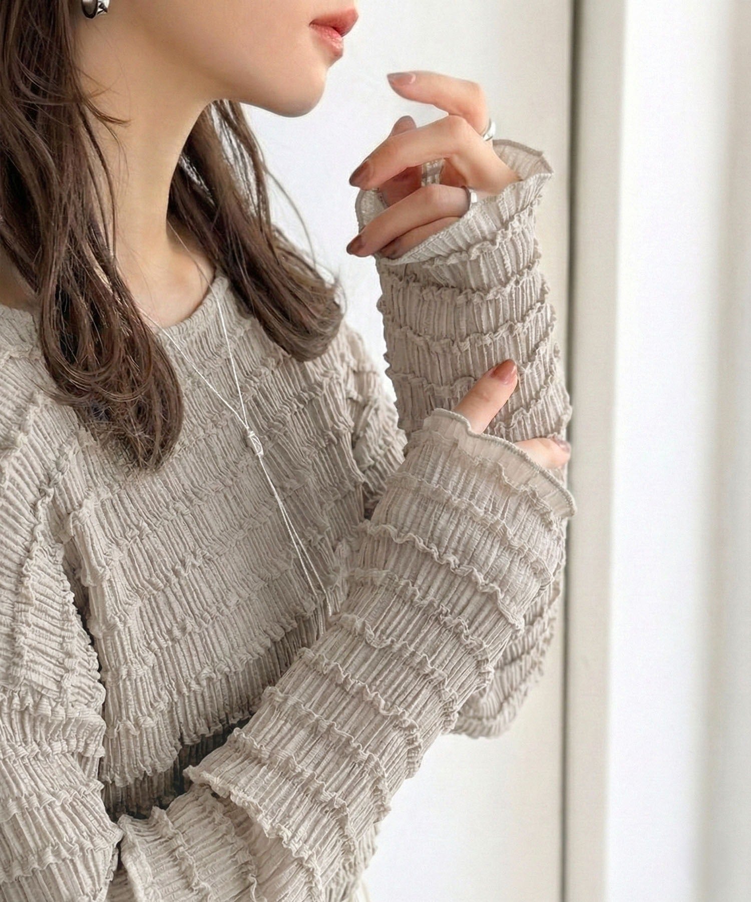 袖にあしらったメロウが大人フェミニンを格上げ。
