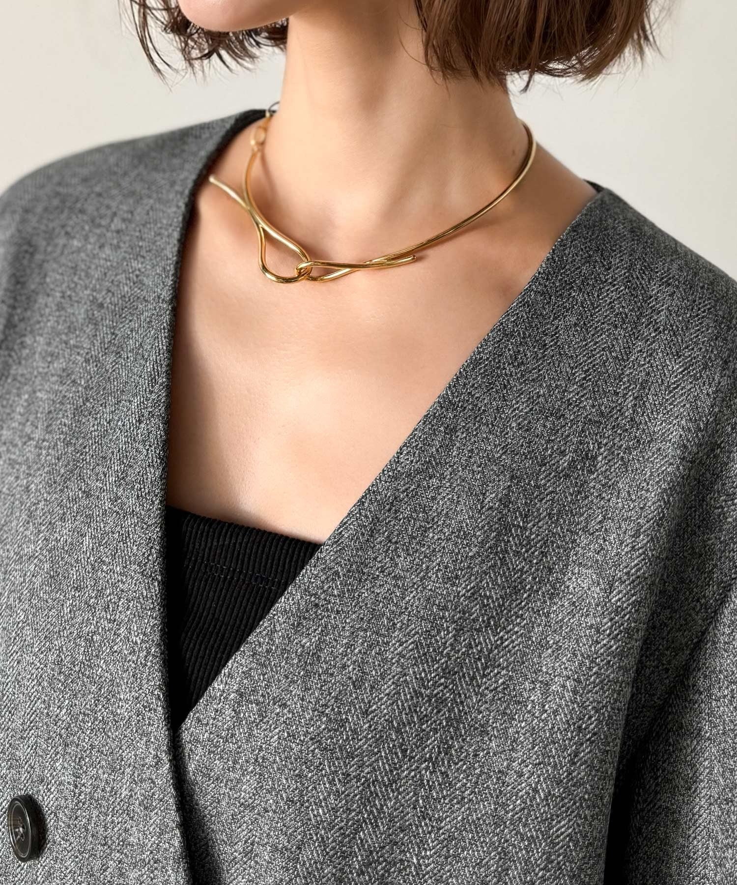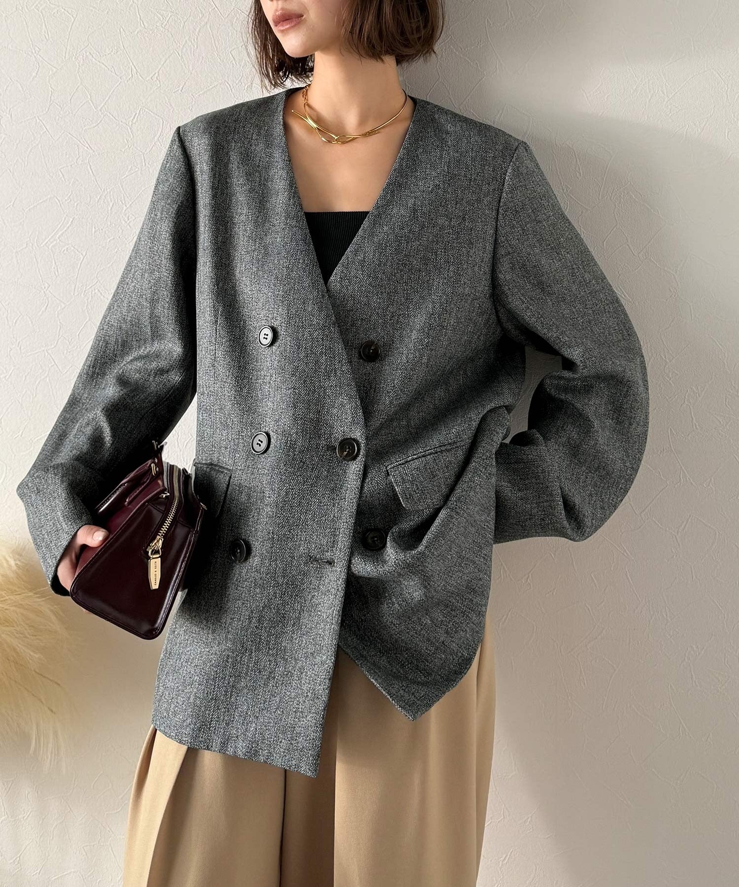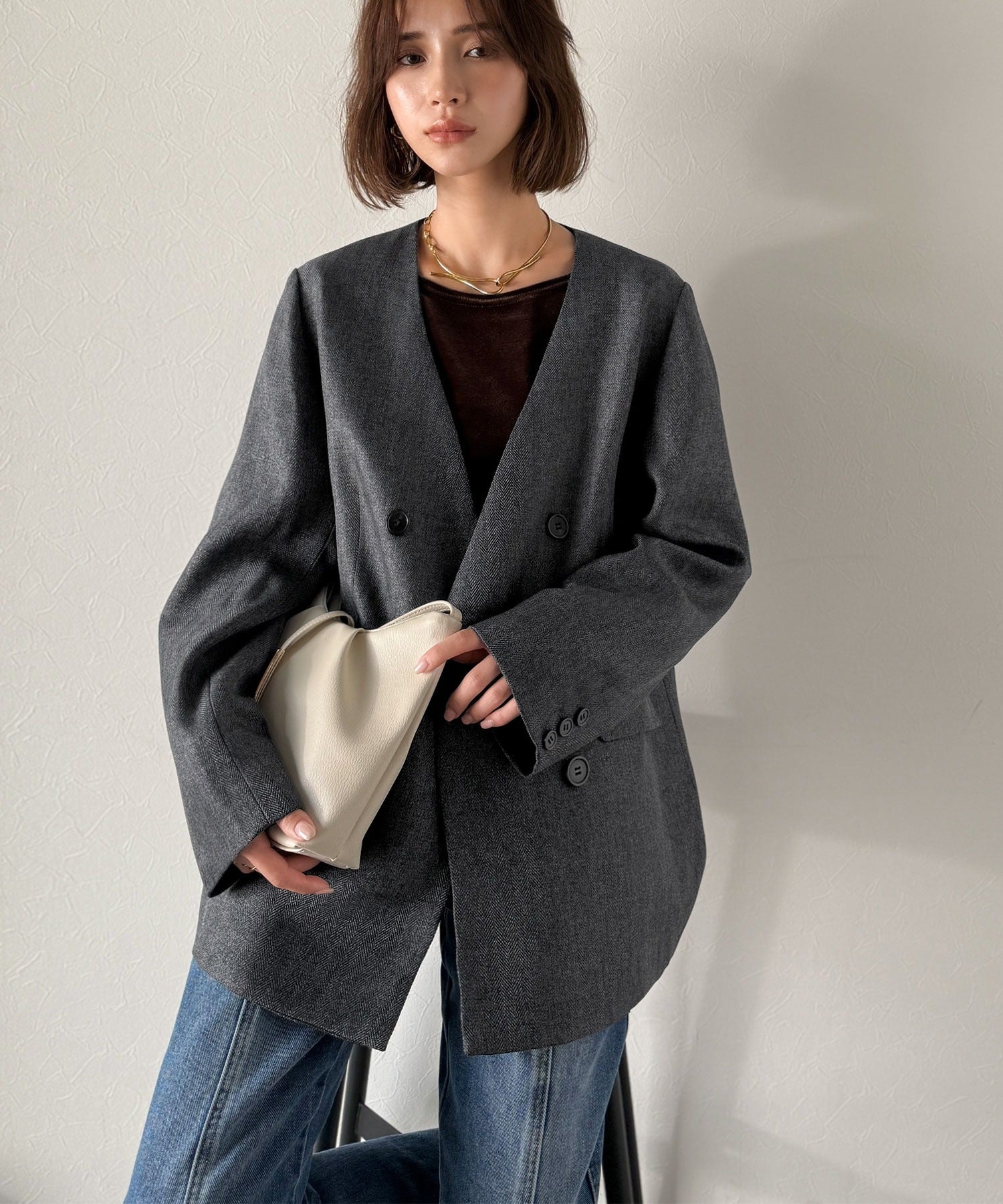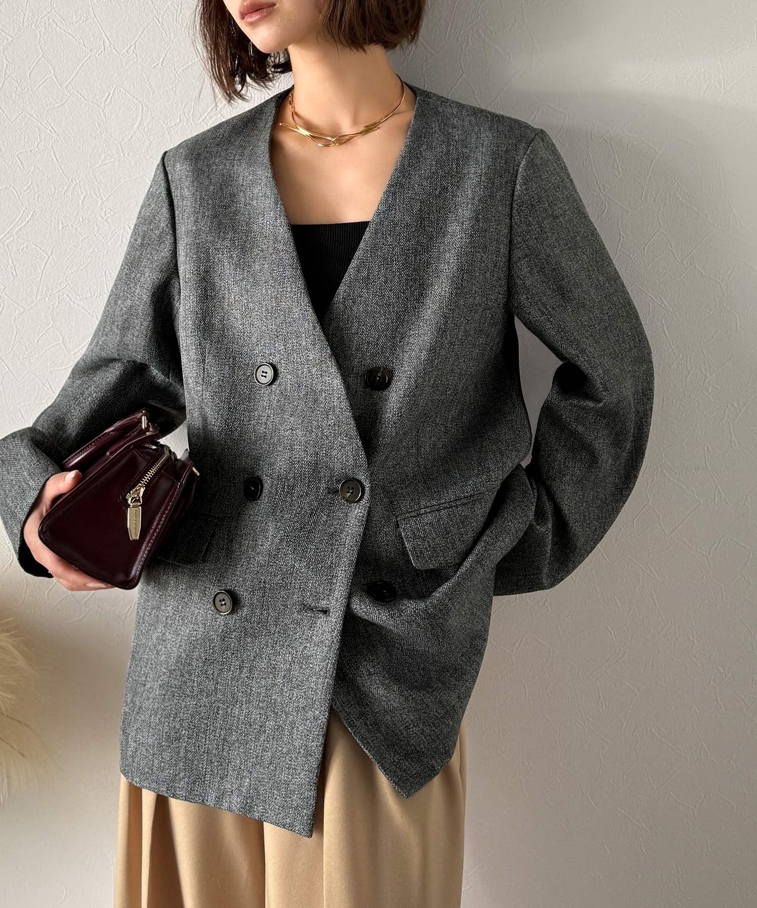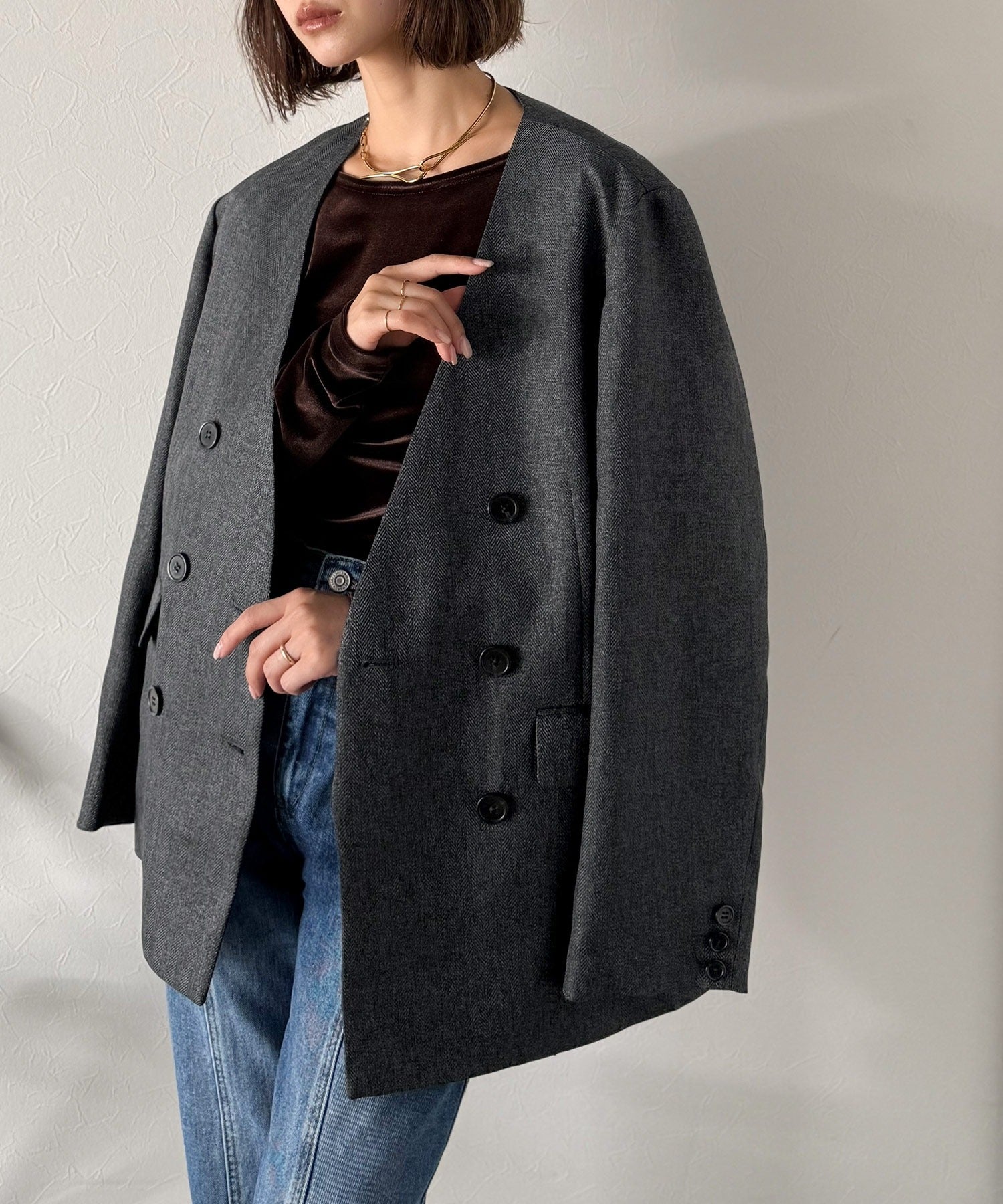 すっきりと開いたネックラインと、縦に並ぶ3段ボタンがポイントのノーカラージャケット。