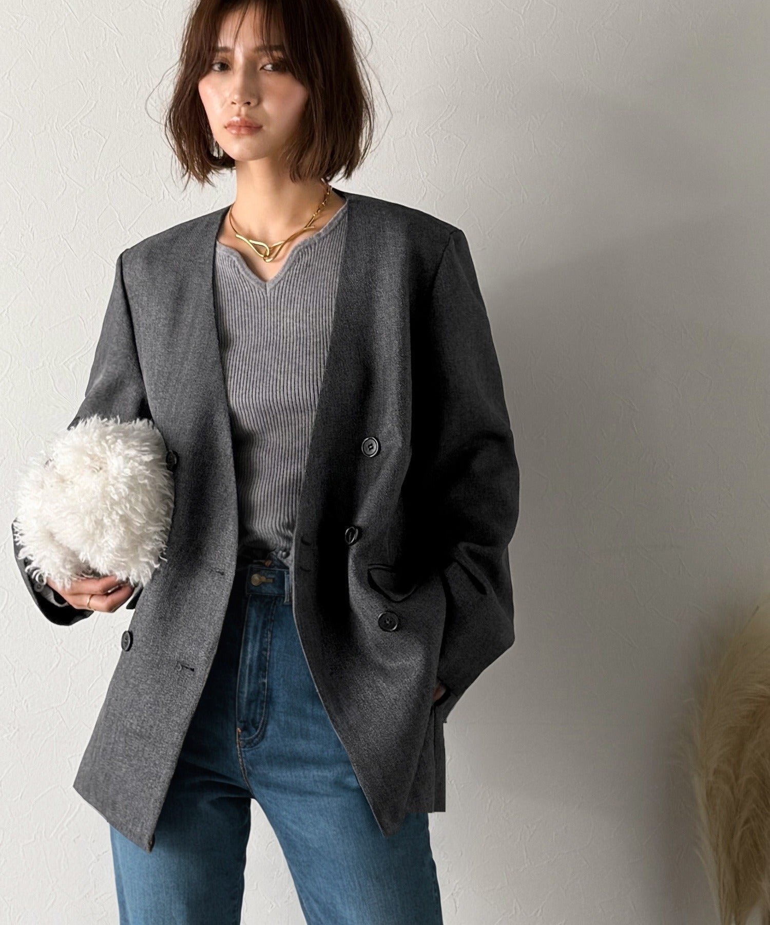 顔まわりをシャープに見せてくれるノーカラーのデザインに、縦ラインを強調する3段ボタンがアクセントになったジャケットです。