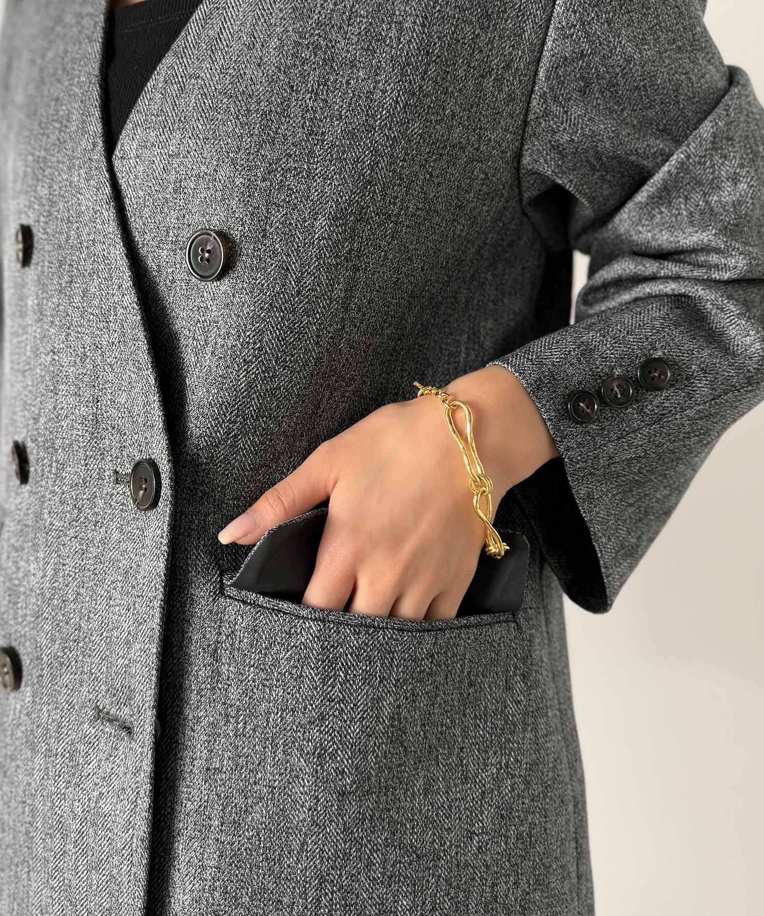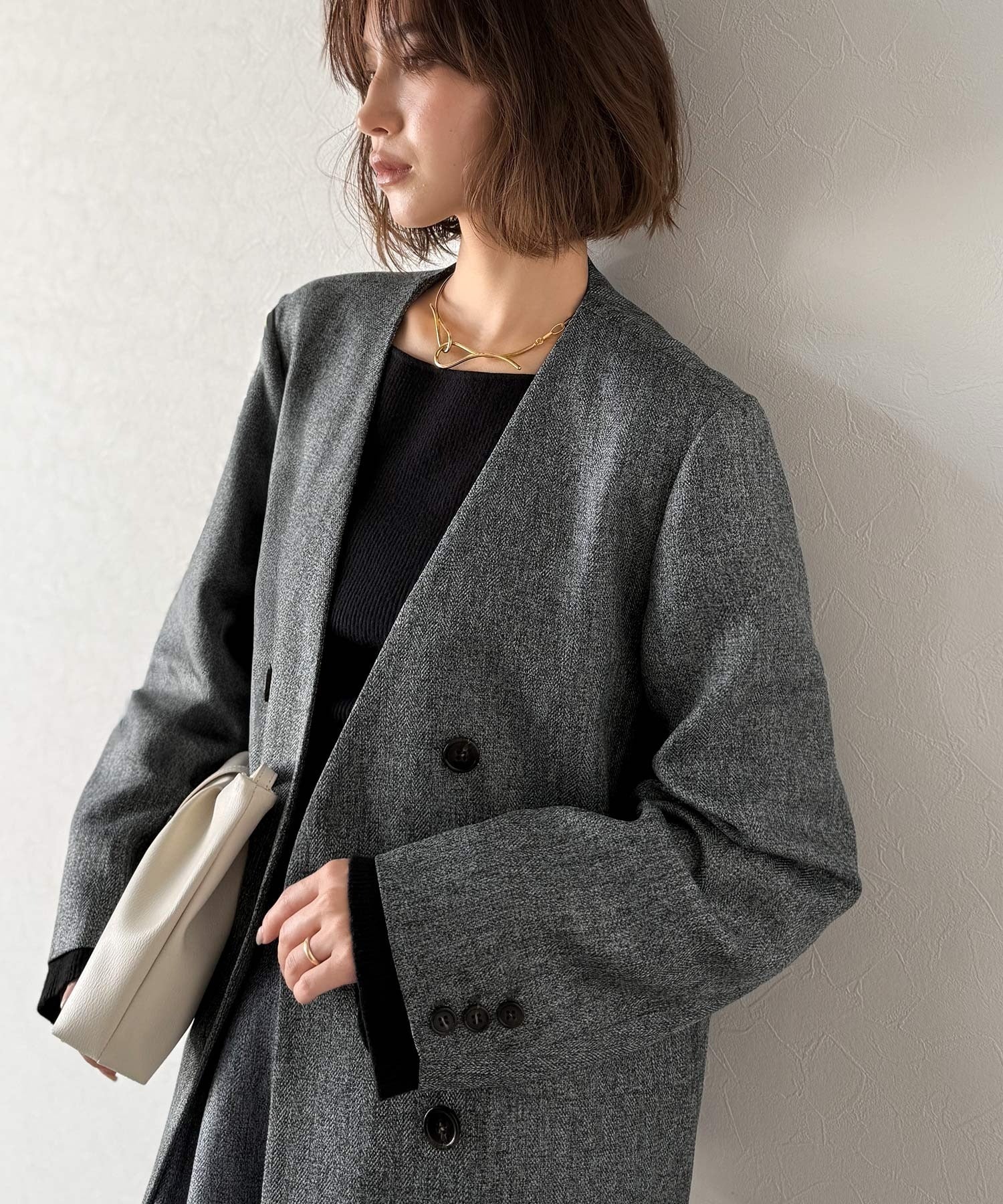 素材はウール調のメランジヘリンボーンで、表情豊かな奥行きを感じられる仕上がり。