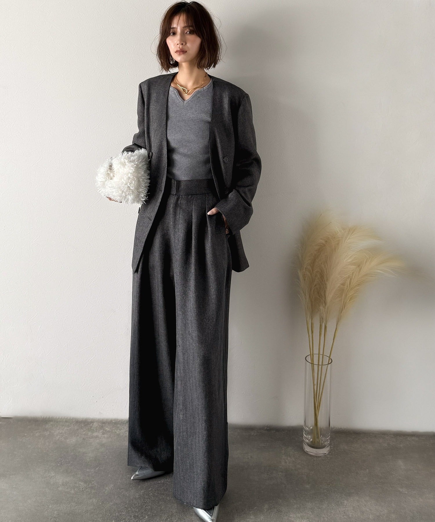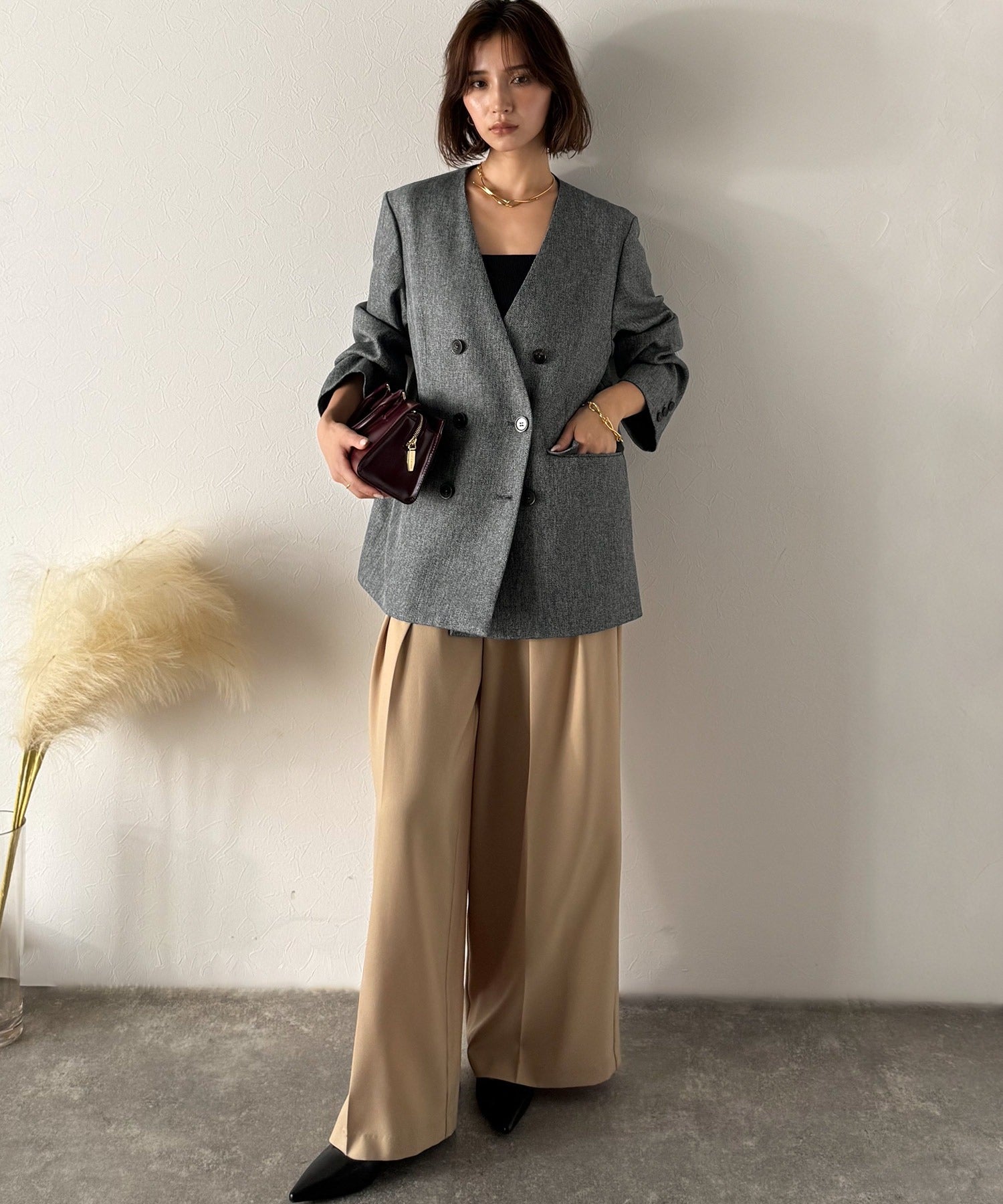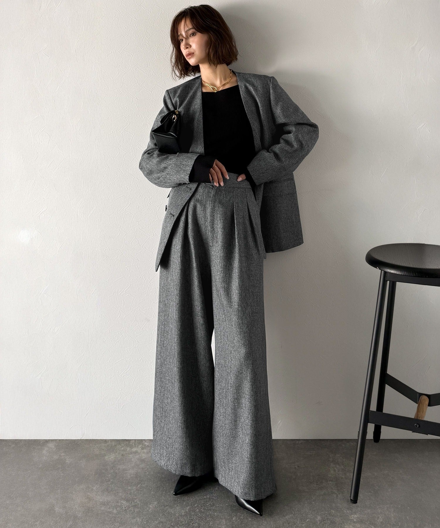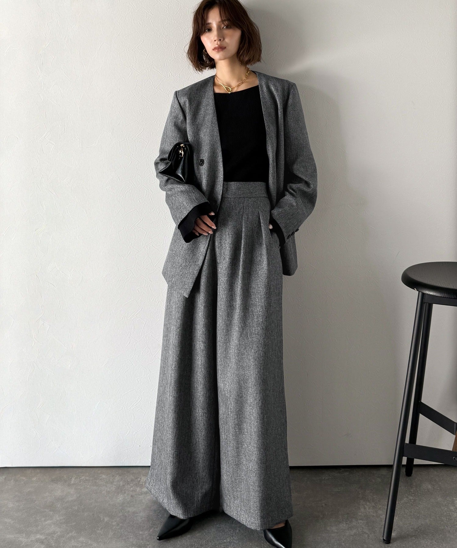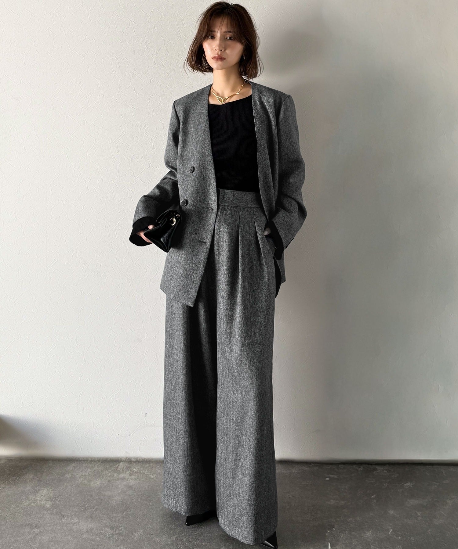 同素材のタックワイドパンツと合わせれば、セットアップで洗練された着こなしが完成します。