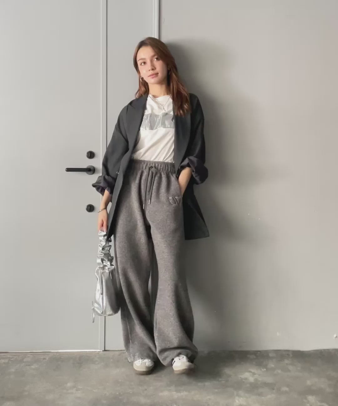 肌寒い季節には、スウェットやニットを合わせて、リラックス感のあるカジュアルコーデに。
