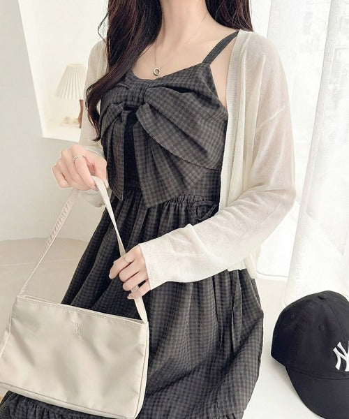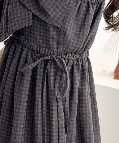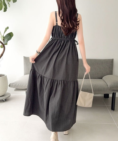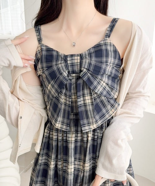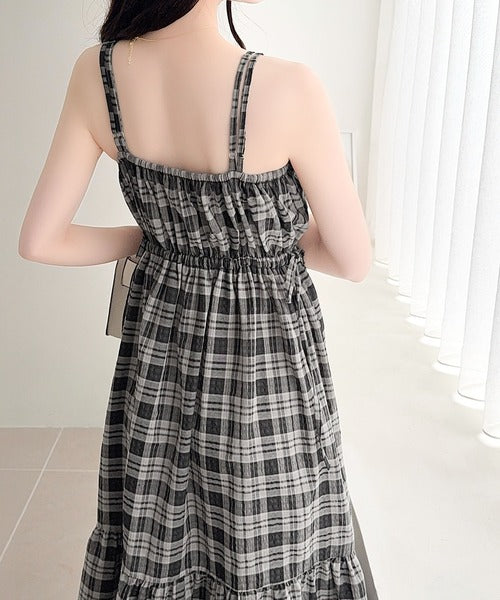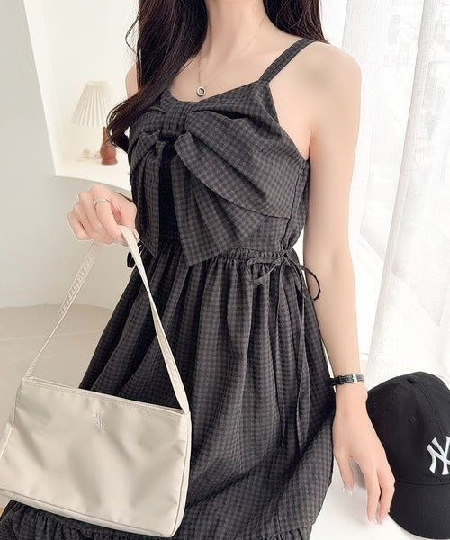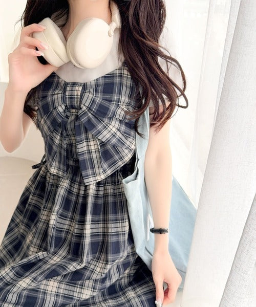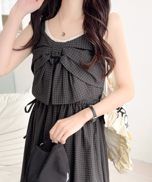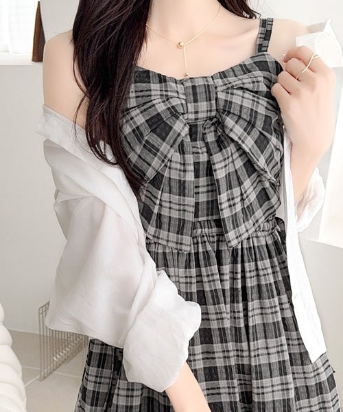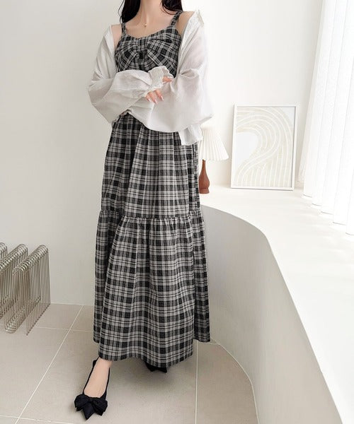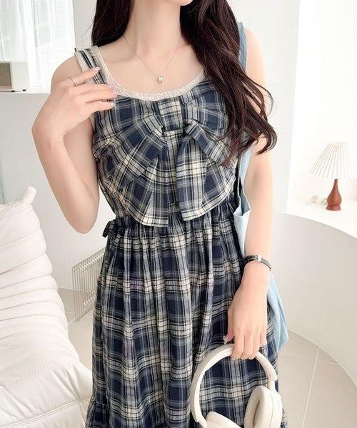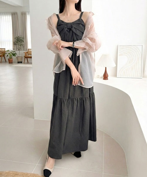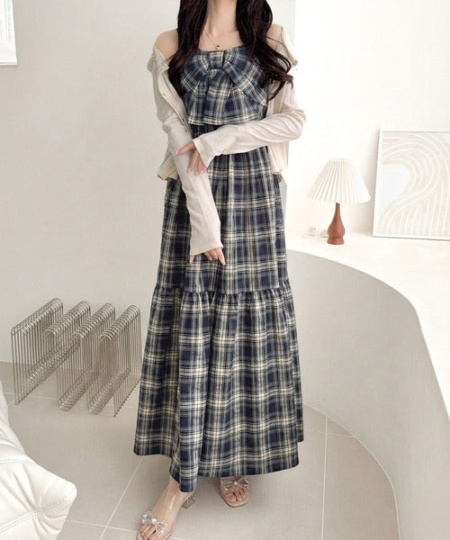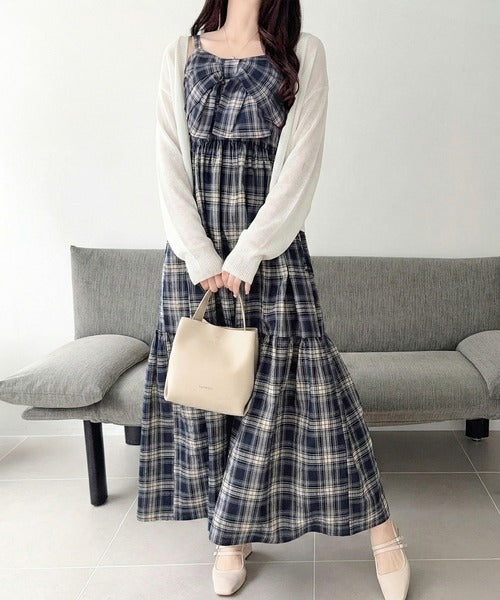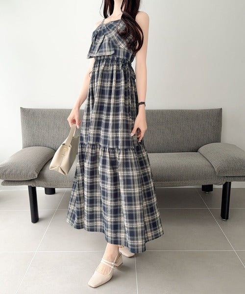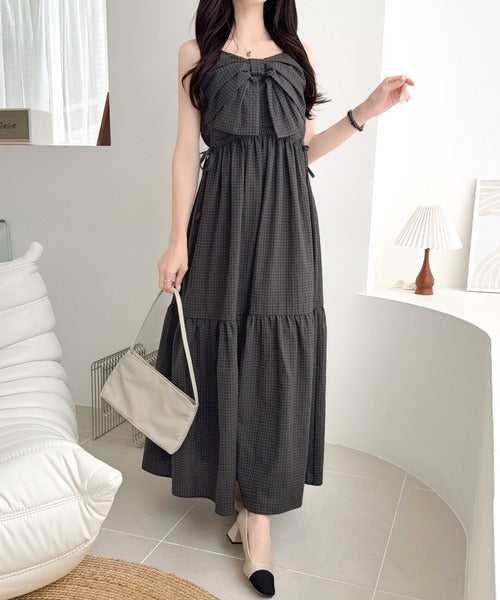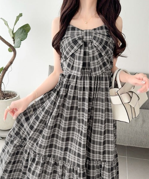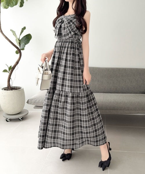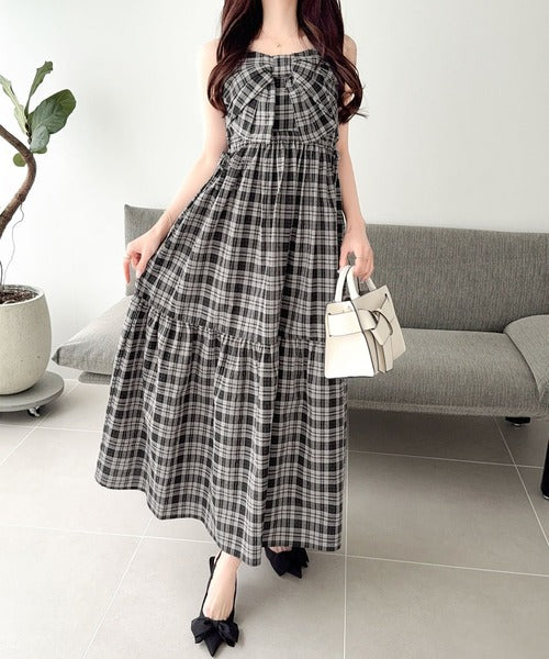 【mily bilet】春夏に映える♪ビッグリボンチェック柄ティアードワンピース(ロング丈) mi1019121