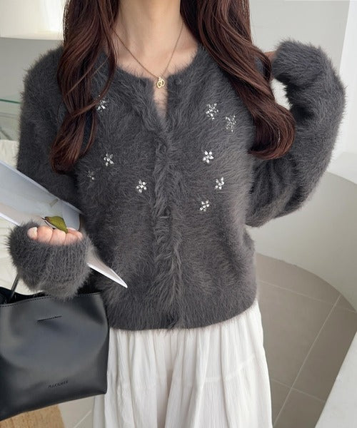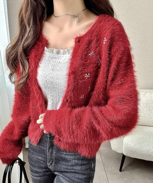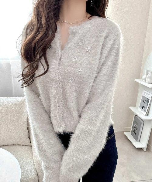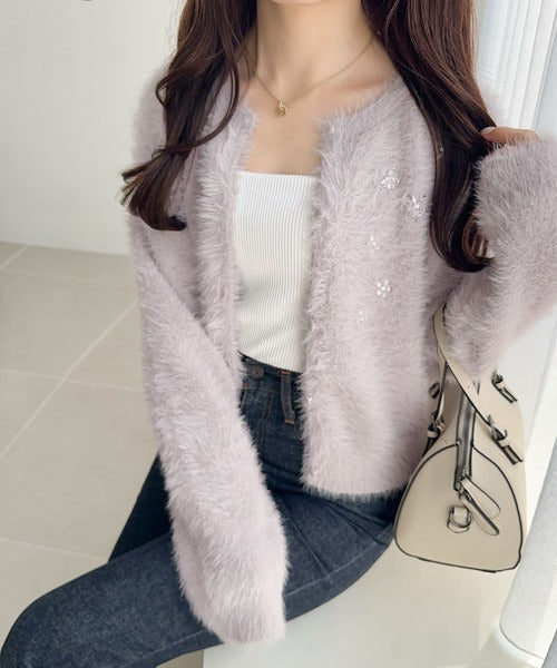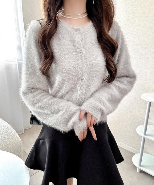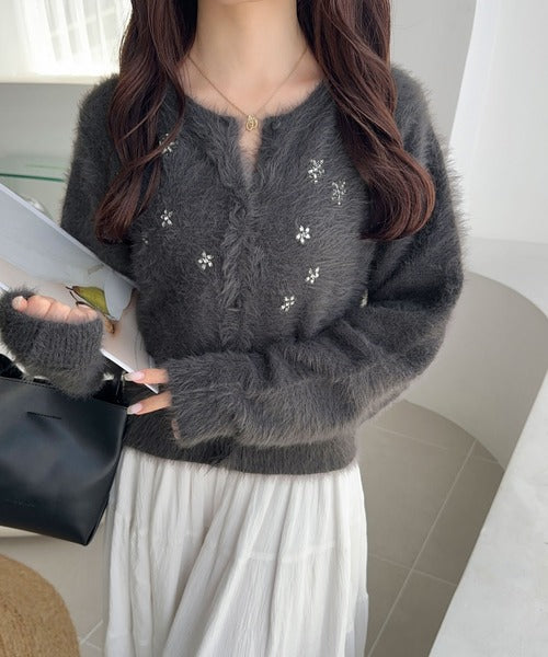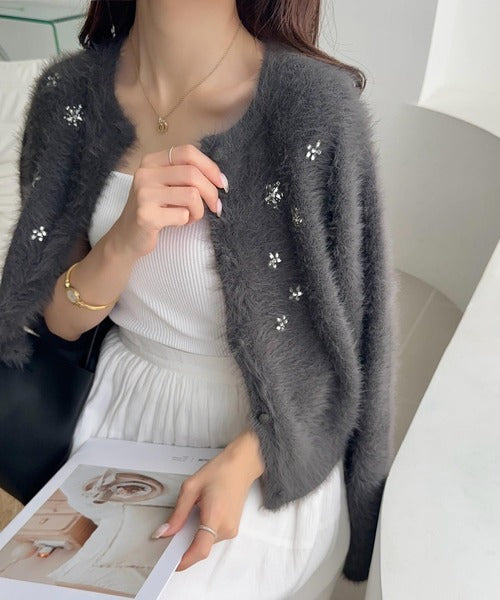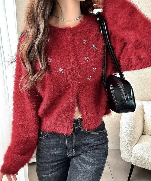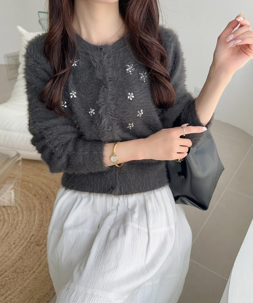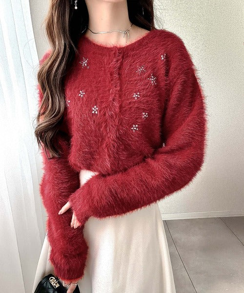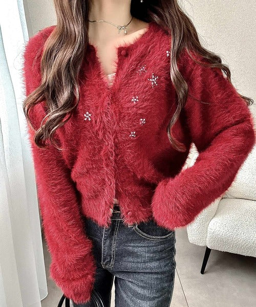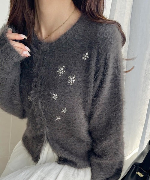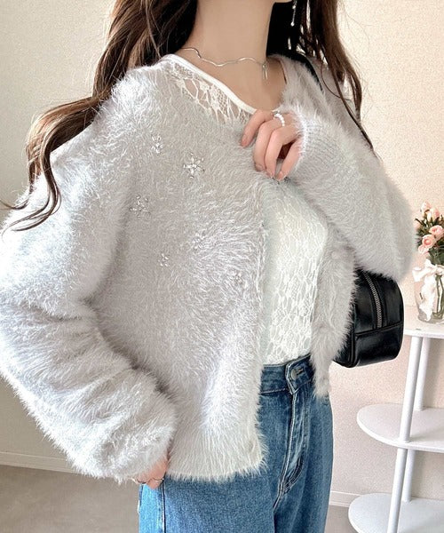 冬らしいシャギー素材とビジューが目を惹くカーディガン。