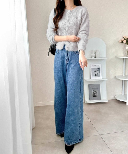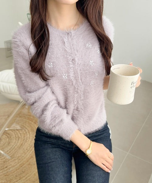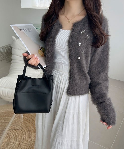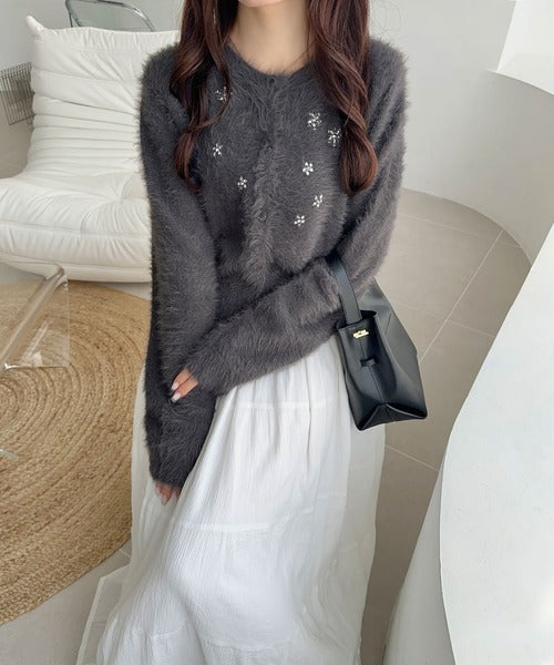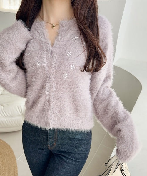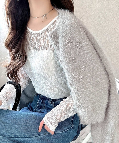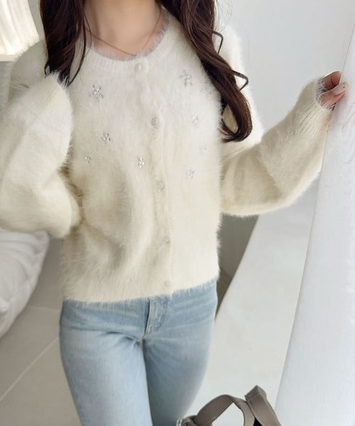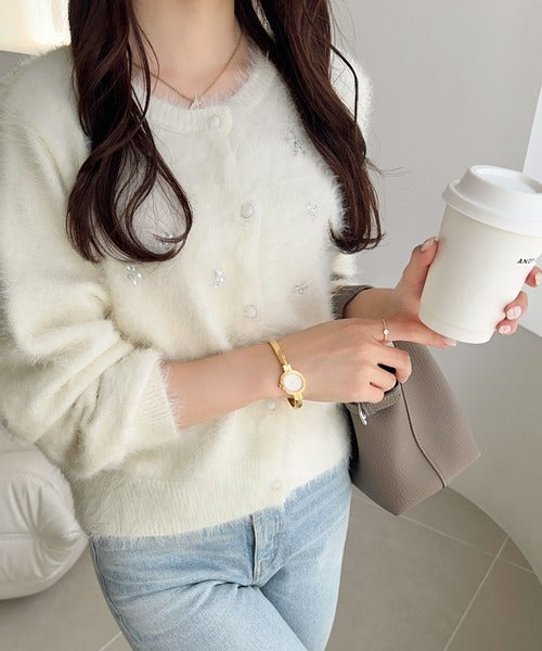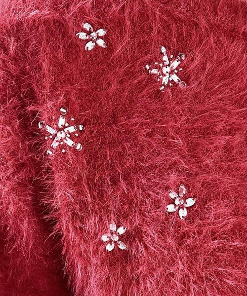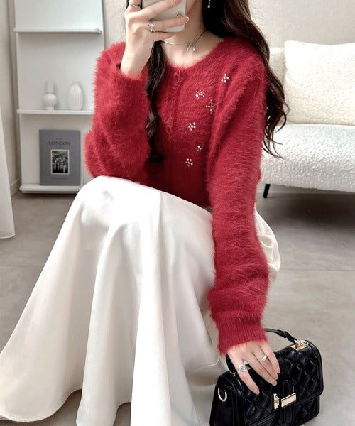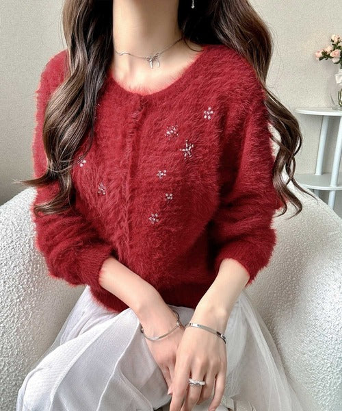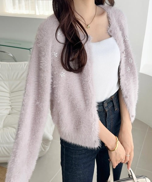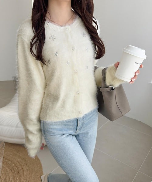 冬らしいシャギー素材とビジューが目を惹くカーディガン。