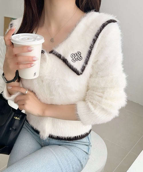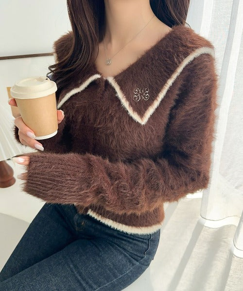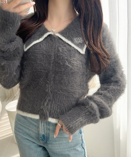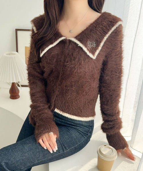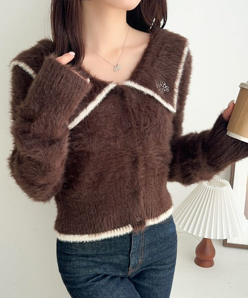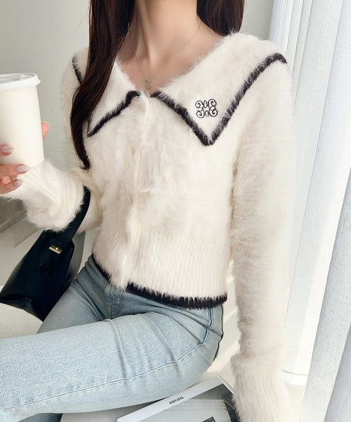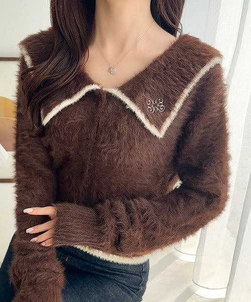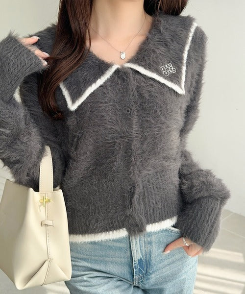 大きなセーラーカラーが特徴のビッグセーラーシャギーニットカーディガン。