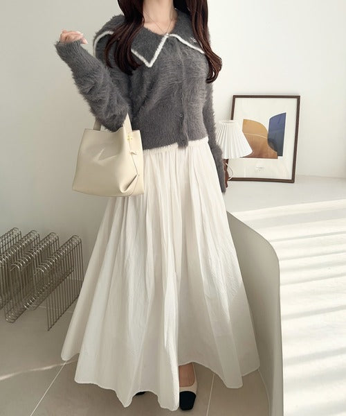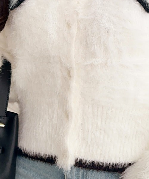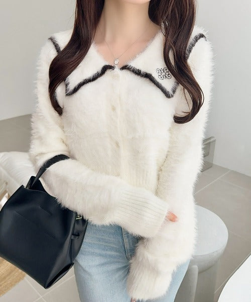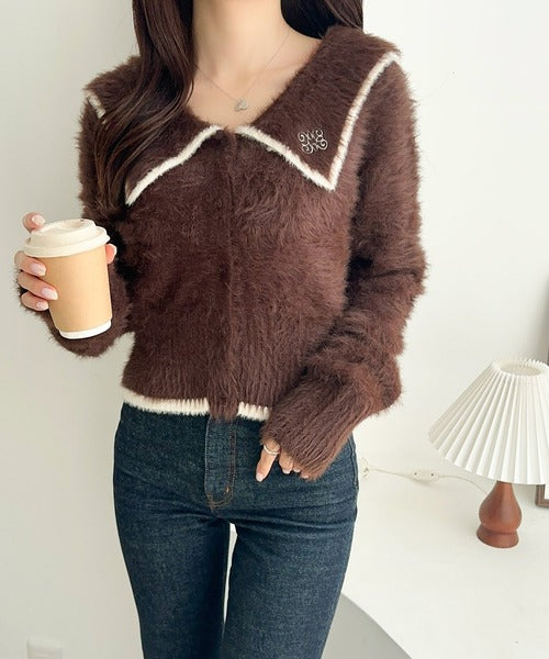セーラーカラーが可愛い、ふわふわシャギーニットのカーディガン。どんなスタイルにもぴったり!