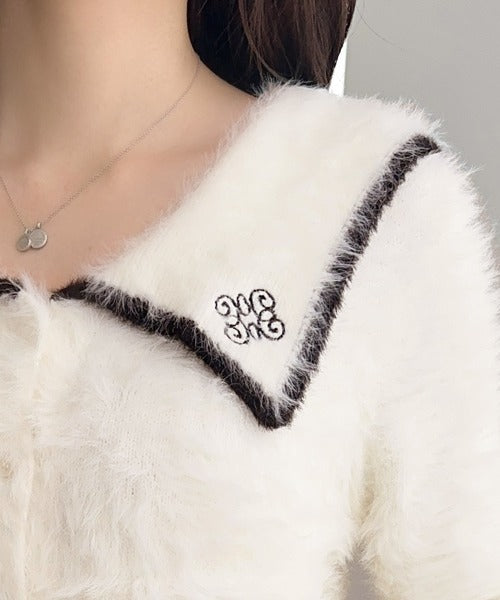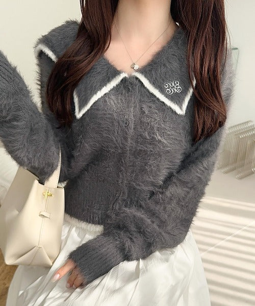 【mily bilet】セーラーカラーが可愛い。ロゴ刺繍ビッグセーラーシャギーニットカーディガン mi1029146