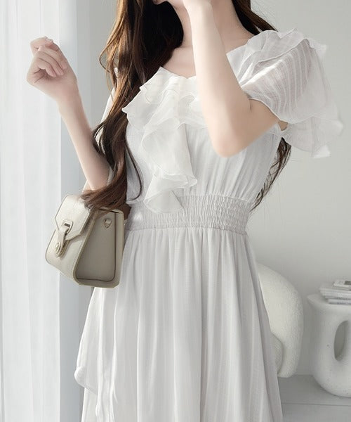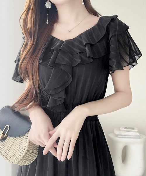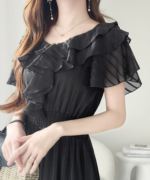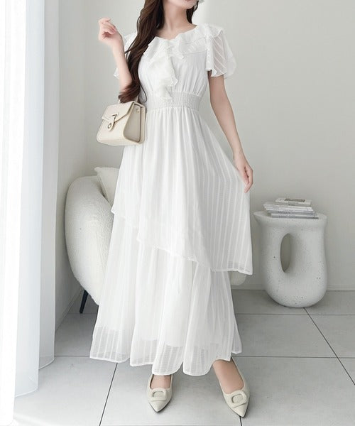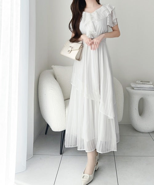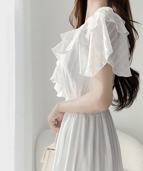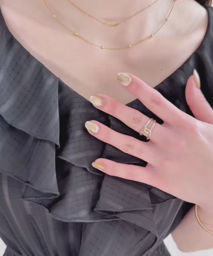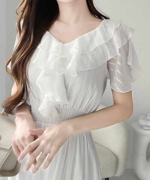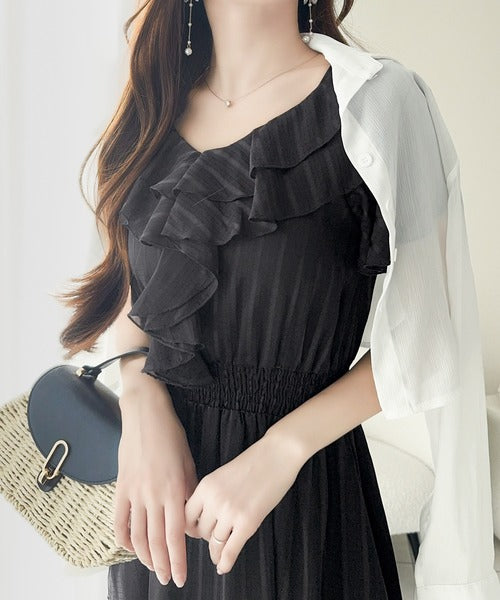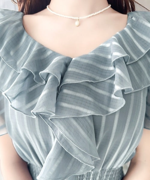 ネックラインからボディ中心に流れる2枚仕立てのフリルが