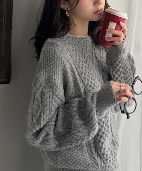 クラシックなアラン柄を組み合わせた編地が特徴のニットプルオーバー。