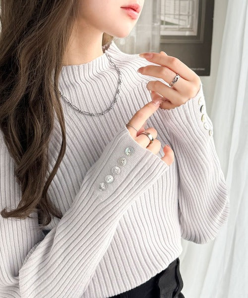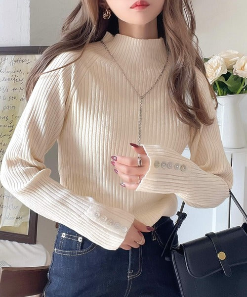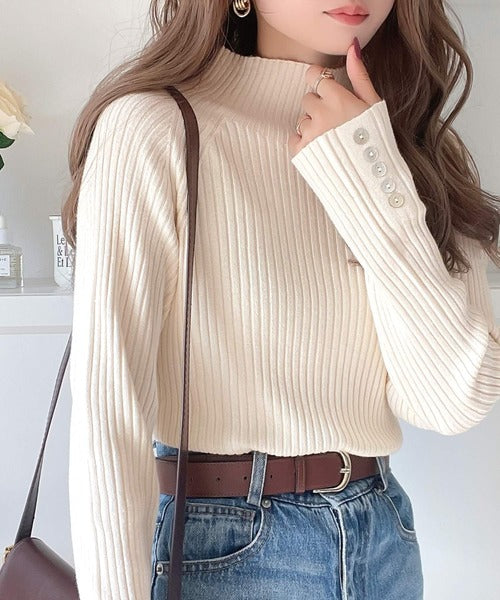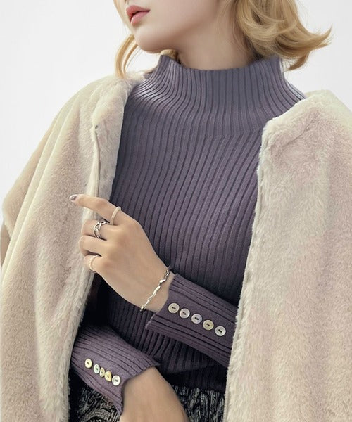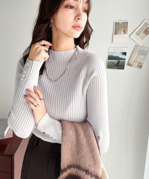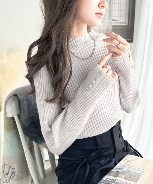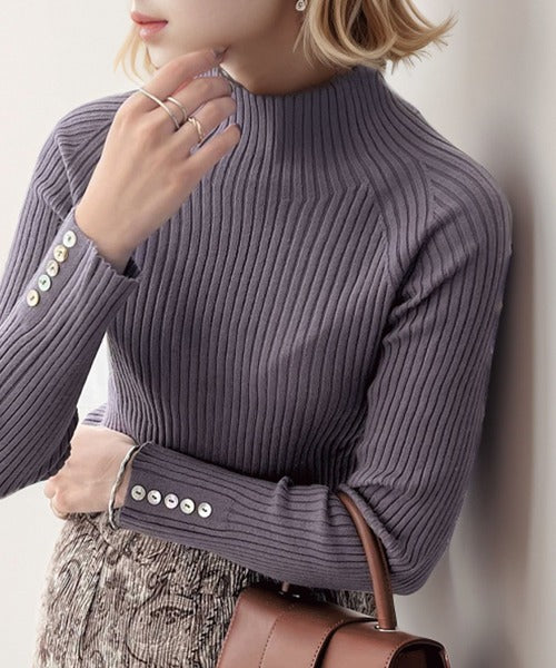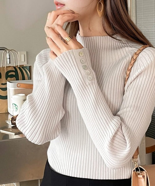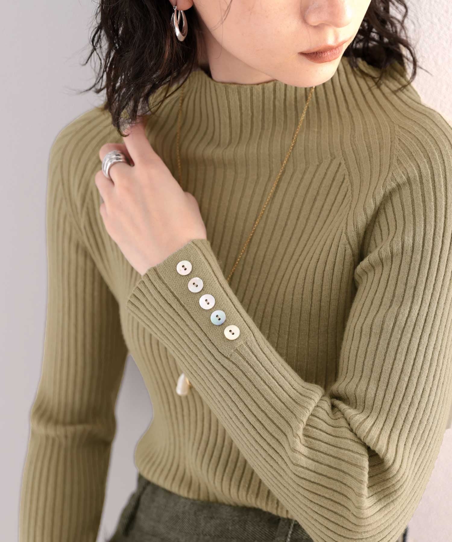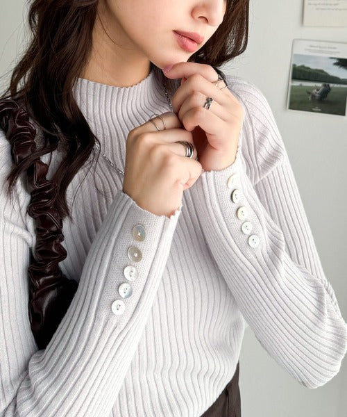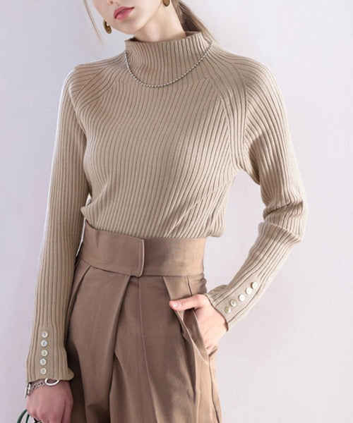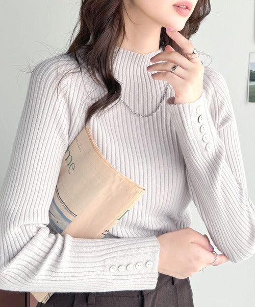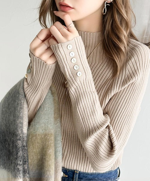 袖シェルボタン付きミドル丈ストレッチハイネックリブニット(長袖) cl7040