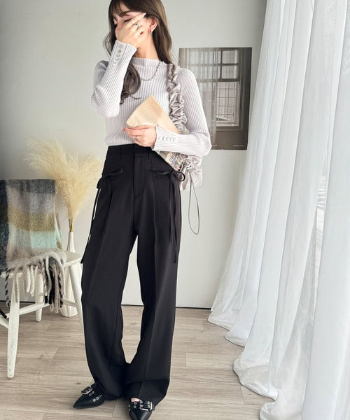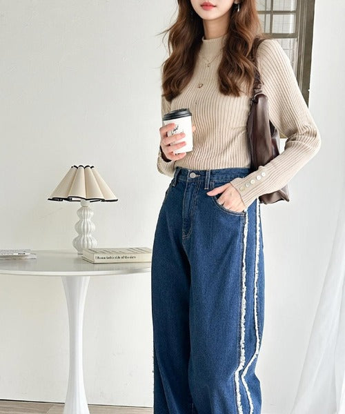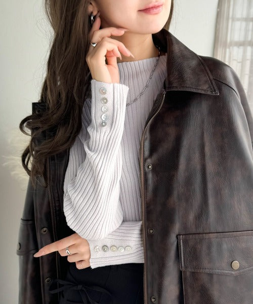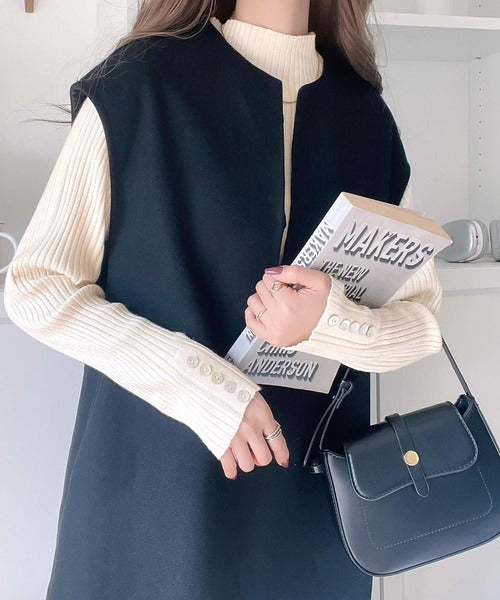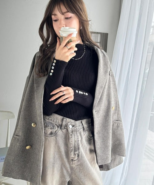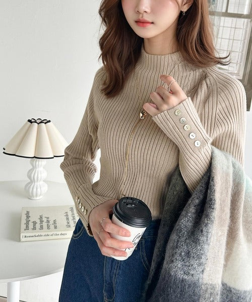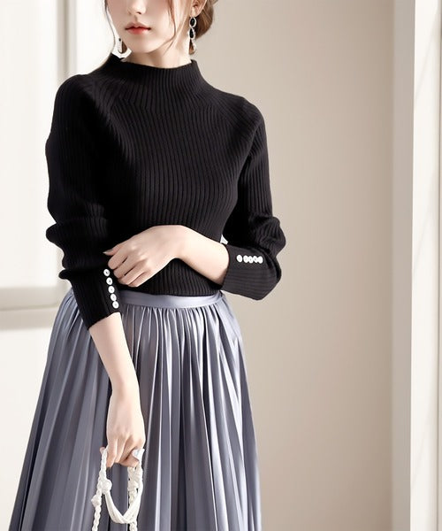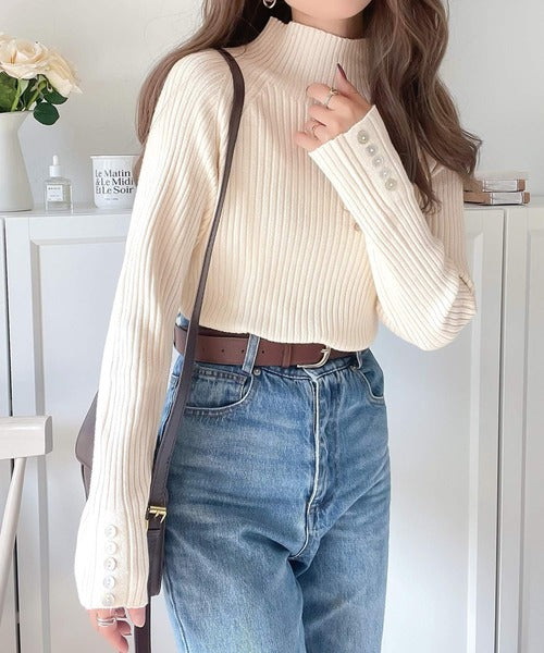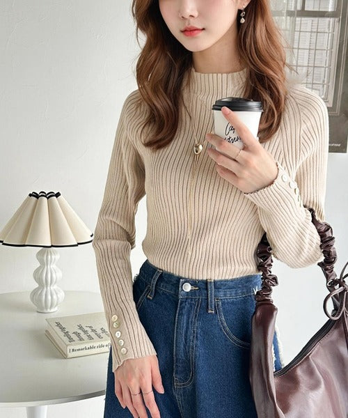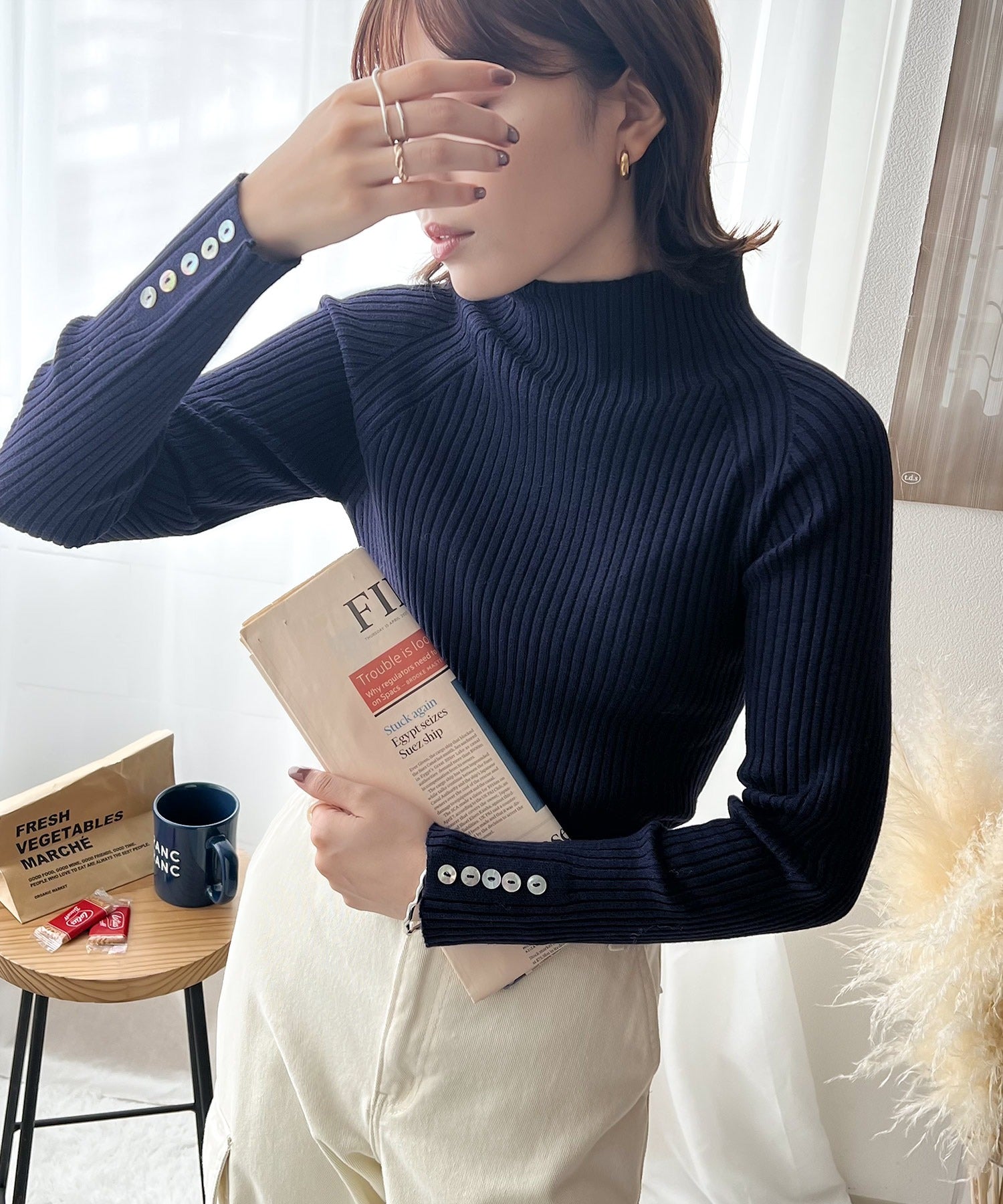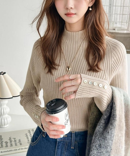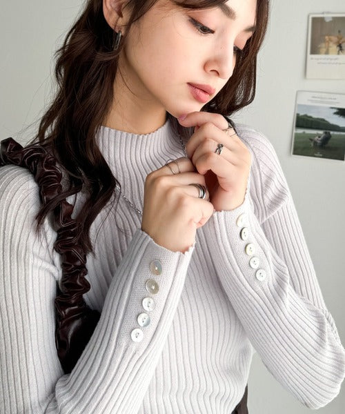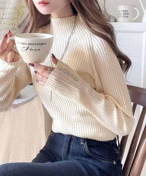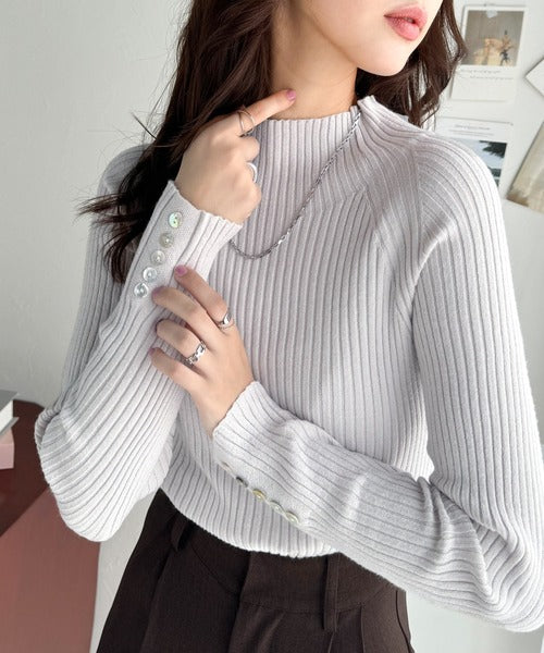 袖シェルボタン付きミドル丈ストレッチハイネックリブニット(長袖) cl7040