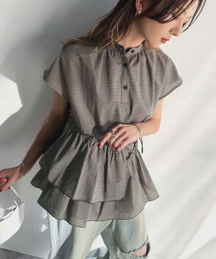 大人カジュアルに活躍。前後2wayサッカー素材アシンメトリーティアードフリルプルオーバー ce1110092