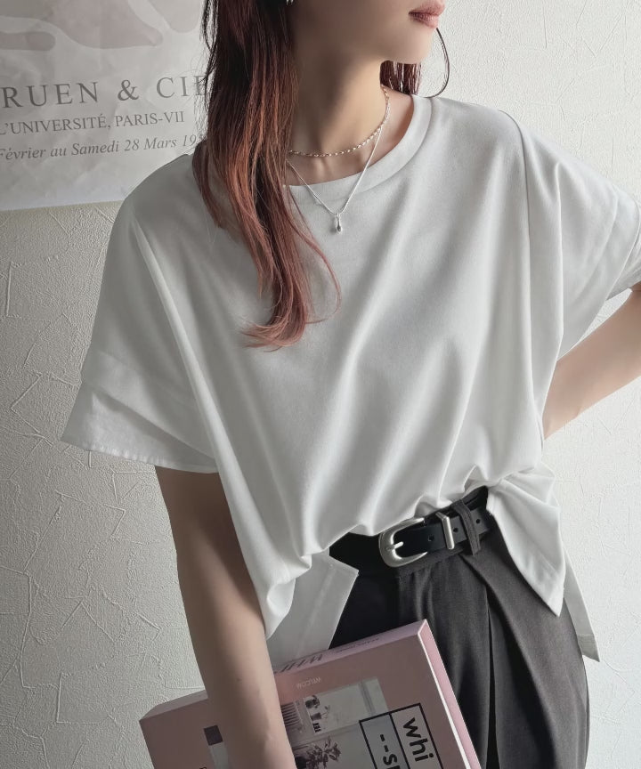 アクセサリーやバッグの色味を変えることで、一枚でも多彩な雰囲気を楽しめるこのTシャツ、あなただけのスタイルを見つけてくださいね♪