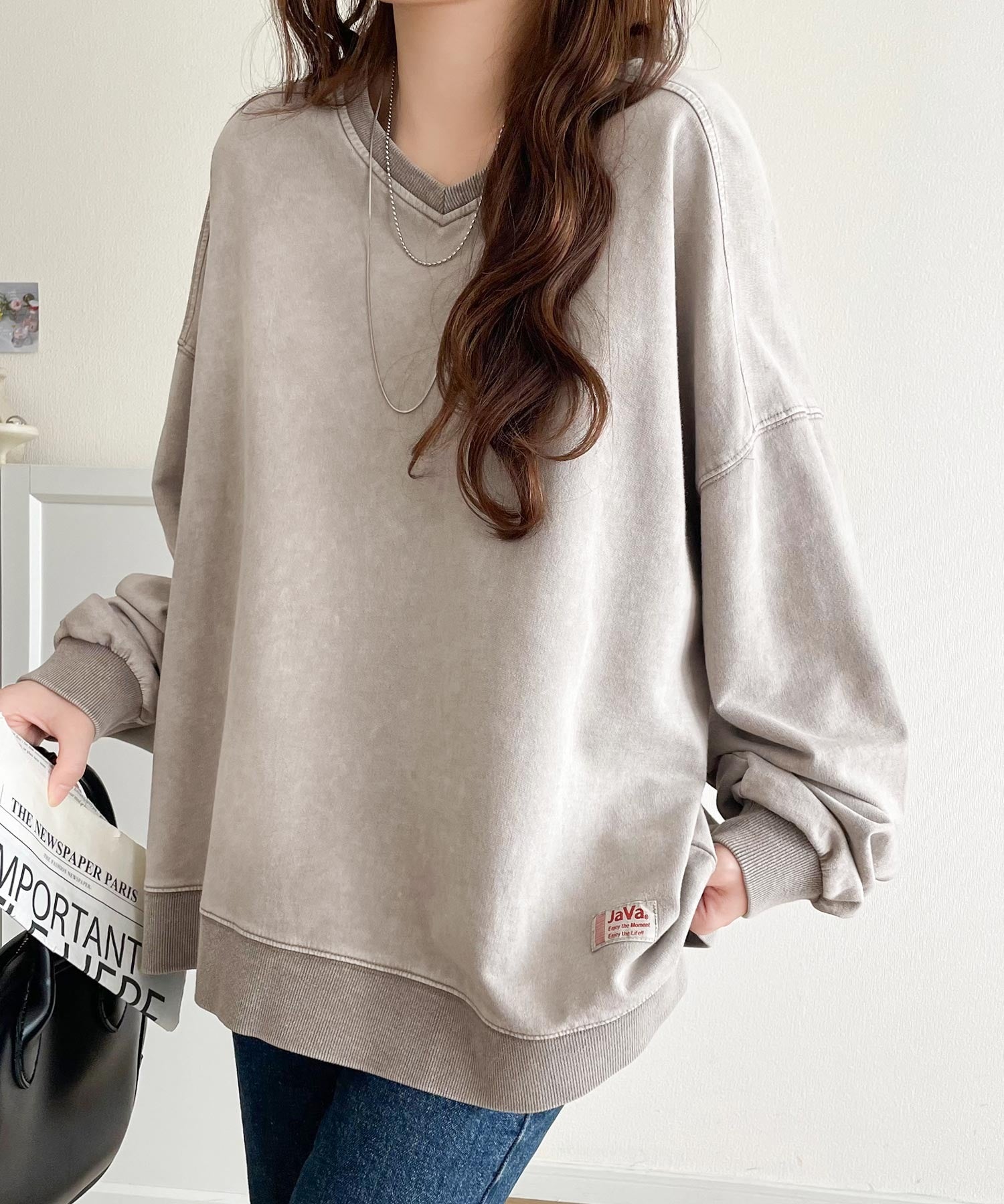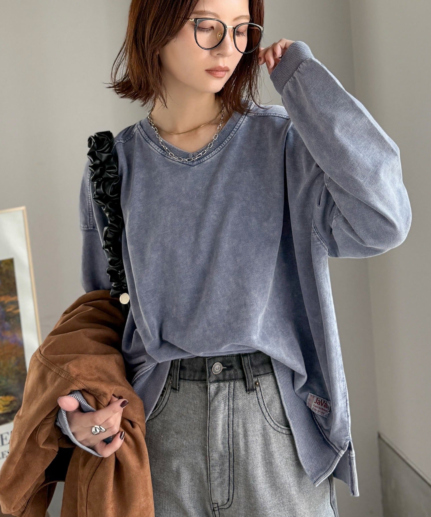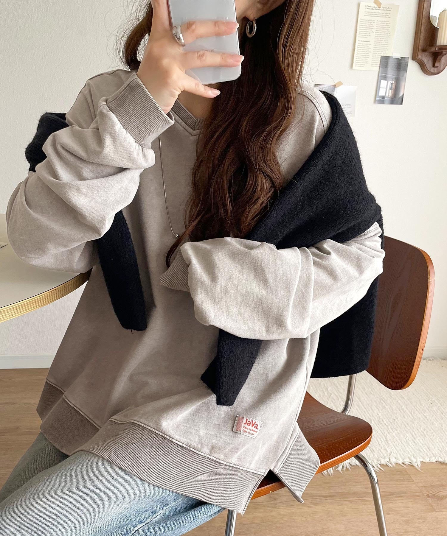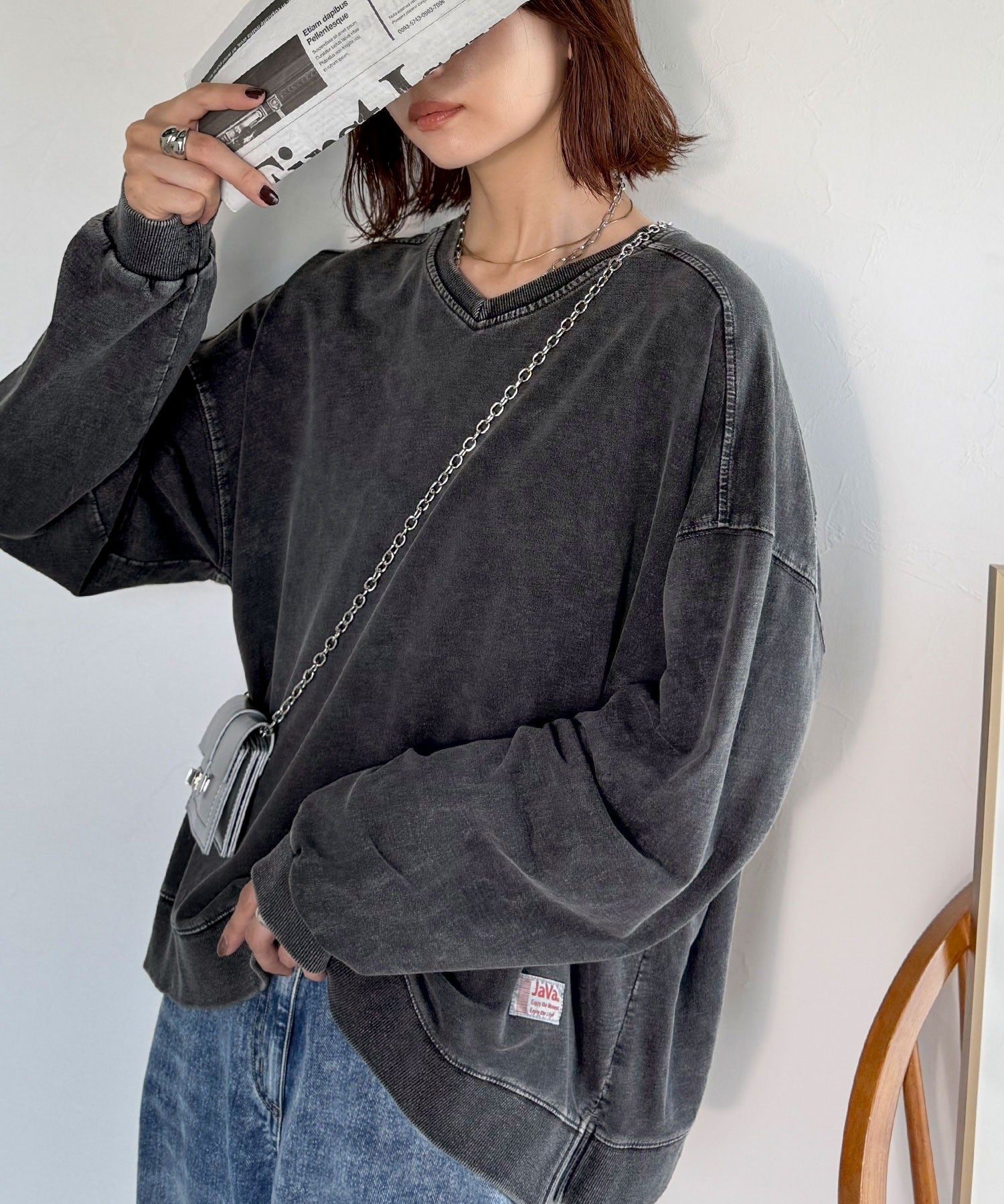 《JaVaジャバコラボ》ヴィンテージライクな質感でトレンド感をプラス♪ 綿100%裾JaVaVネック切り替え裏毛ロンT jv1260513