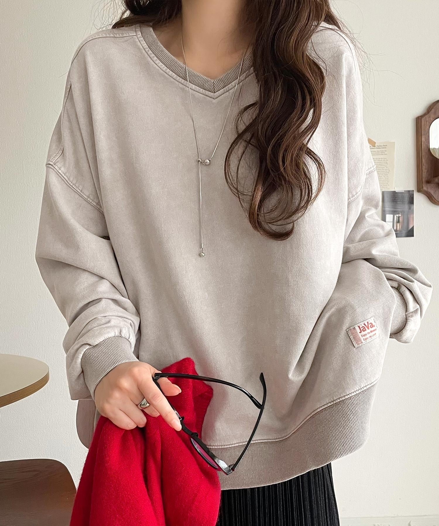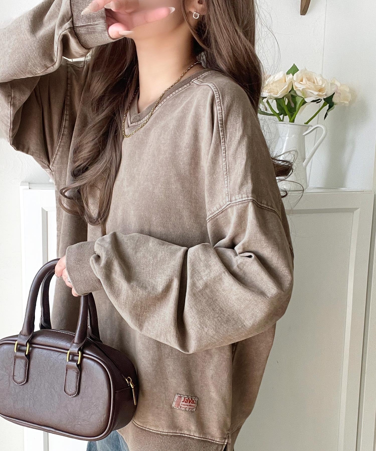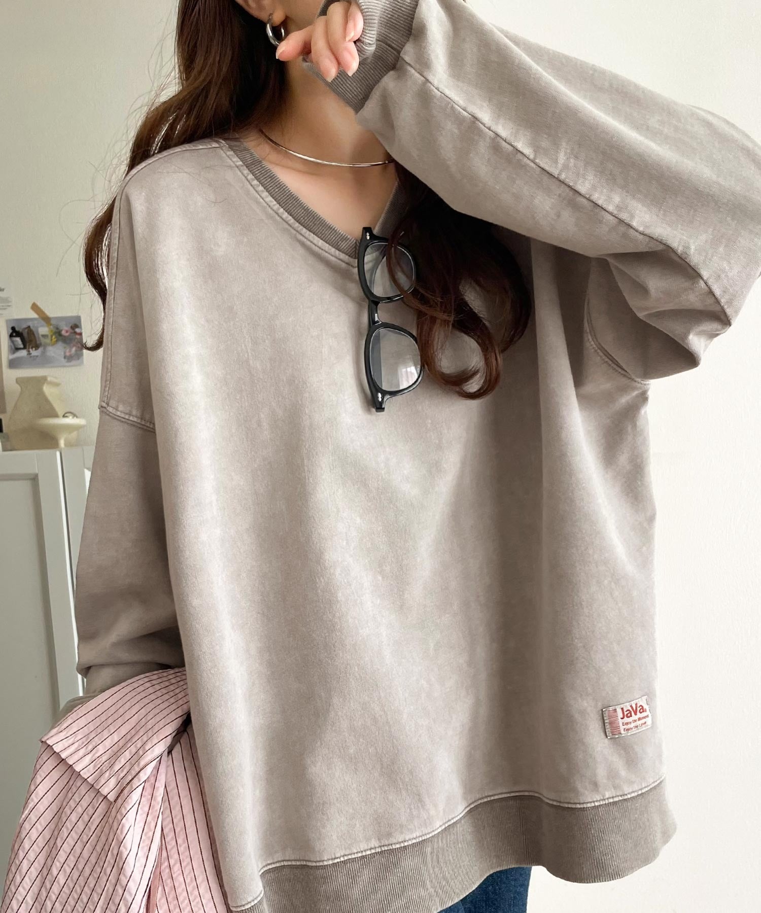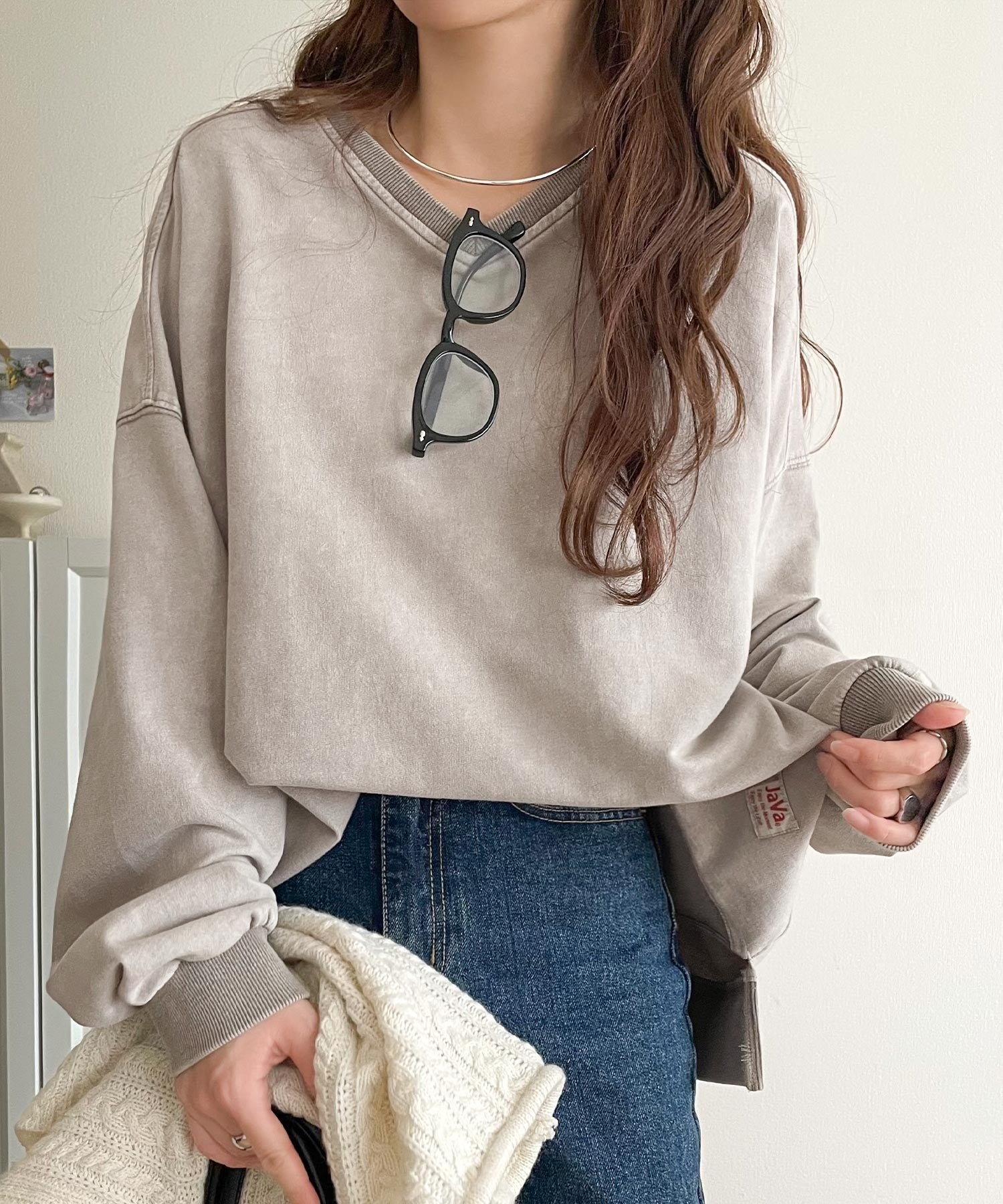 《JaVaジャバコラボ》ヴィンテージライクな質感でトレンド感をプラス♪ 綿100%裾JaVaVネック切り替え裏毛ロンT jv1260513