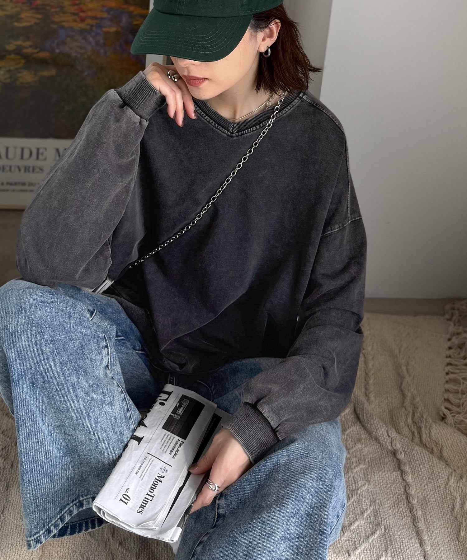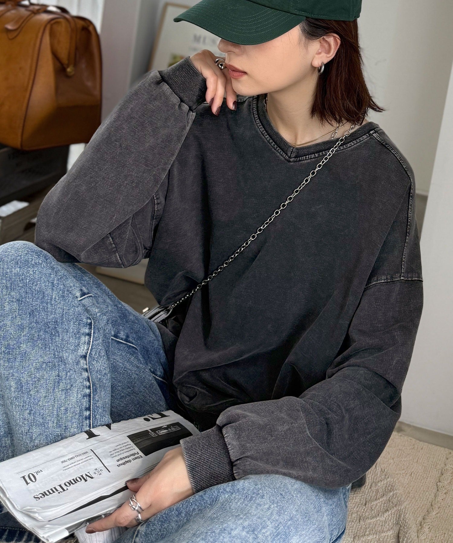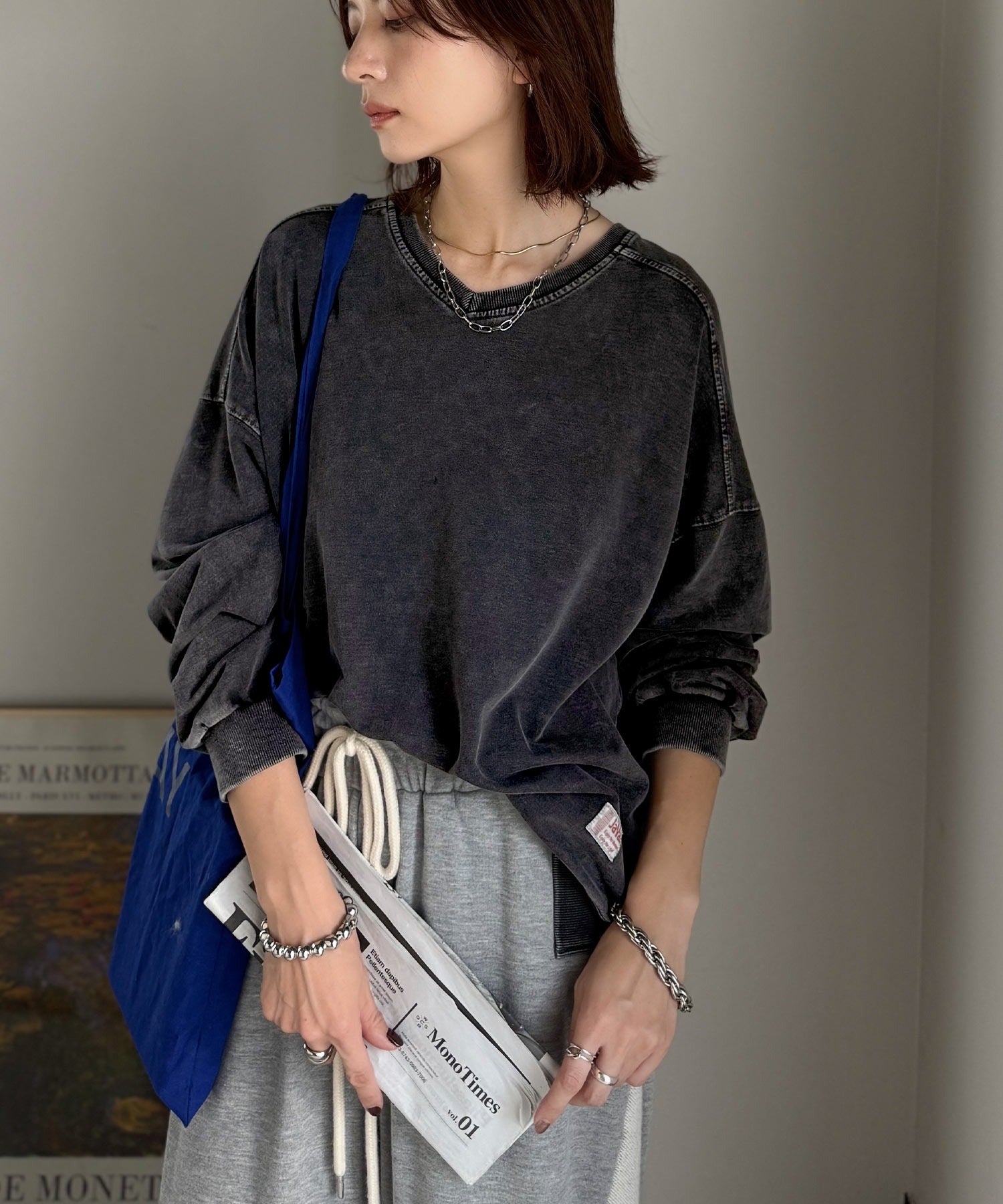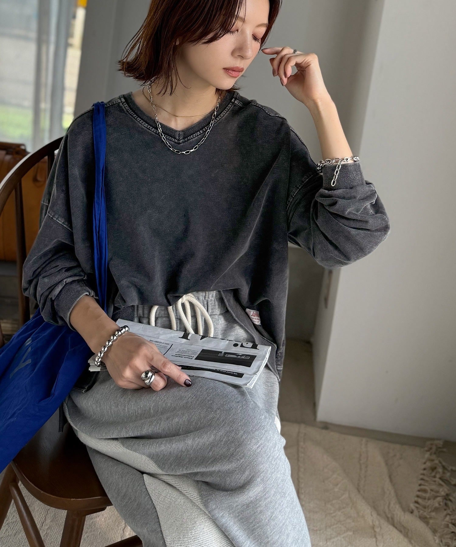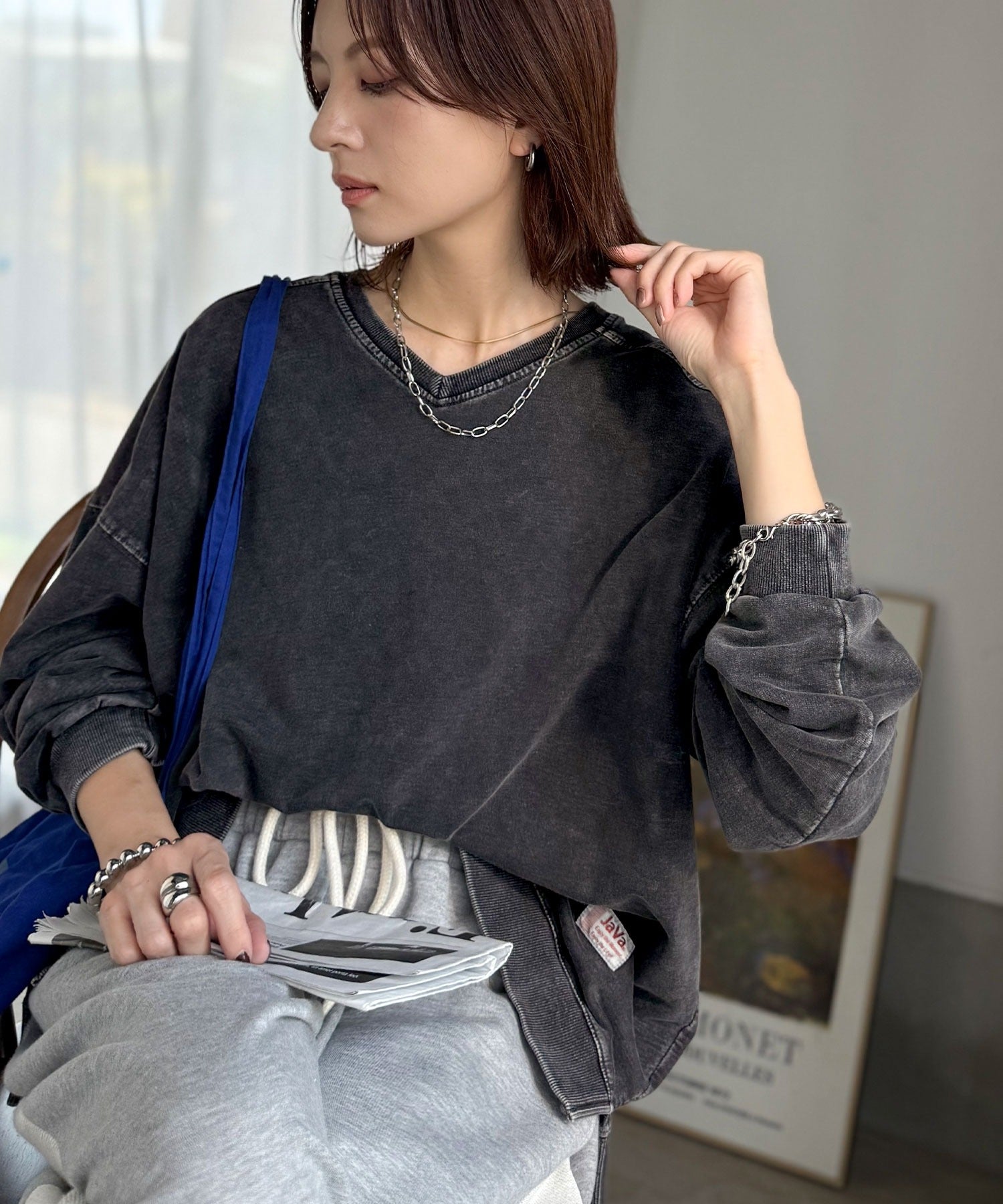 ヴィンテージライクな質感が特徴のVネック切り替え裏毛ロンT。