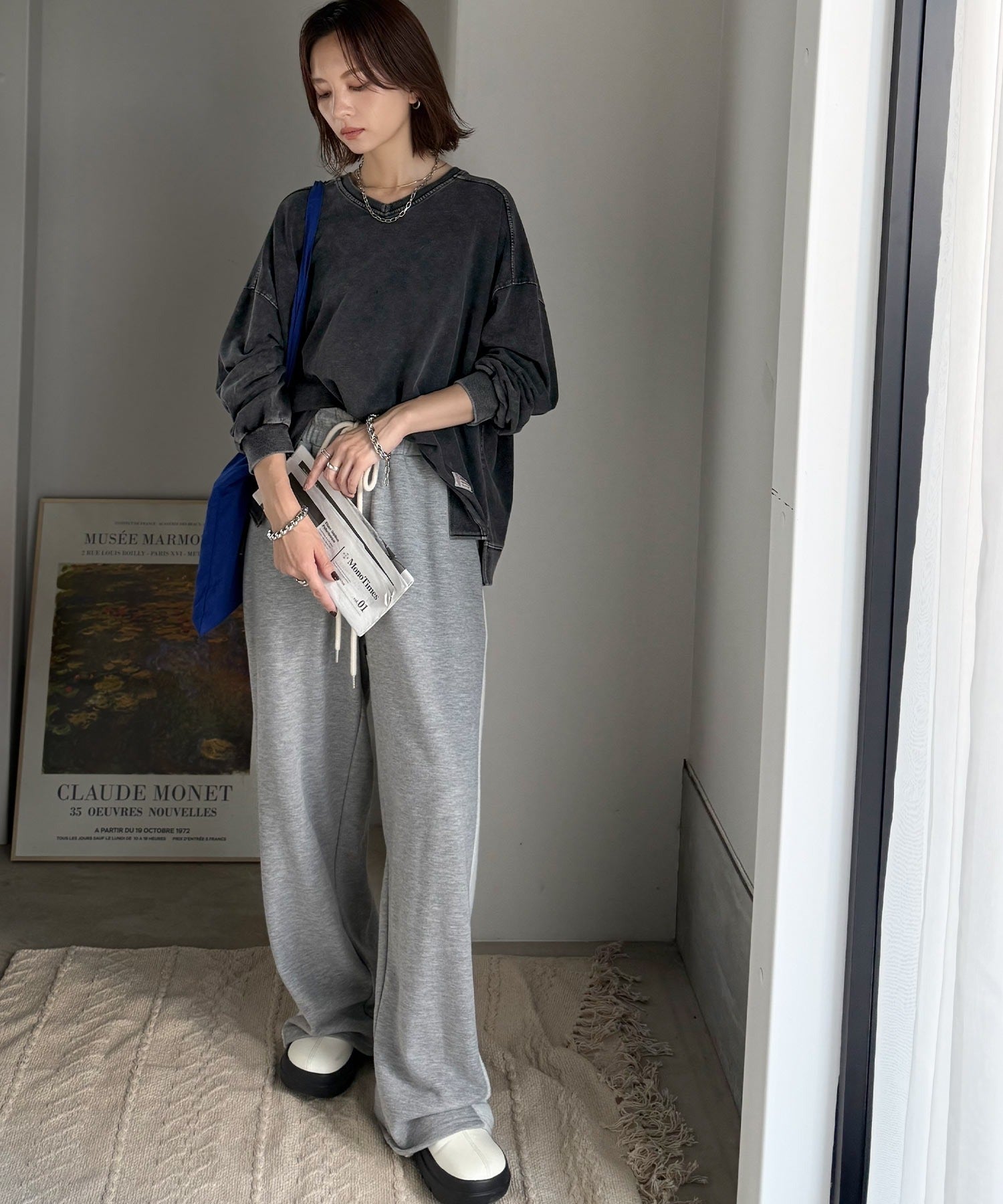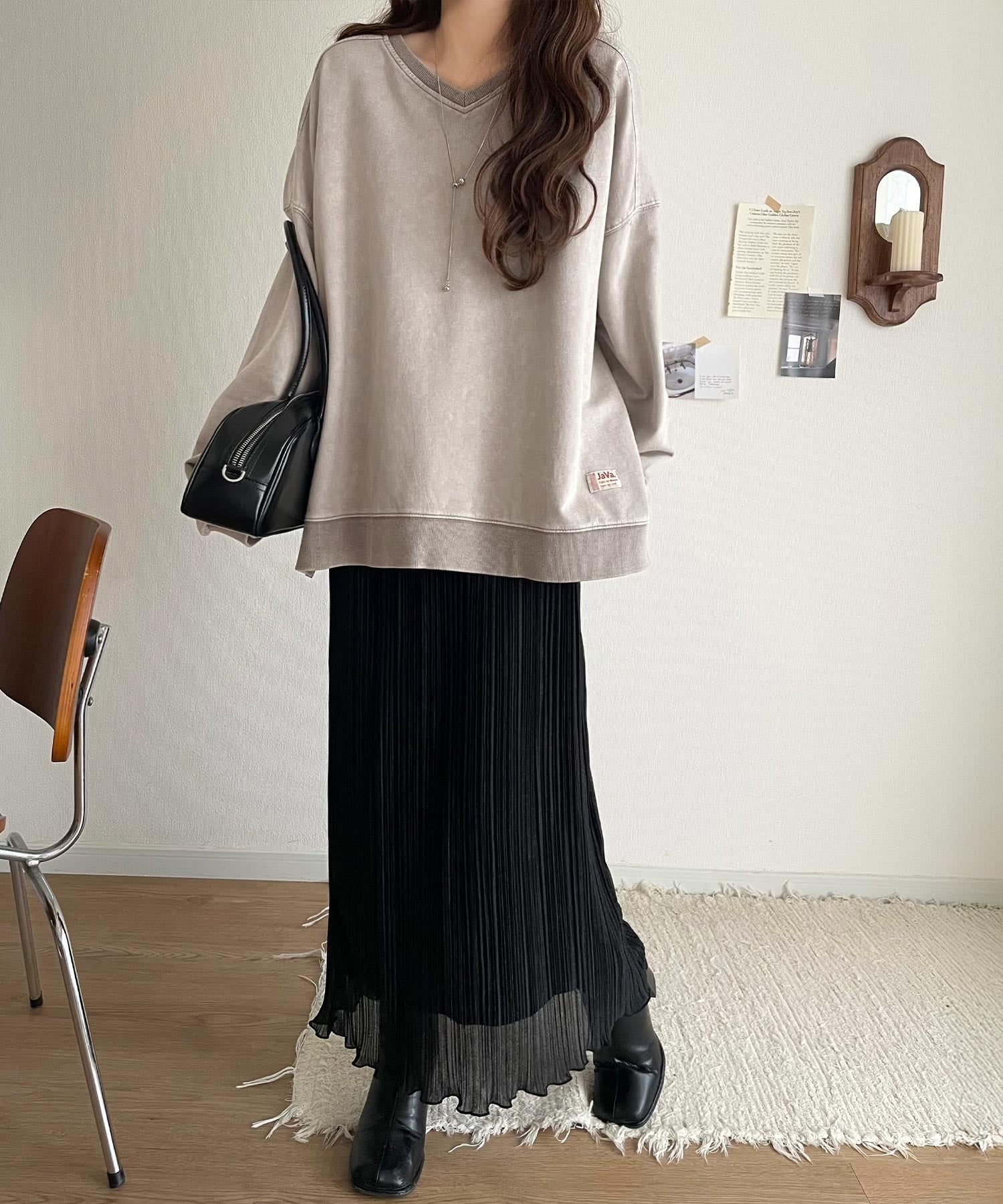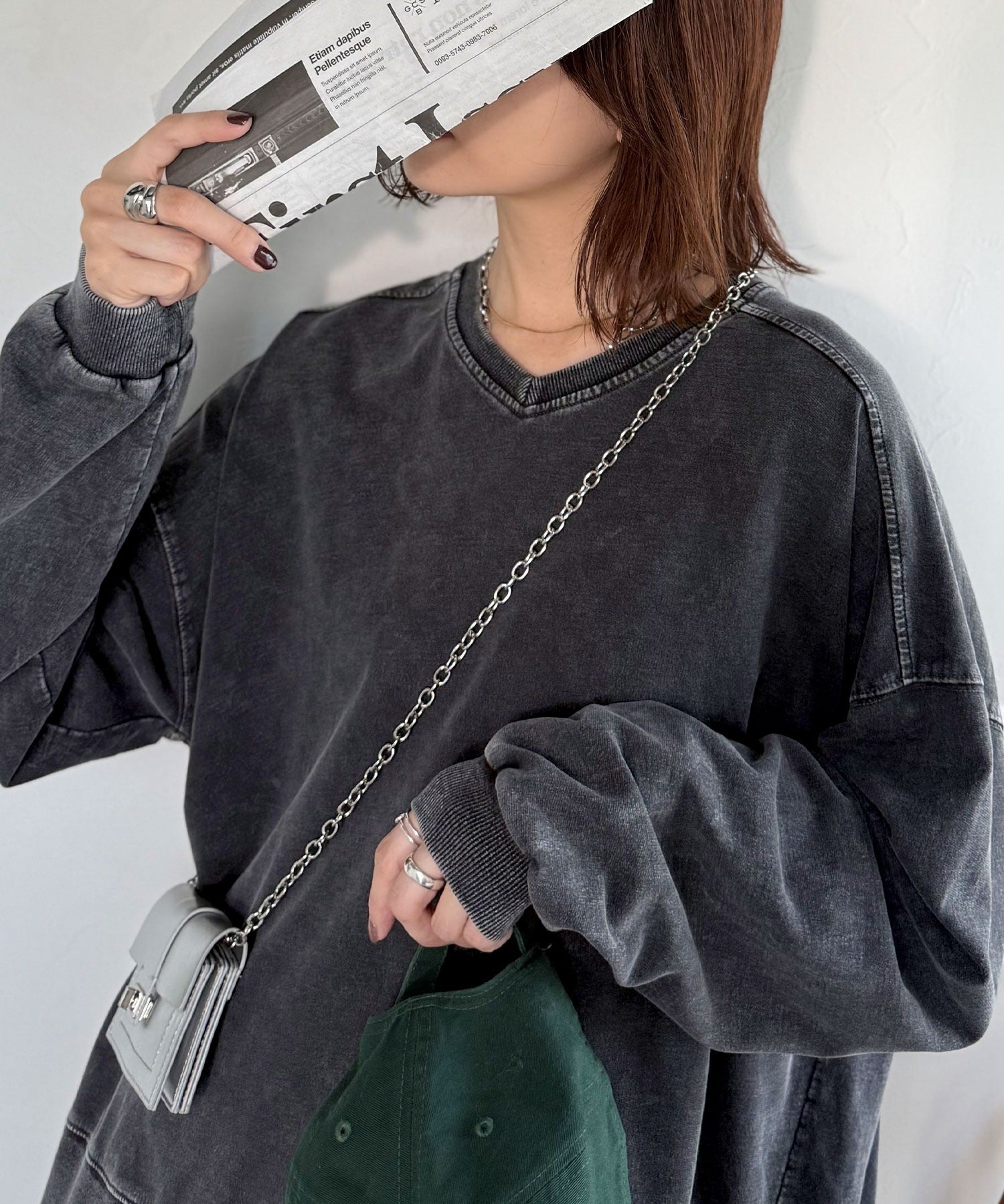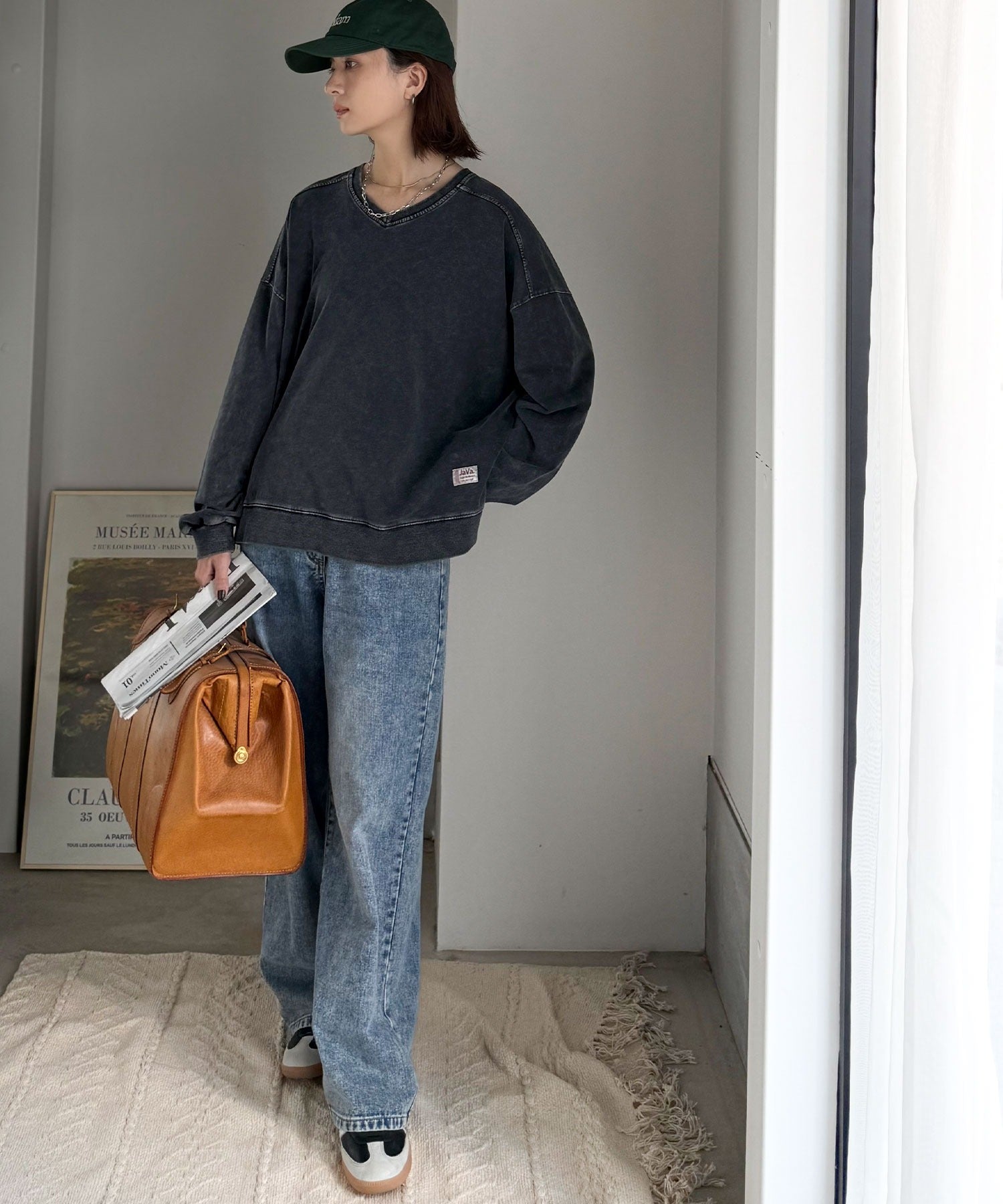 ゆったりとしたメンズライクなシルエットに、Vネックを合わせることでバランス良く仕上げています。