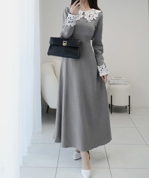 雰囲気溢れるパールとレースのAラインシルエットワンピース。