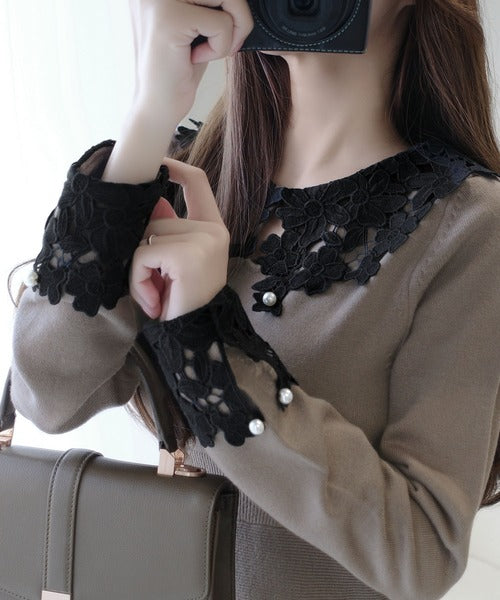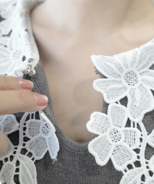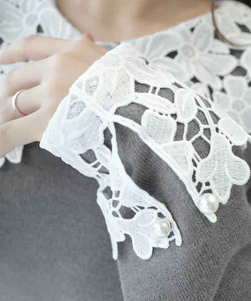 襟と袖口に施された花モチーフレースが、上品さを演出!