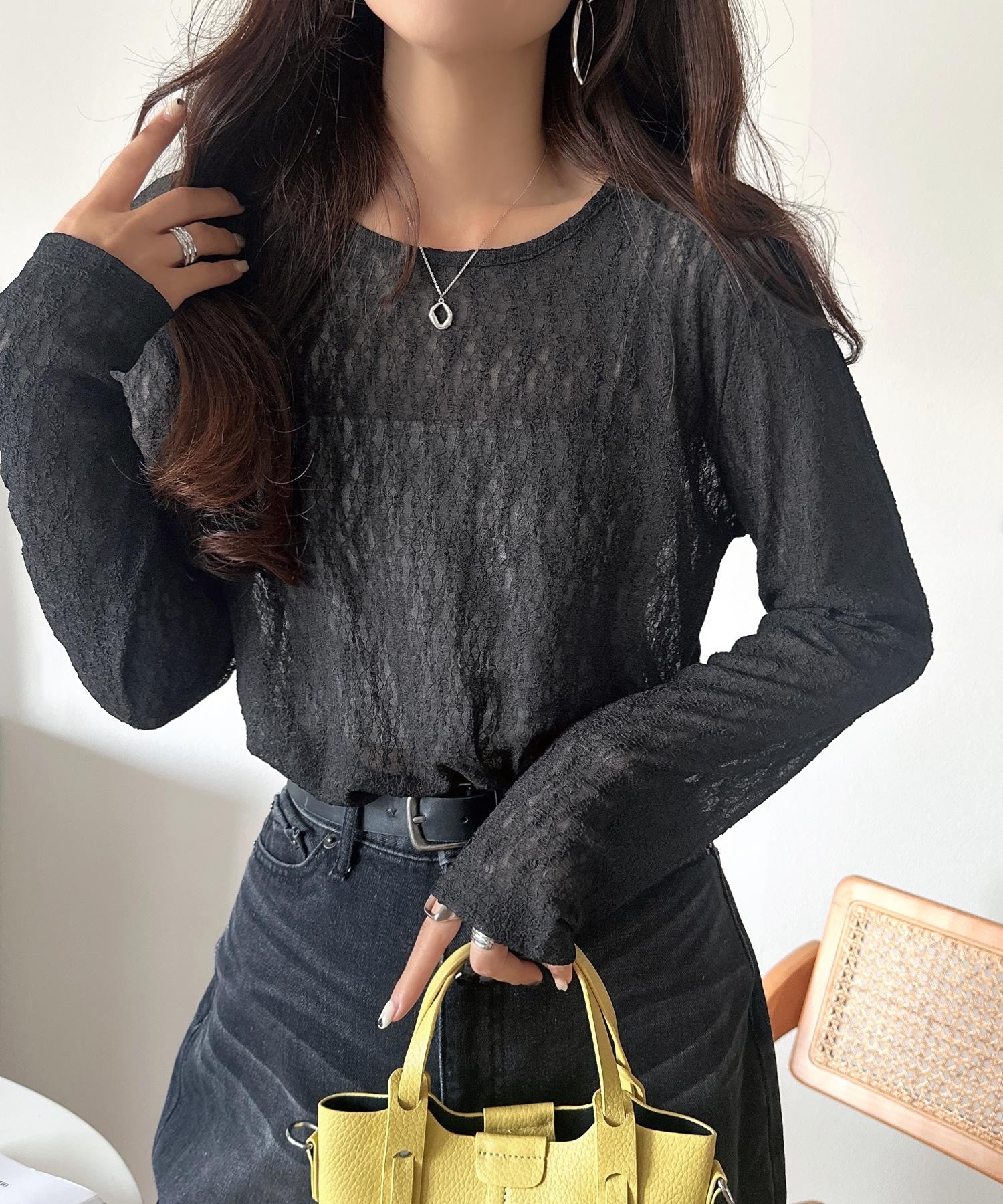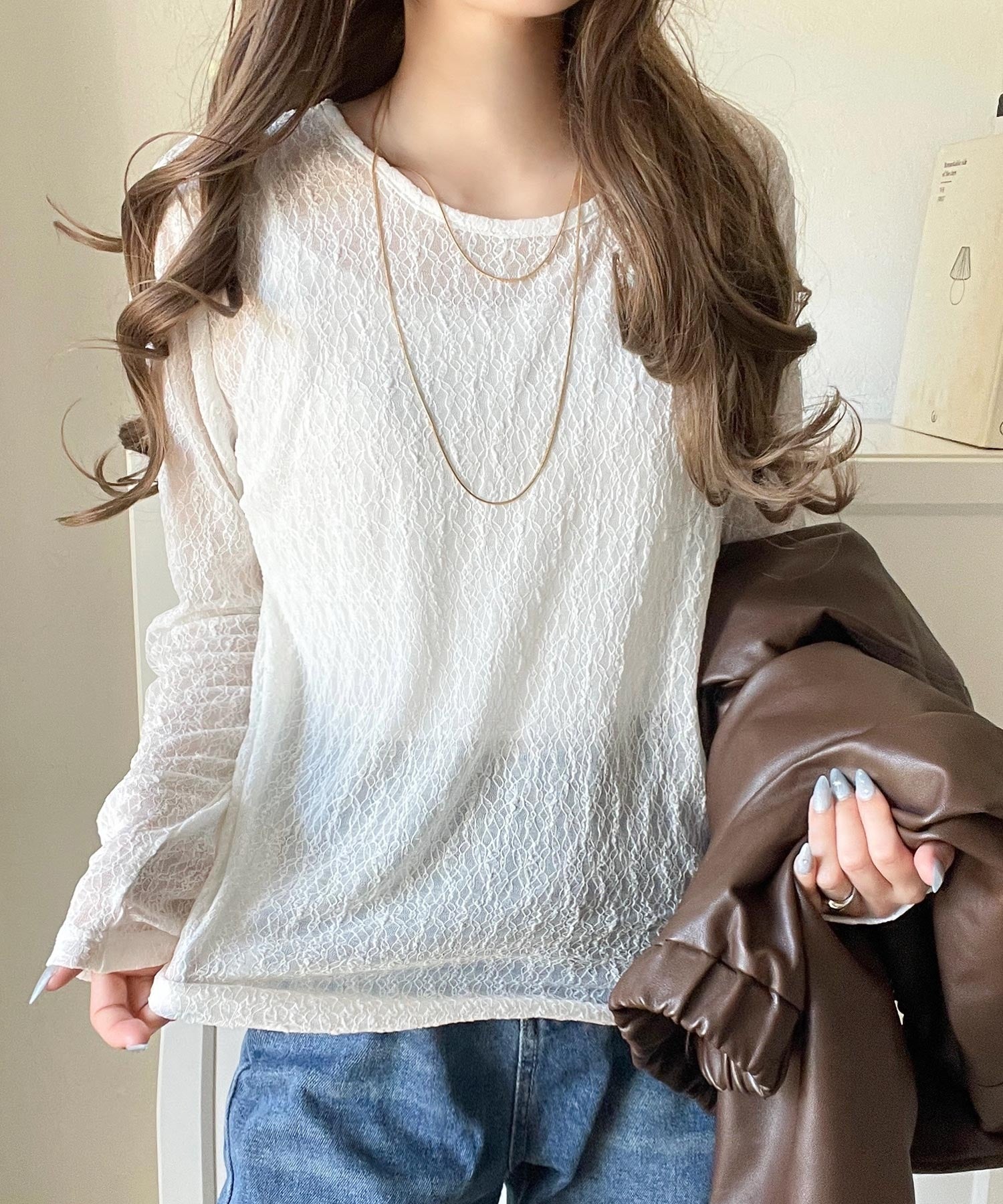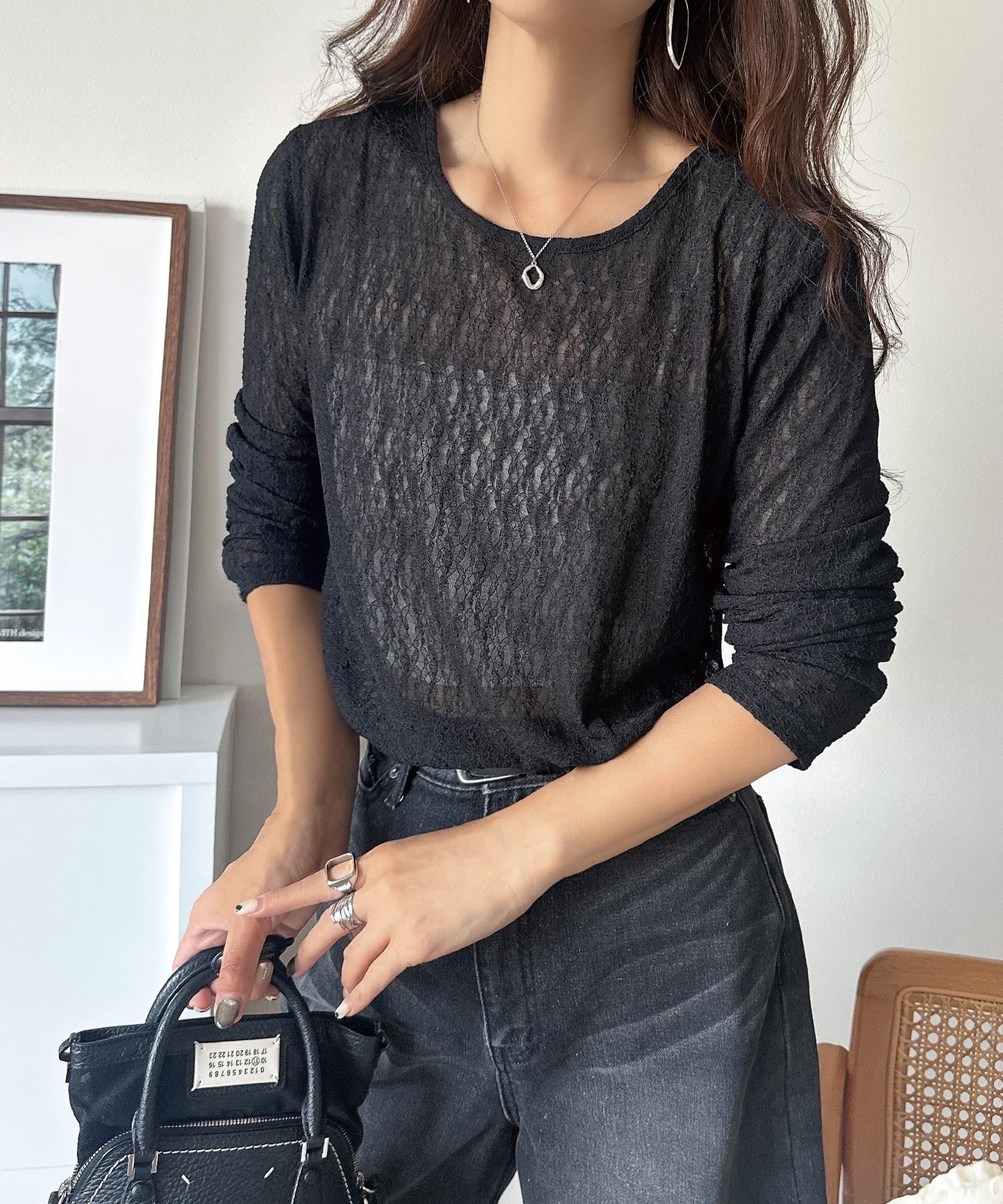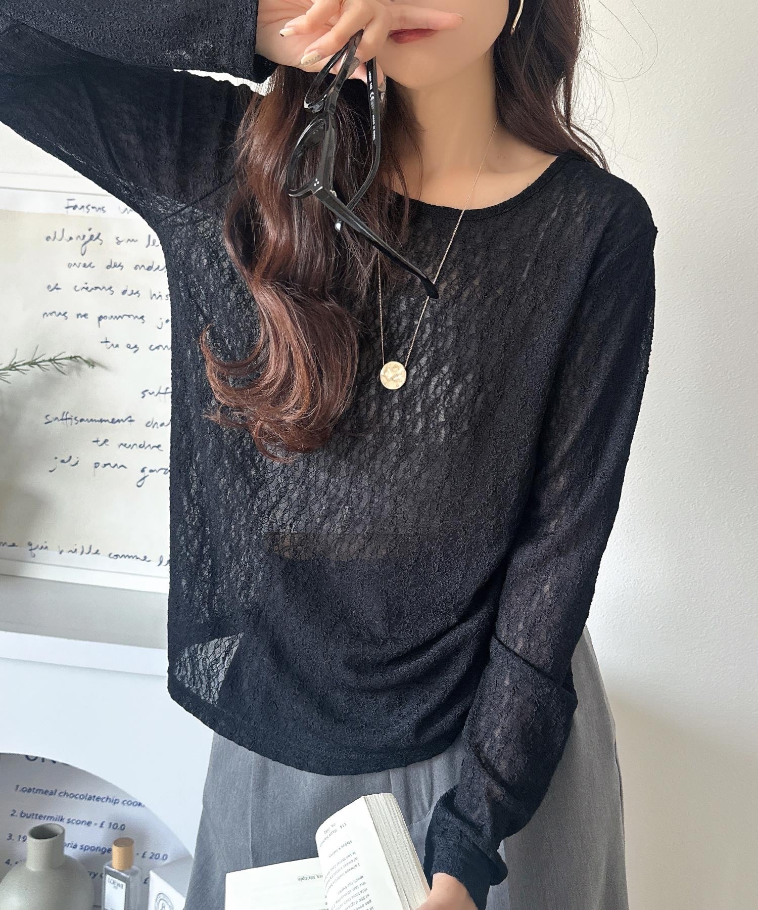 ほどよい透け感が大人上品。総柄シアーレーストップス(長袖) ce1010488