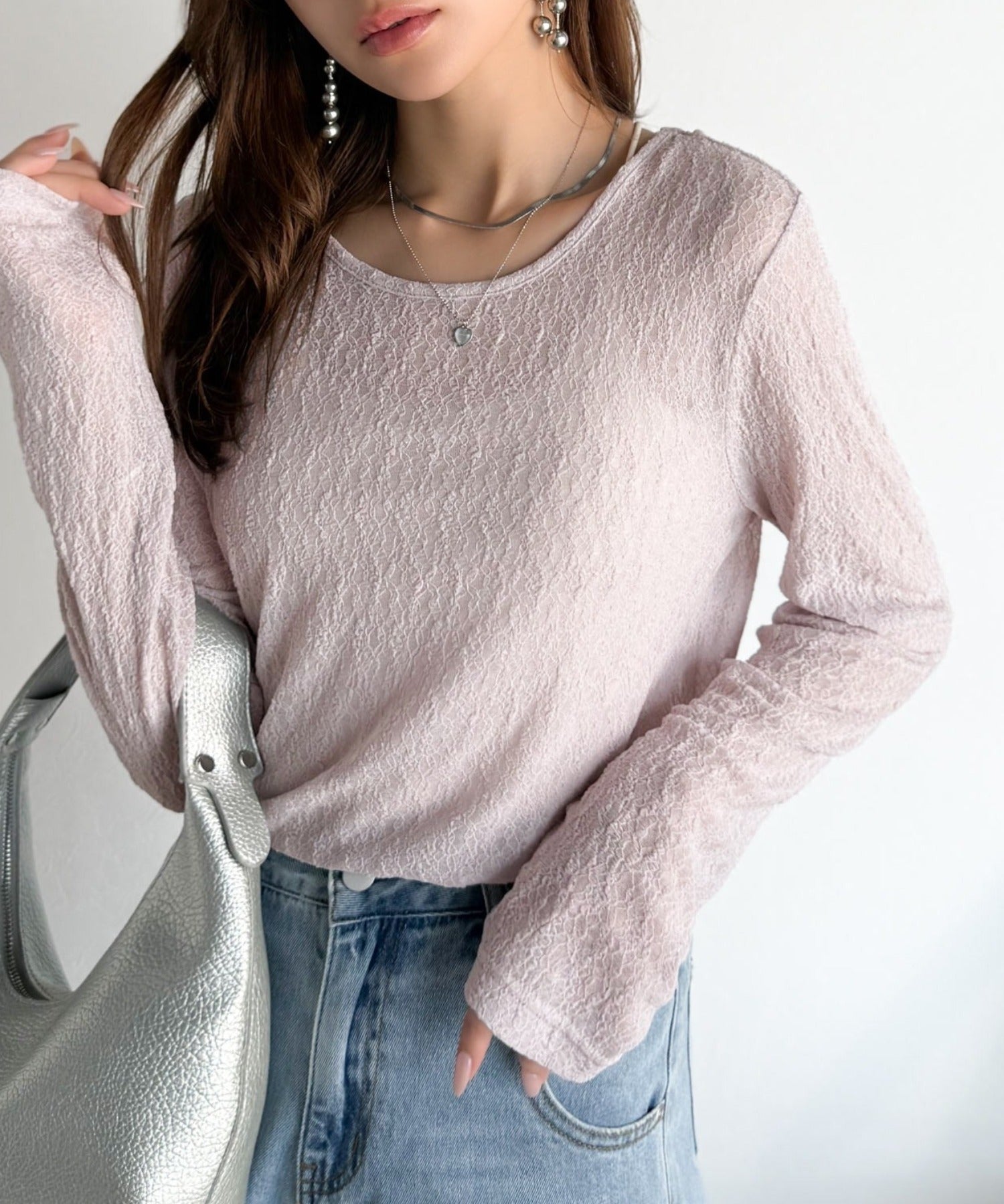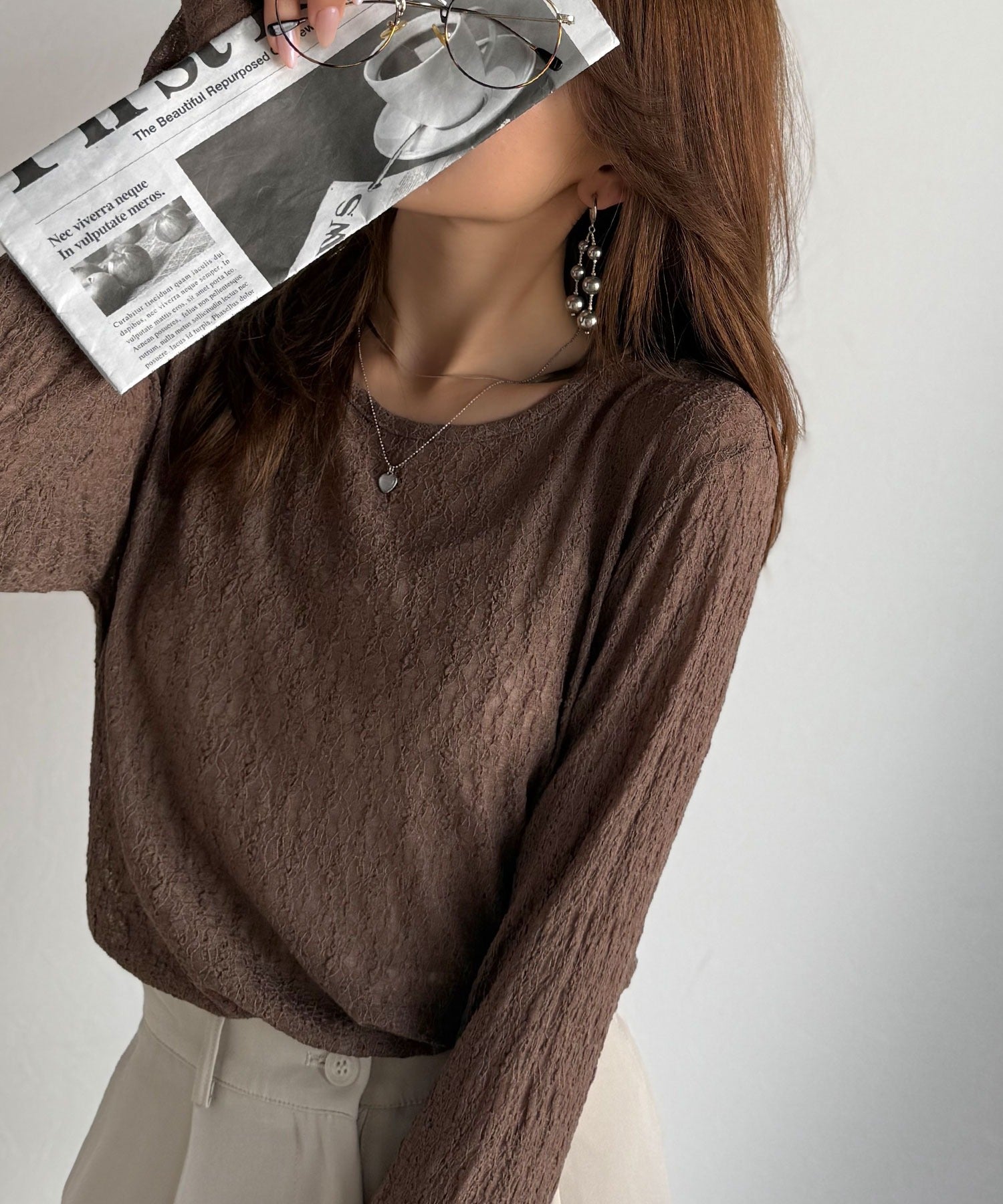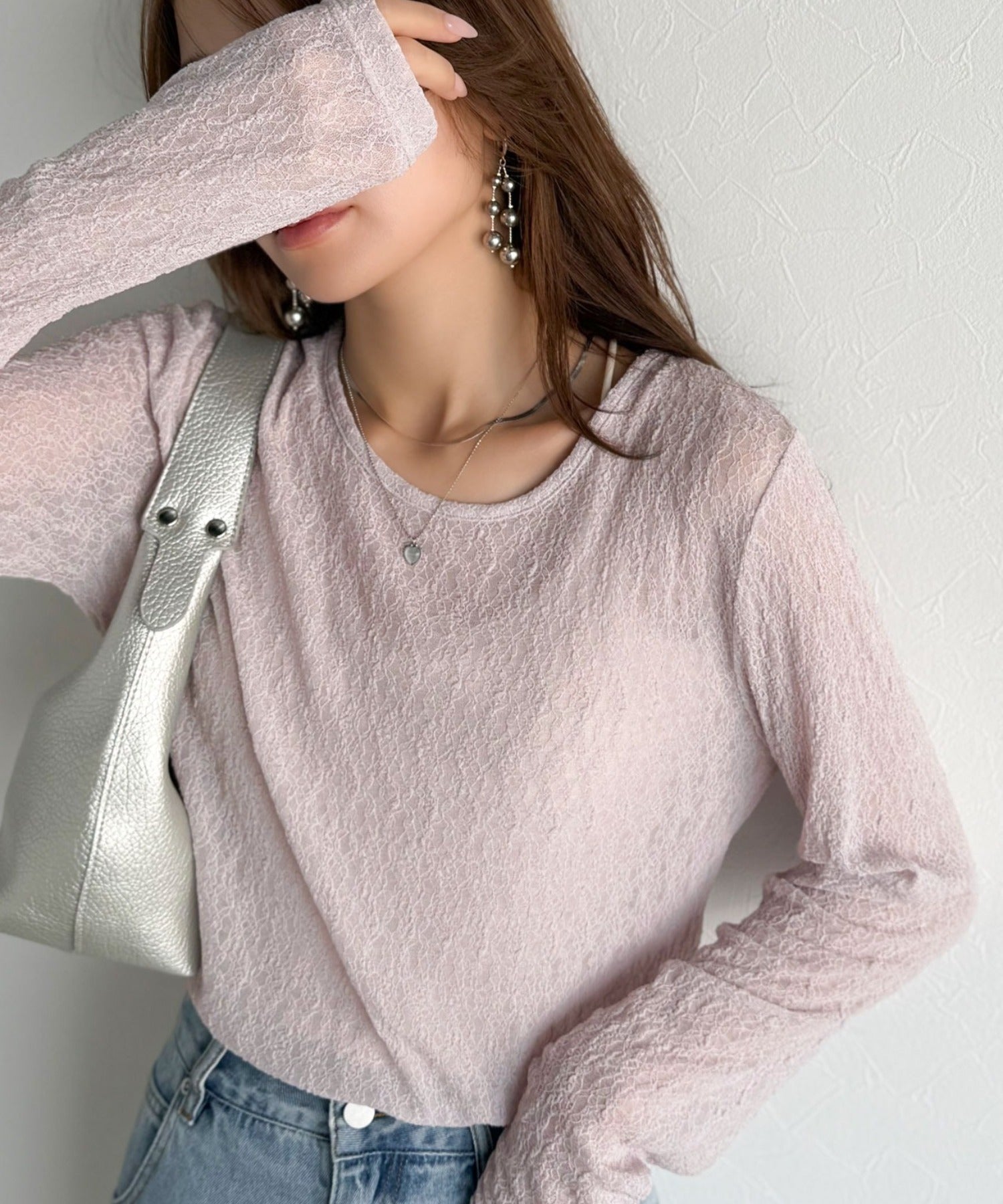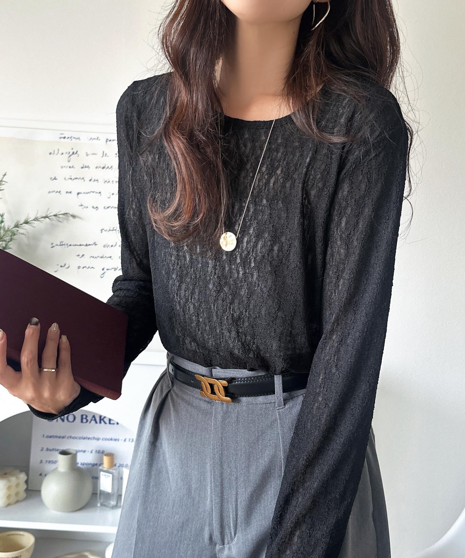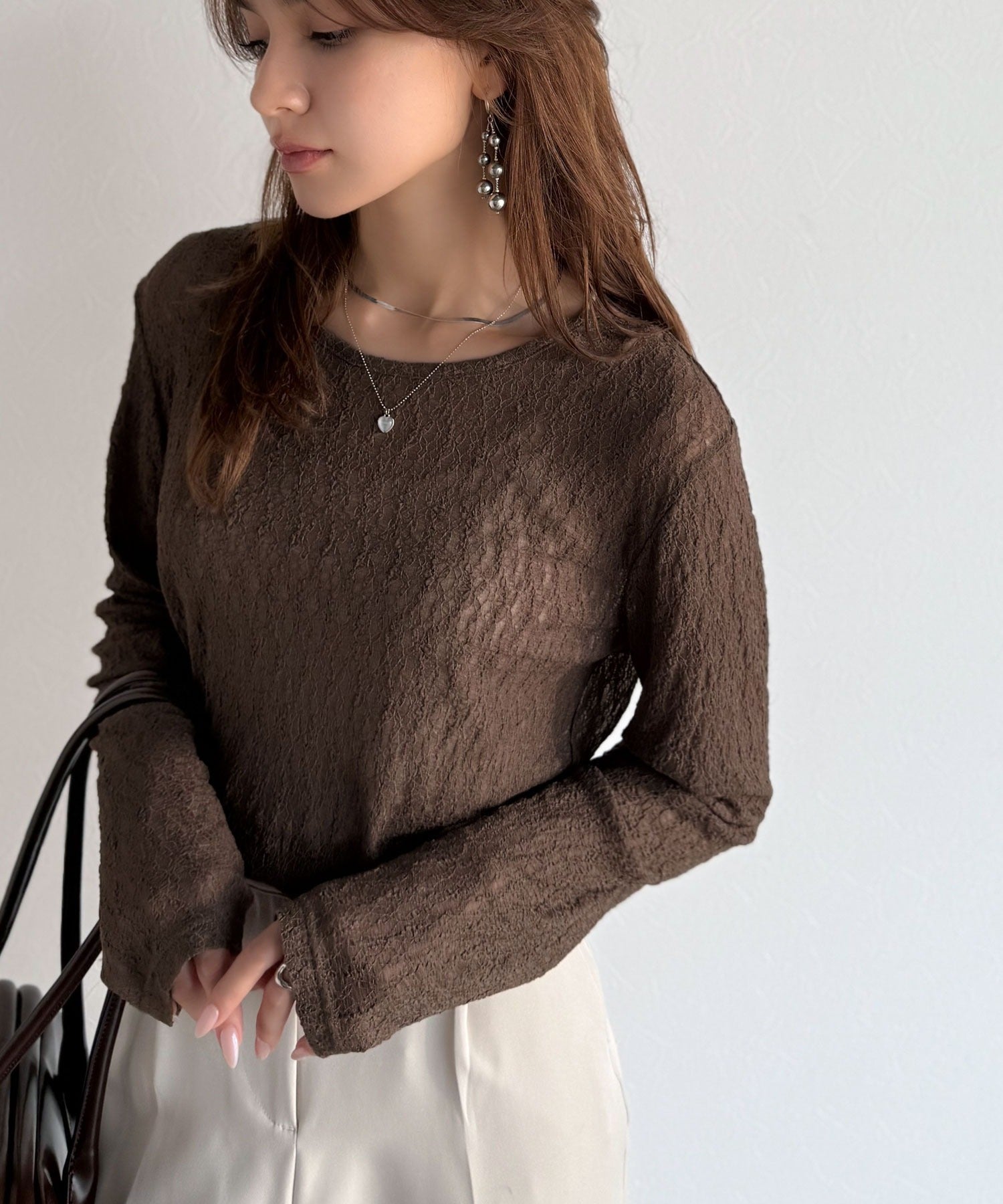 ほどよい透け感が大人上品。総柄シアーレーストップス(長袖) ce1010488