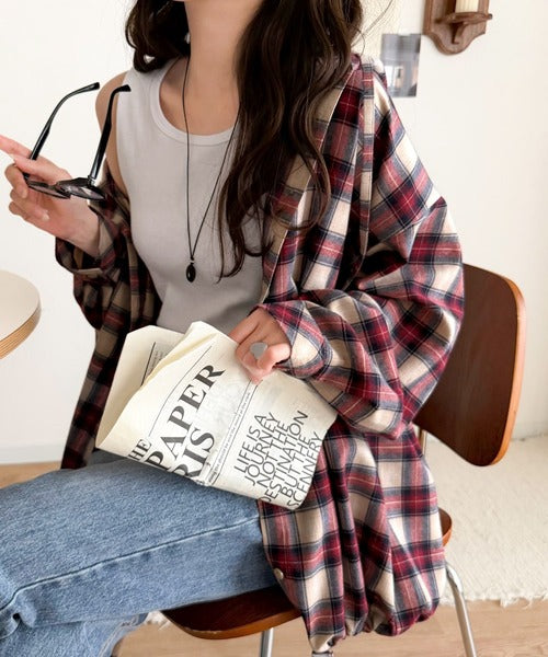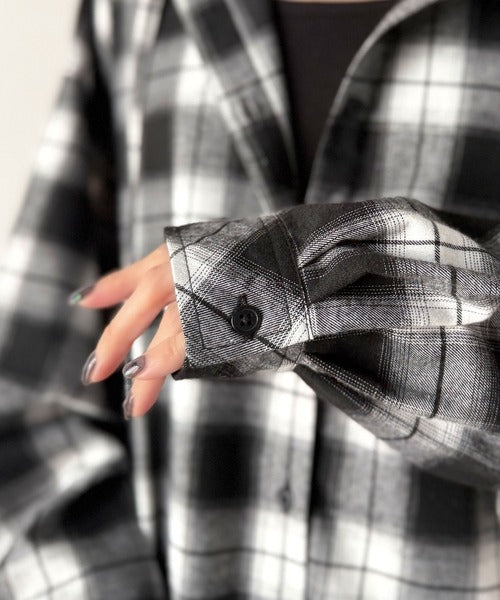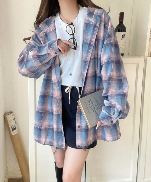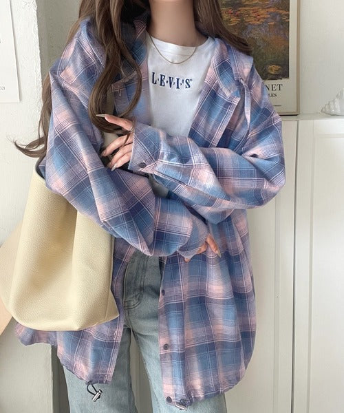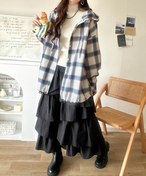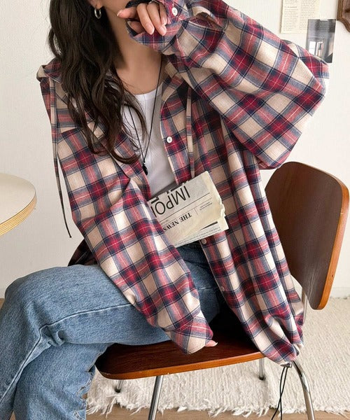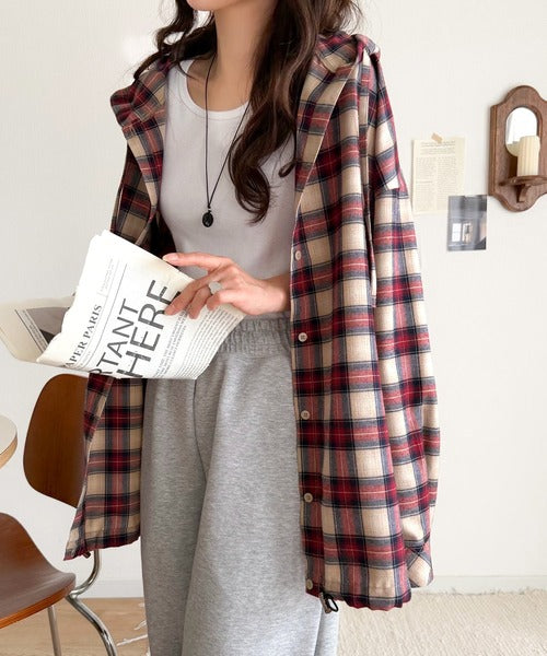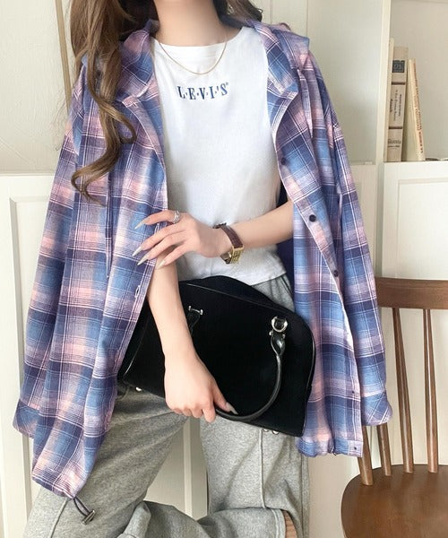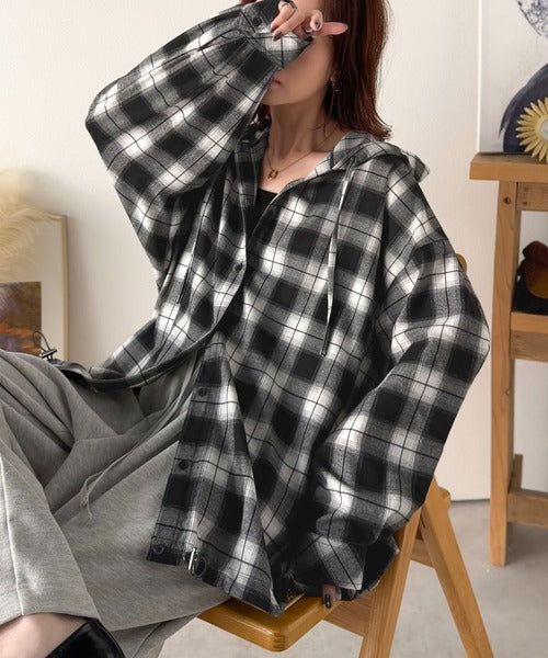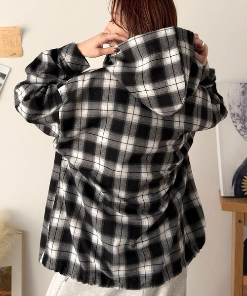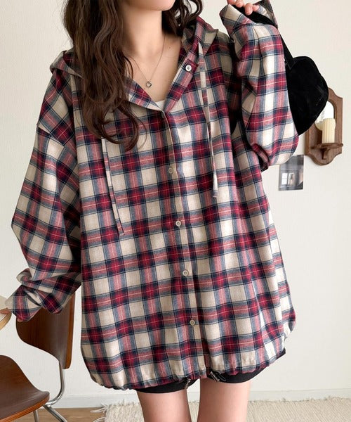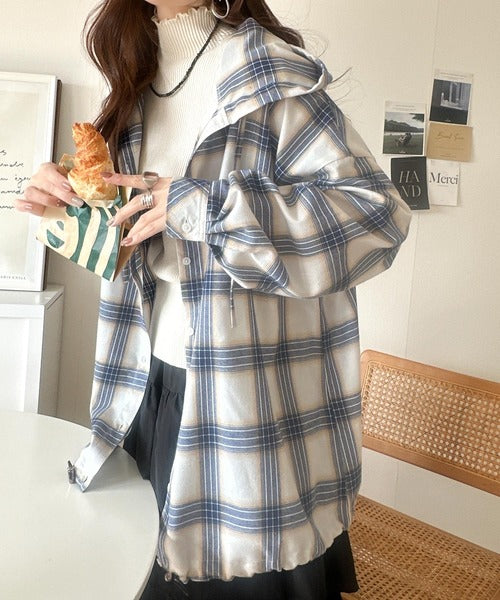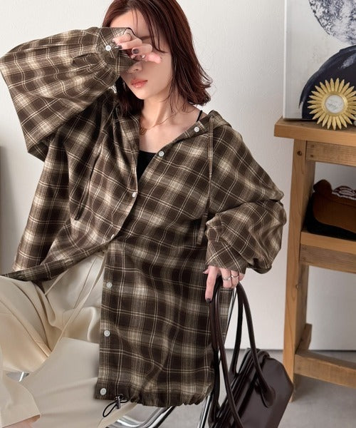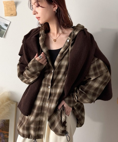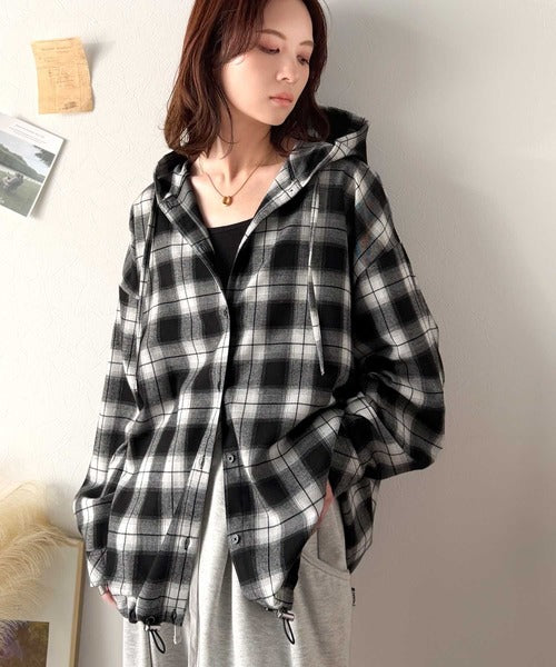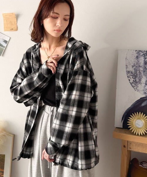 ゆるっと羽織ってかわいくキマる。”旬顔” 裾ドロスト微起毛チェック柄オーバーサイズシャツパーカー ce1010568