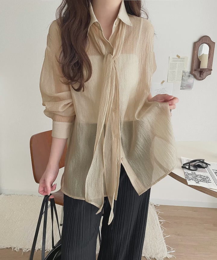 このリボンタイ付きシアーシャツは、まさに春夏を彩る一枚。