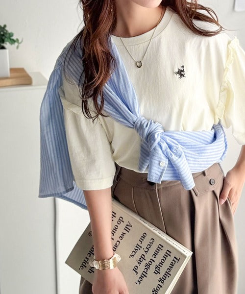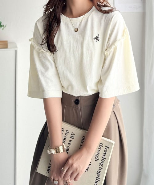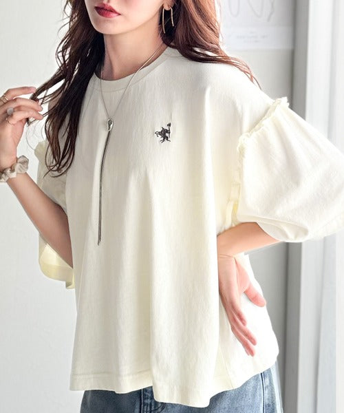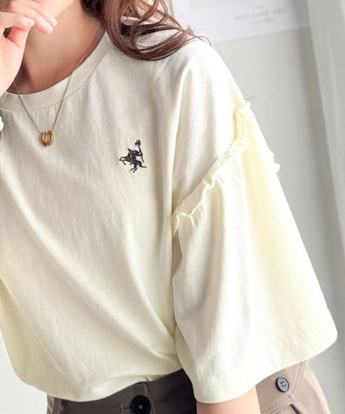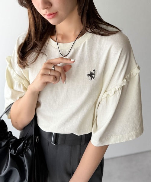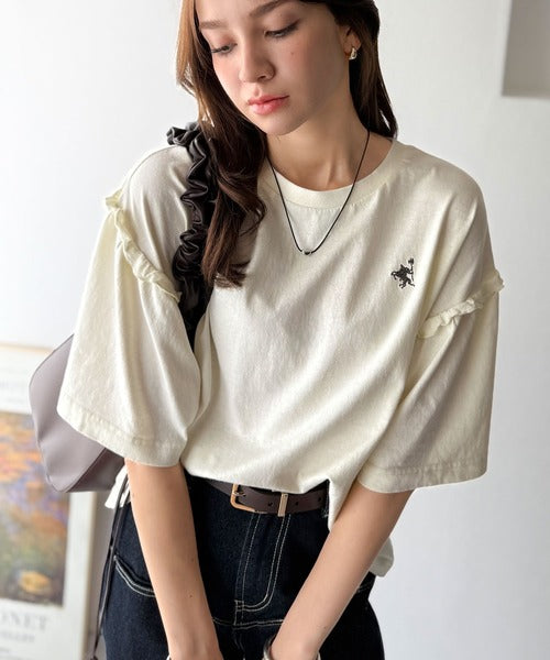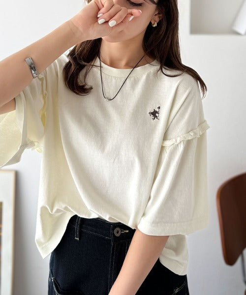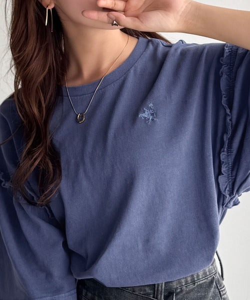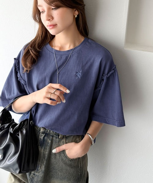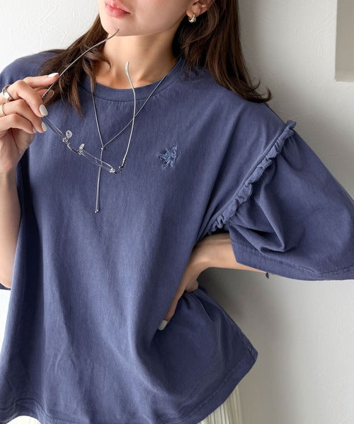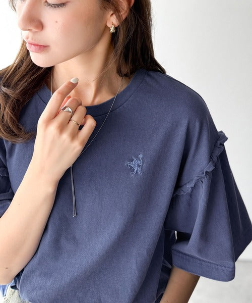 さらり着やすく、ほどよくキュート。なんでもない日にひとさじの甘さを。綿100%胸刺繍ピグメント袖フリルT ce1020330
