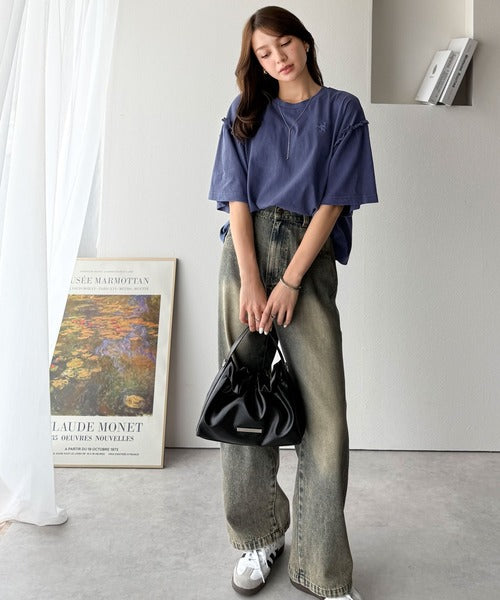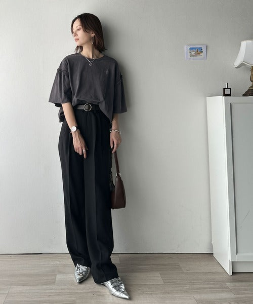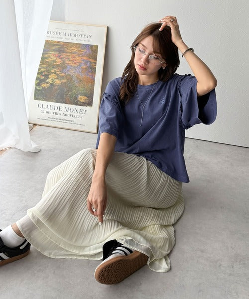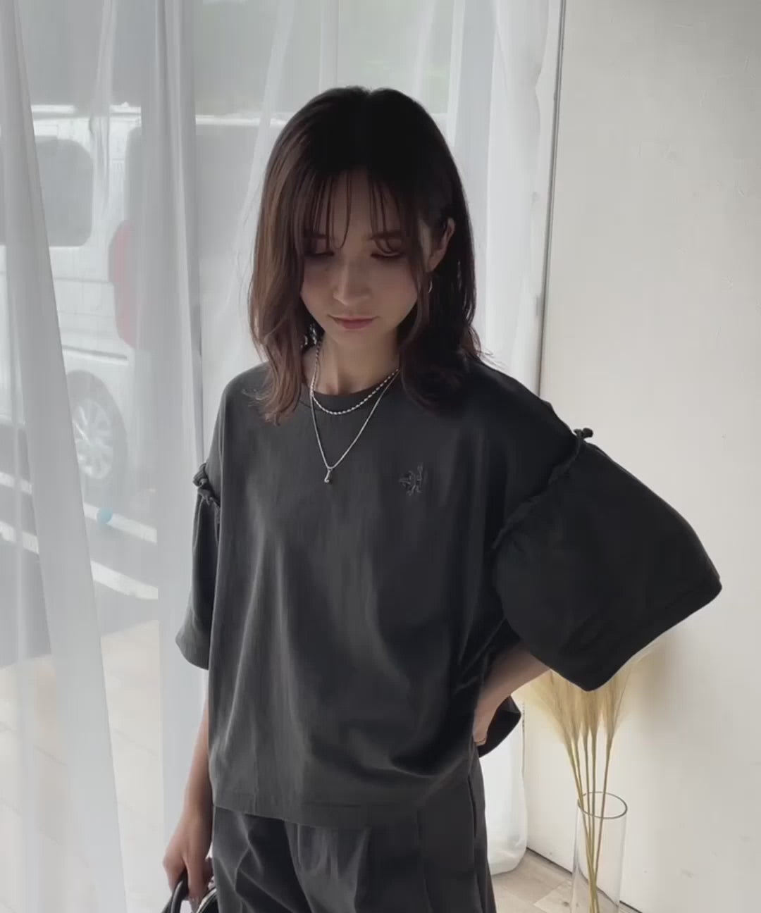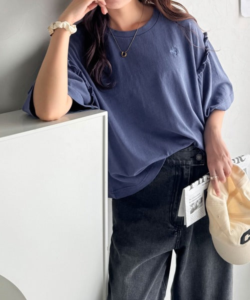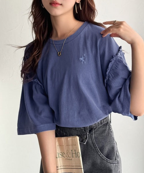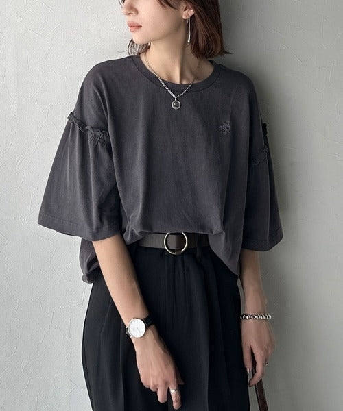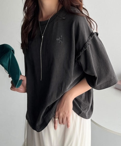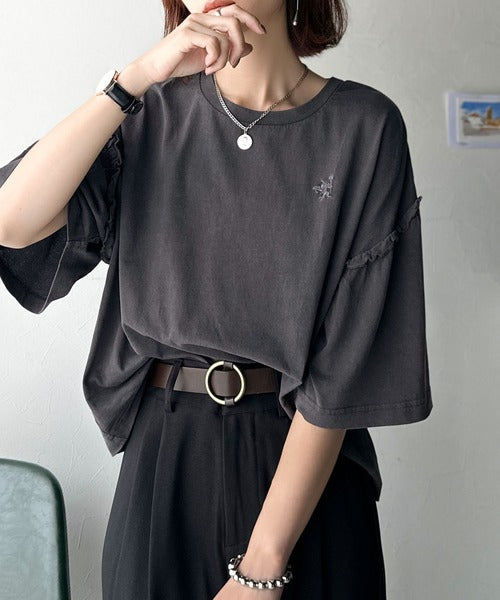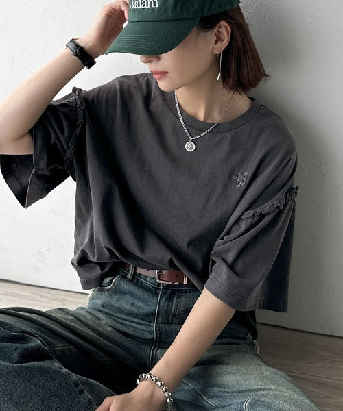 ユーズド感のあるピグメント加工が特徴のTシャツに、袖のフリルでフェミニンな要素をプラス。