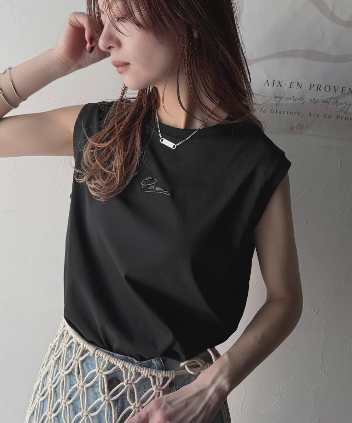 接触冷感♪大人カジュアルを格上げ!胸元ワンポイント刺繍ノースリーブトップ ce1050275