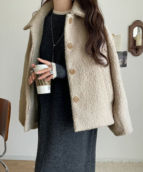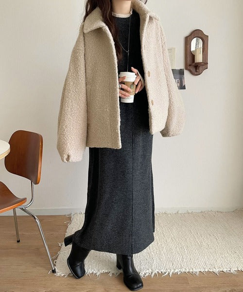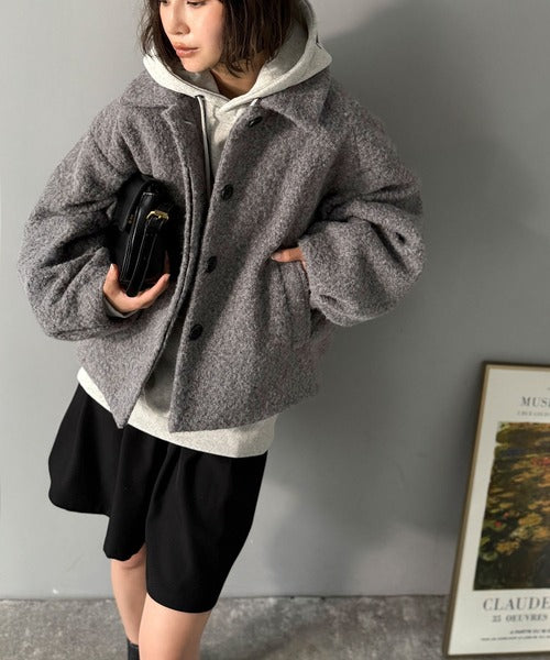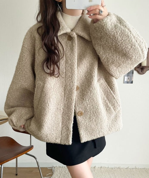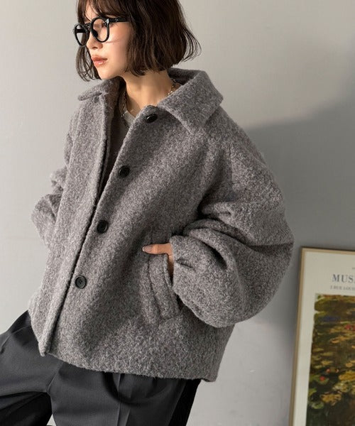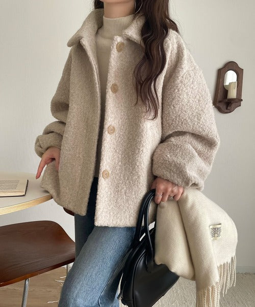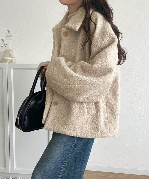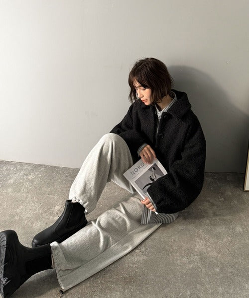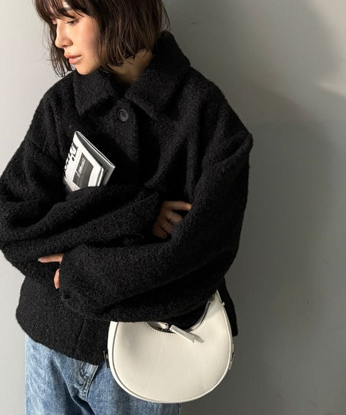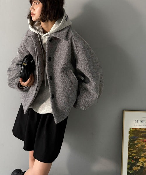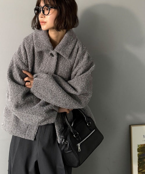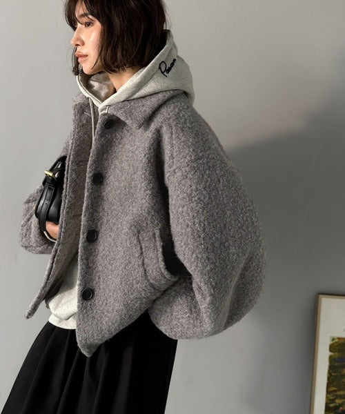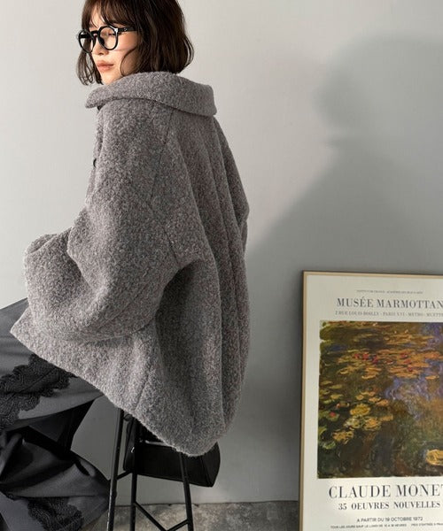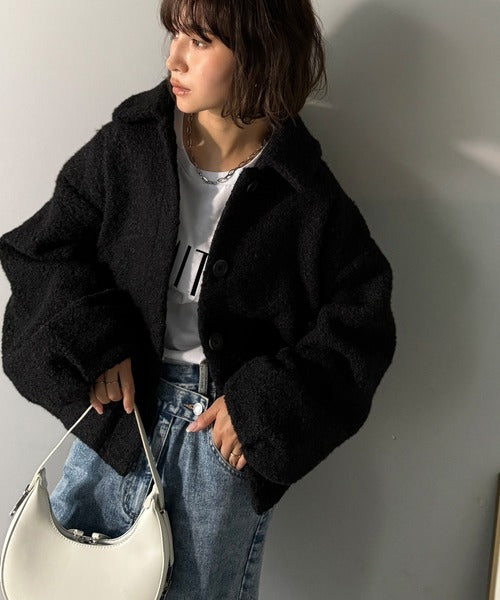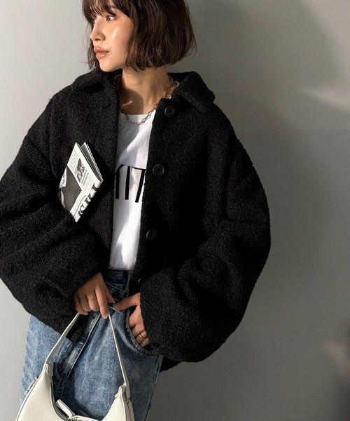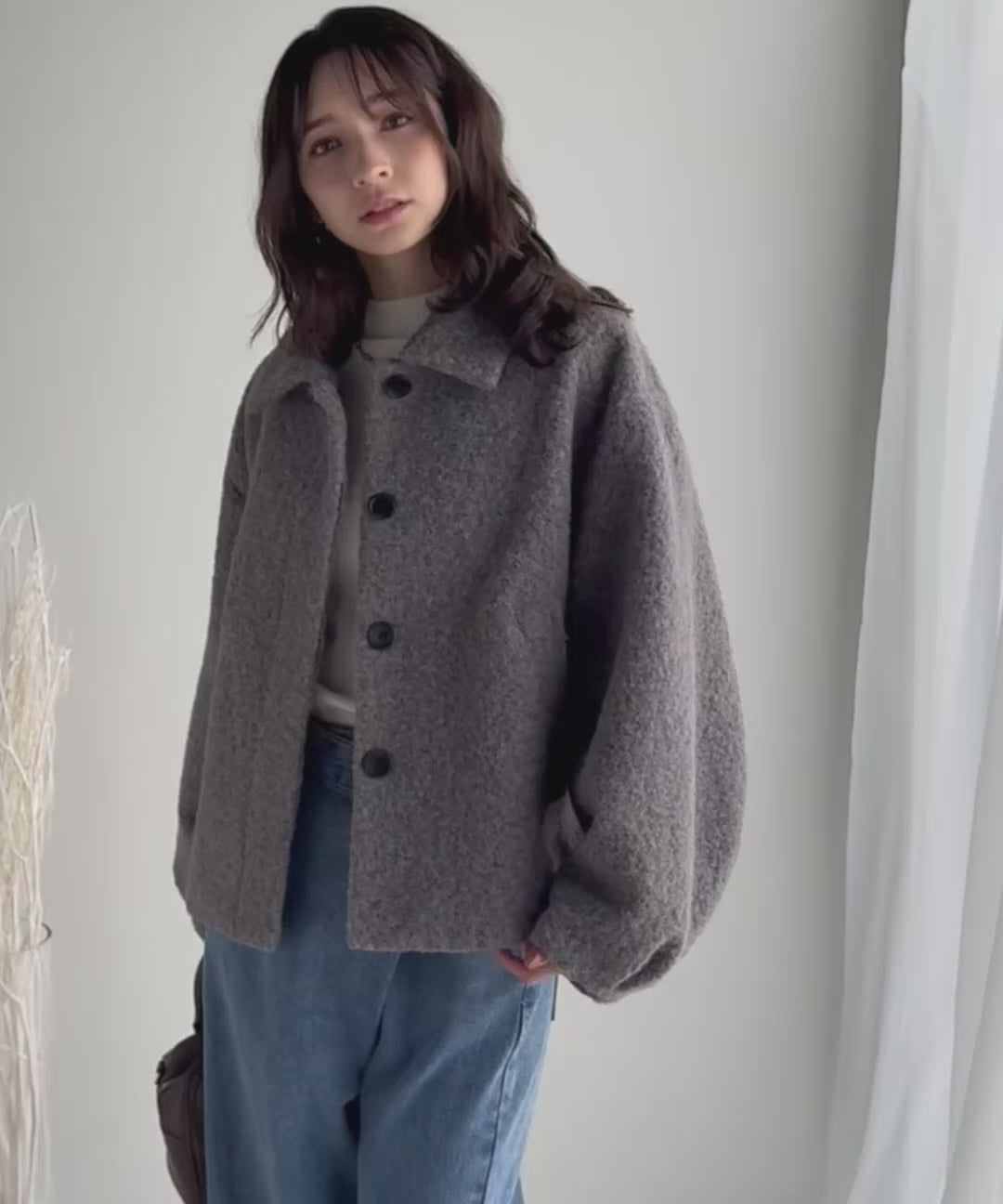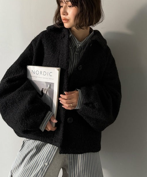 襟付きのボアジャケットは、ボリュームスリーブと丸みのあるコクーンシルエットが特徴。