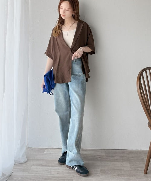 ベーシックシンンプルデザインなのでどんなボトムスにも合わせやすくサマージャケット風に羽織りとしても使えて