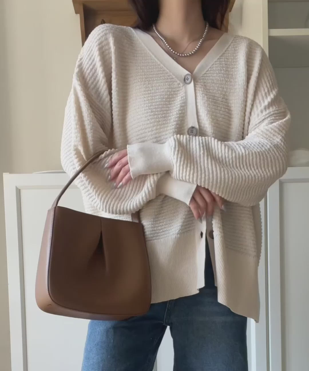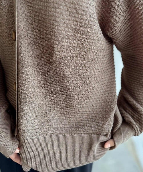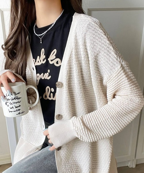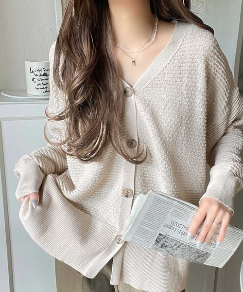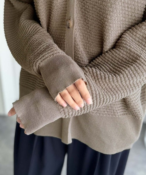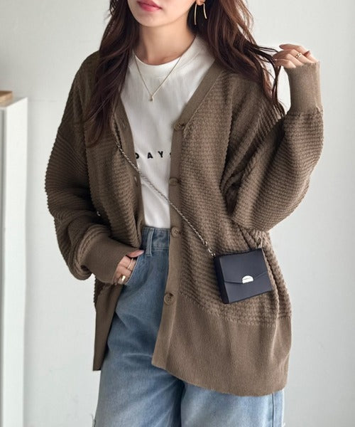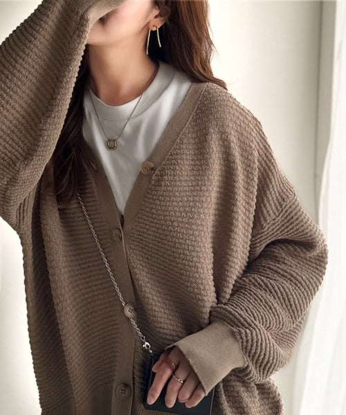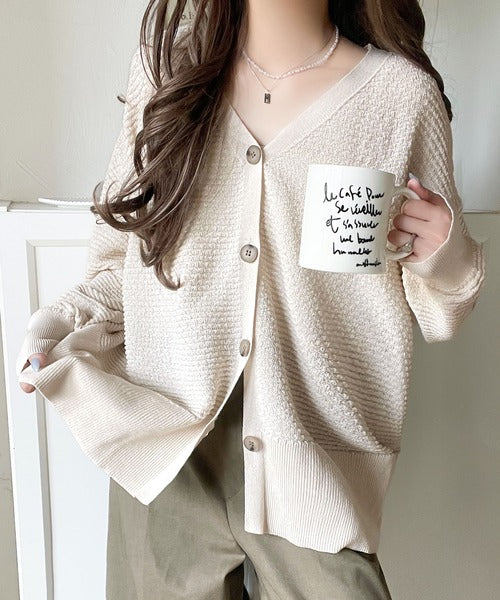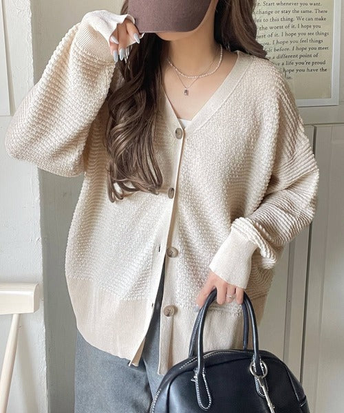 立体感のあるブークレ編みが印象的なニットカーディガン。