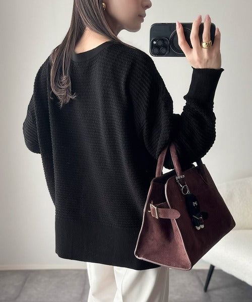 リネンタッチで適度なシャリ感のあるブークレ糸を使用し、凹凸感のある編地に編み上げました。