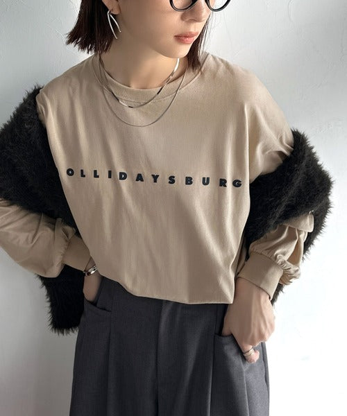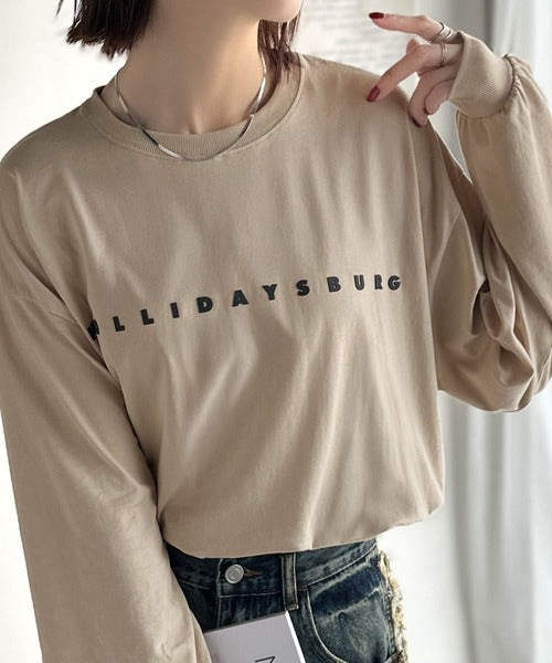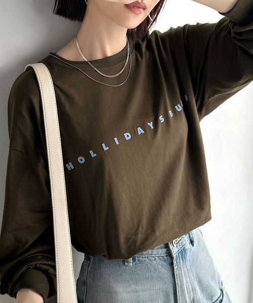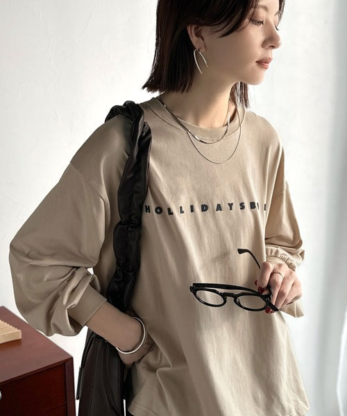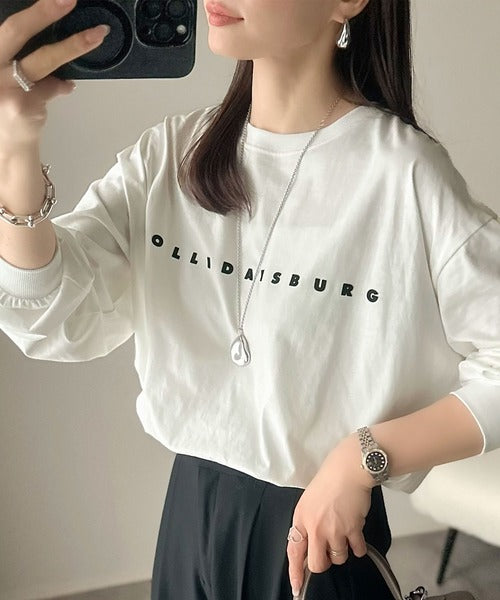 大人の上品カジュアルを楽しむ。ゆったりシルエット 綿100%シルケット風シンプル英字ロゴTシャツ(長袖) ce1330048