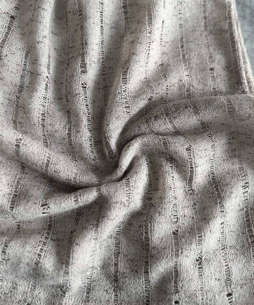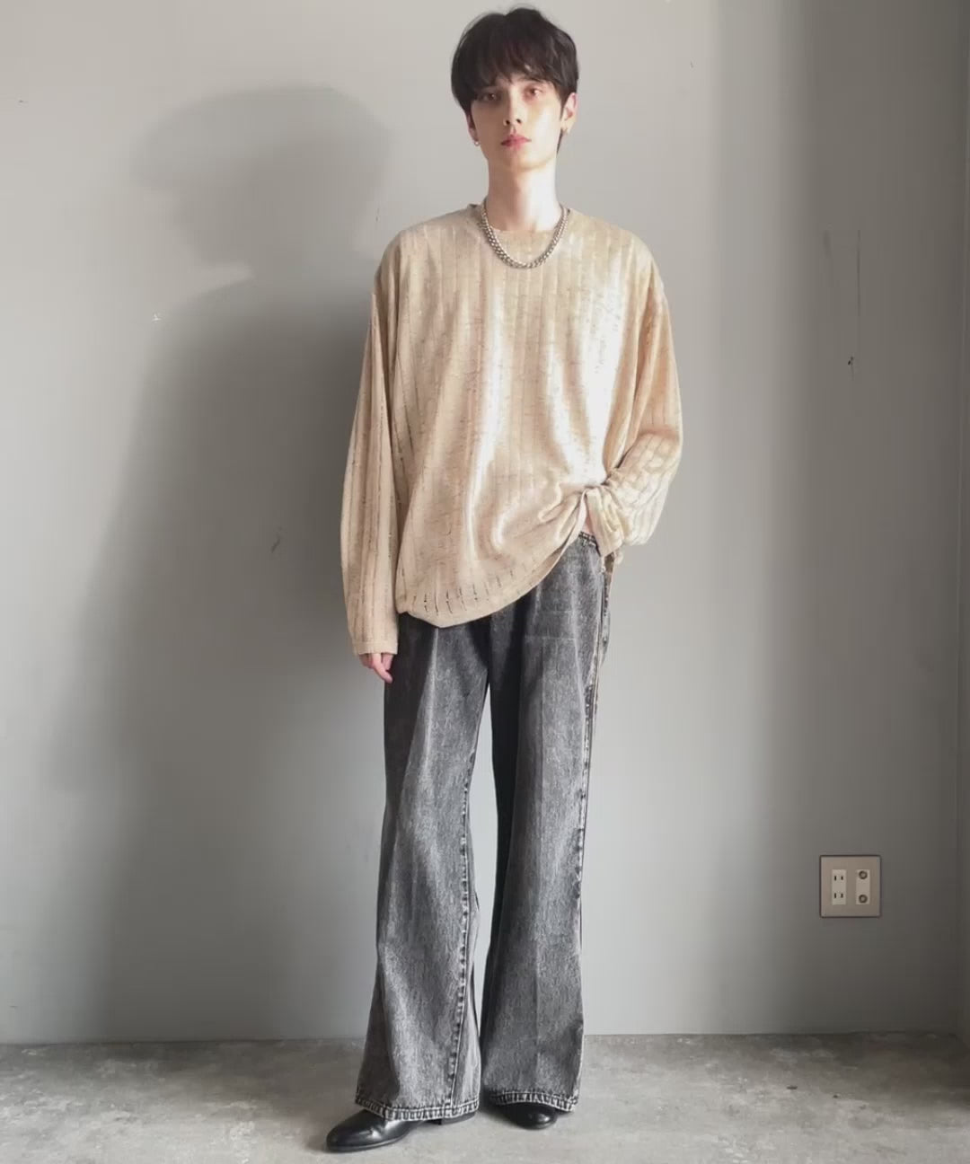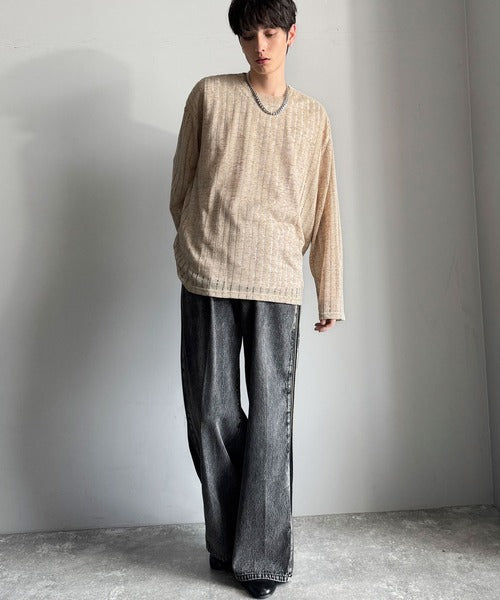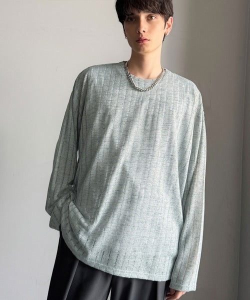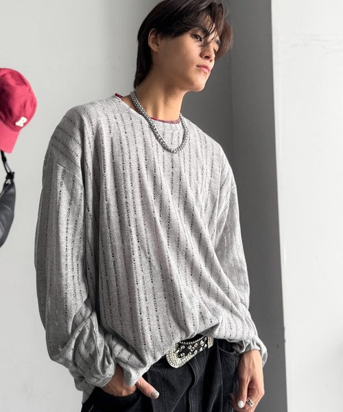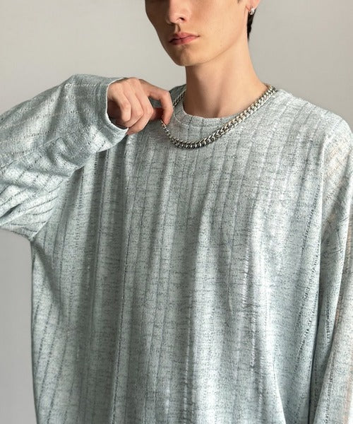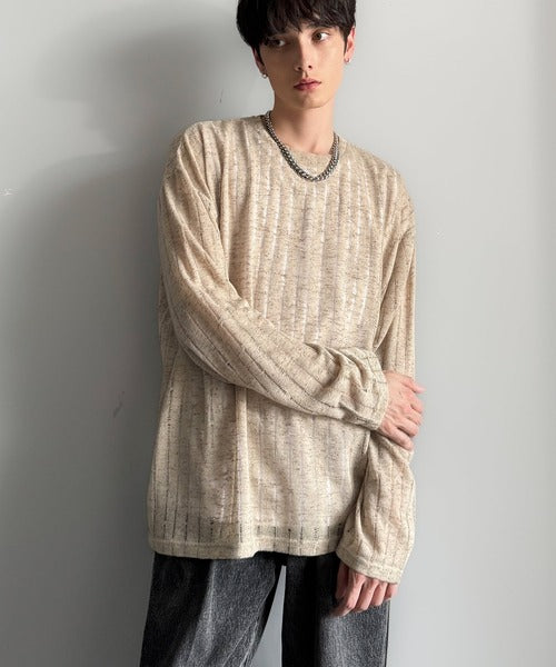 ダメージ加工が施されたクルーネックプルオーバーは、柔らかく透け感のあるシアーニット素材を使用し、