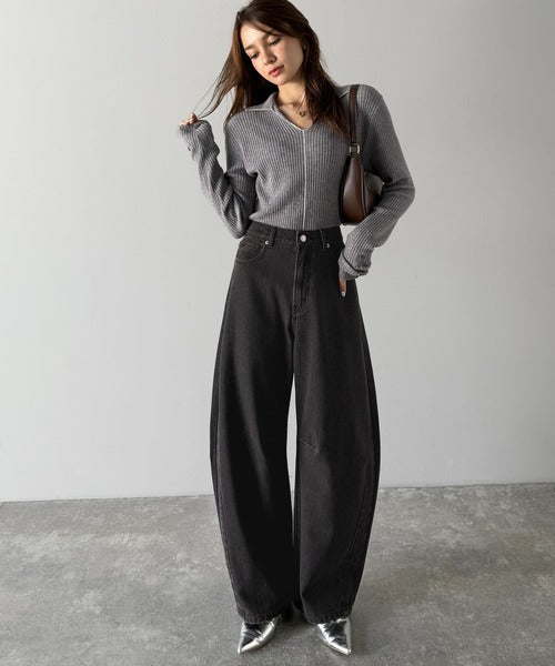 肌寒い季節には、ジップパーカーやニットを合わせて、リラックス感のあるカジュアルコーデに。