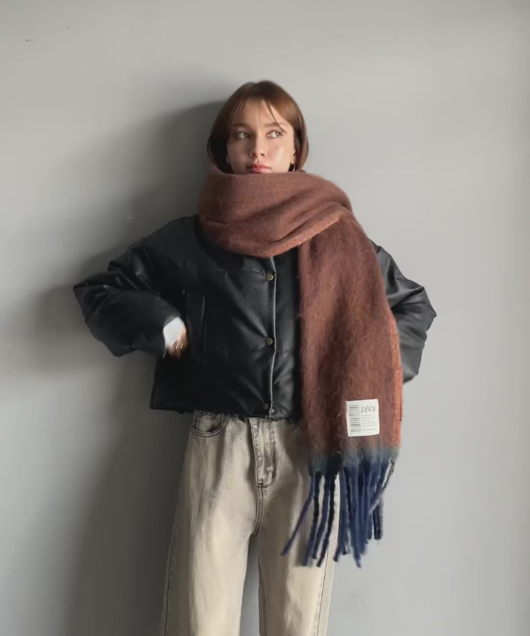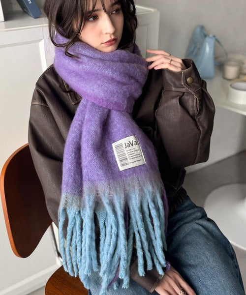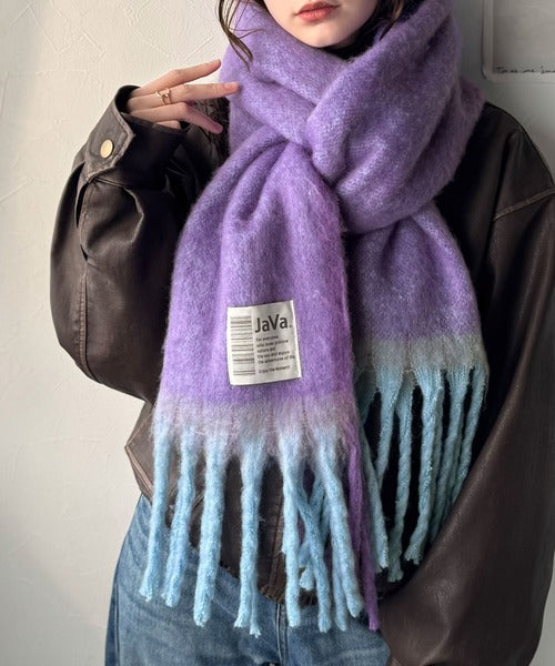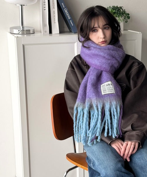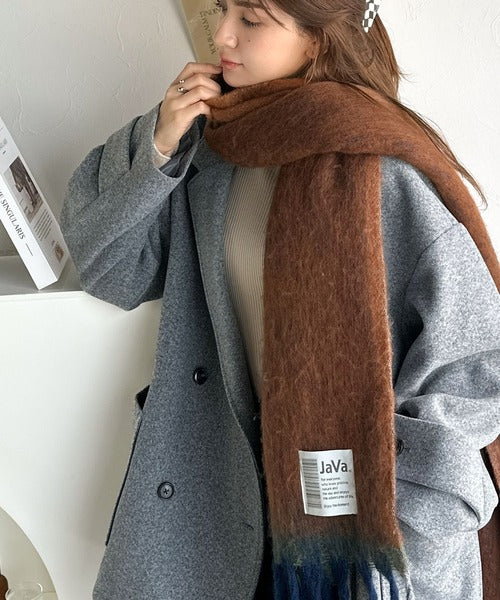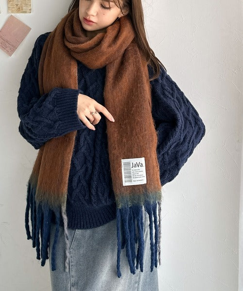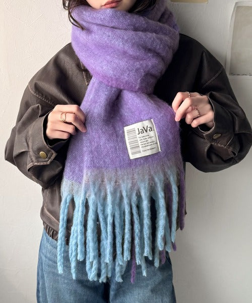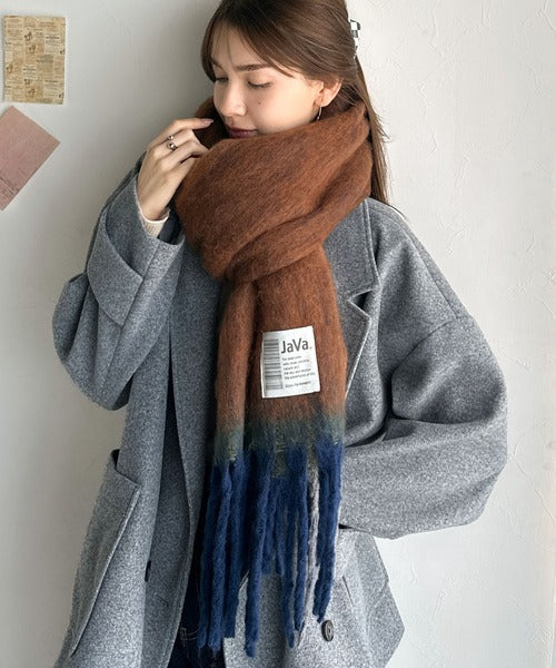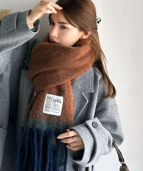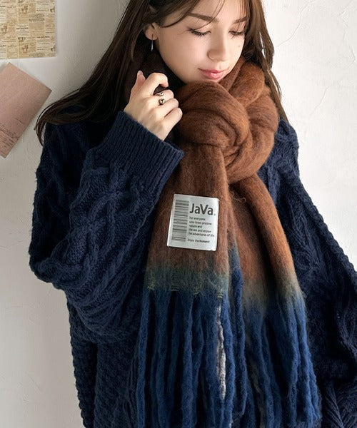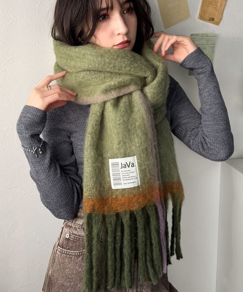 大人カラーと太めのフリンジ、JaVaのタグがポイントの大判ストールは、
