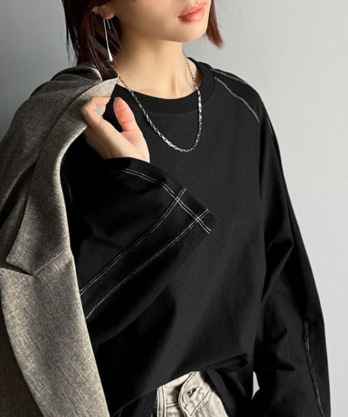 体のラインを拾いにくい、ゆったりシルエットのカットソー。