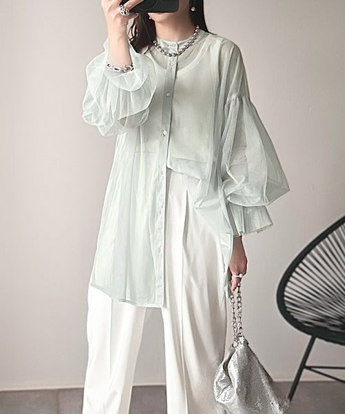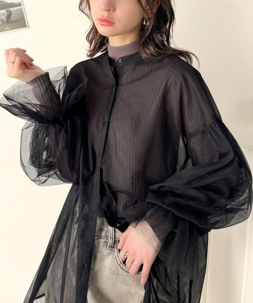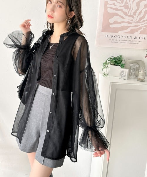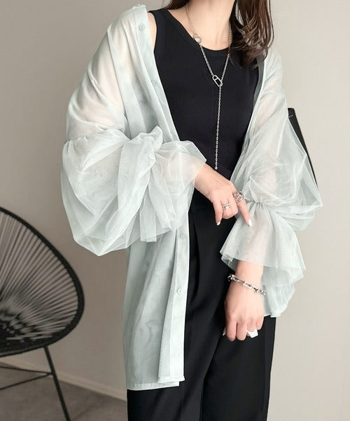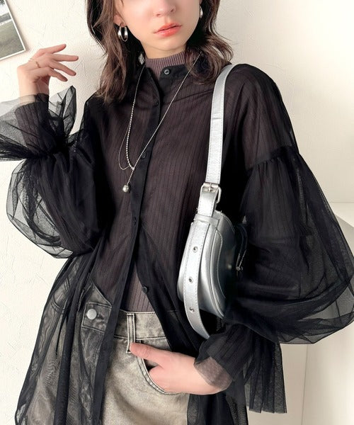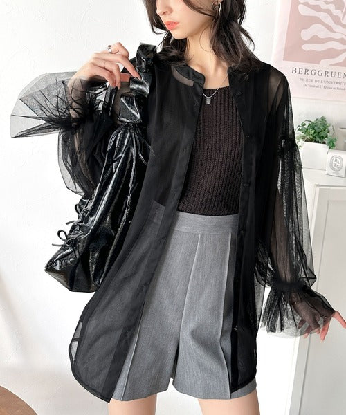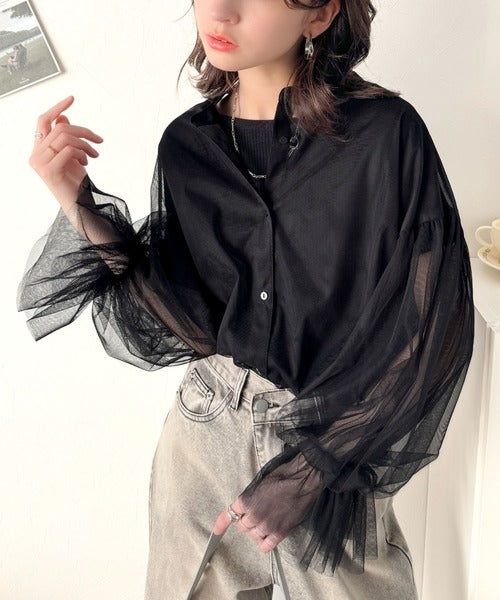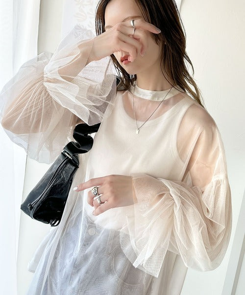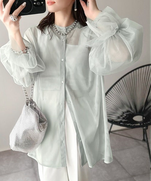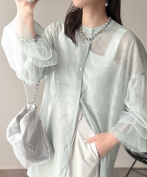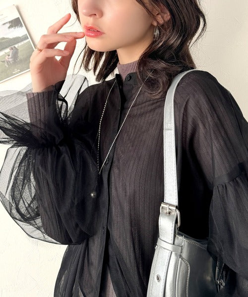 エレガントなシアー素材が大人の魅力を引き立てる。前後2wayフリル袖チュールレイヤードシャツ(長袖) ce1010372